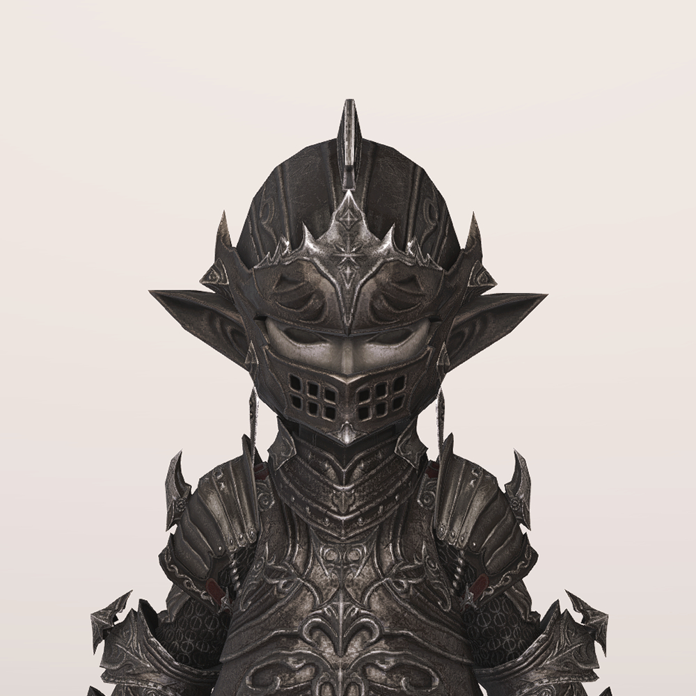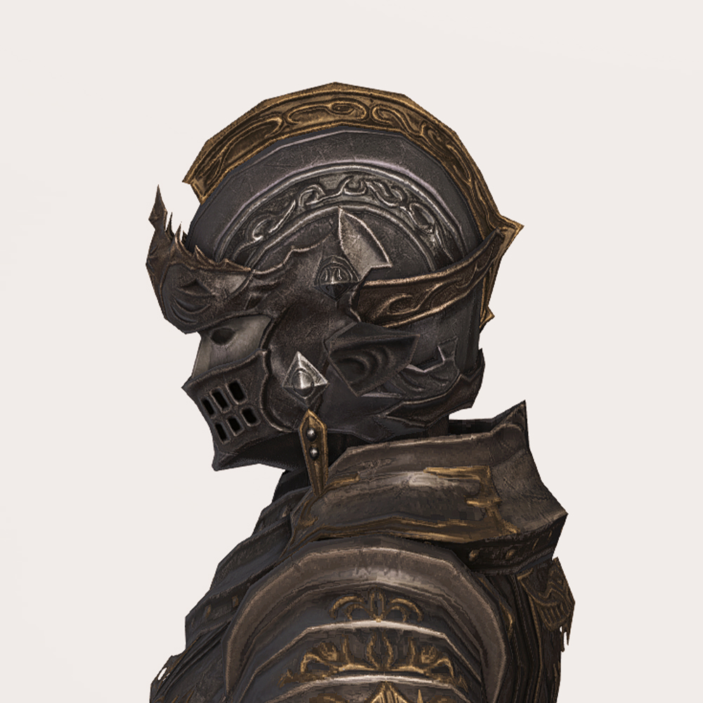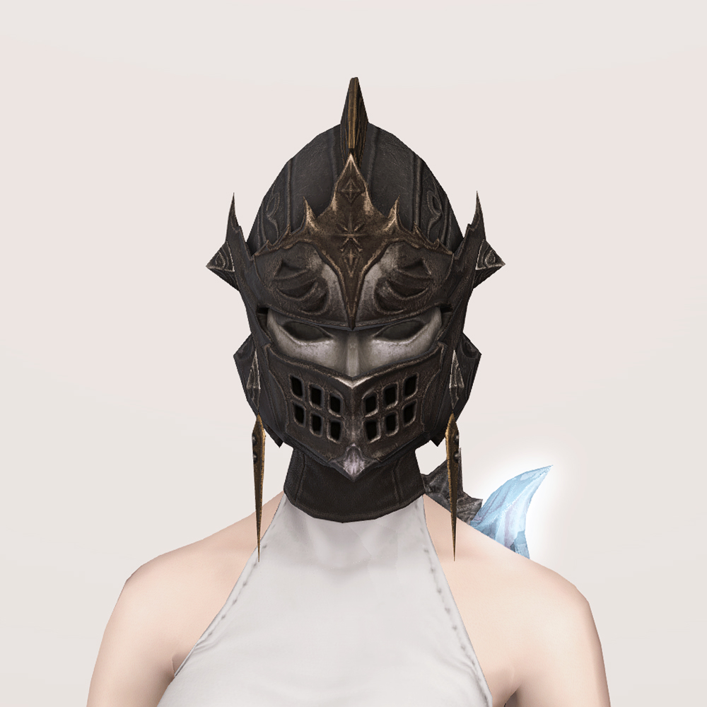 머리 전체를 빠짐없이 단단하게 보호하는 투구입니다. 눈과 입 부분까지 완전히 덮는 외형으로, 어두운 색상과 투박한 양각이 묵직한 중갑의 느낌을 줍니다. 녹슨 듯한 거친 질감이 투구에 오래된 느낌을 더해주며, 빛바랜 흑색의 외관과 합쳐져 음울하고 고전적인 분위기를 살리기 좋습니다.