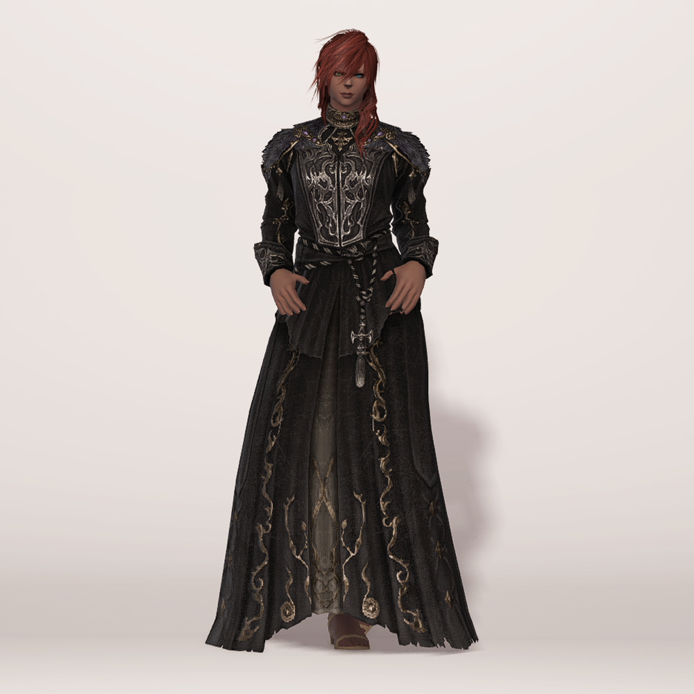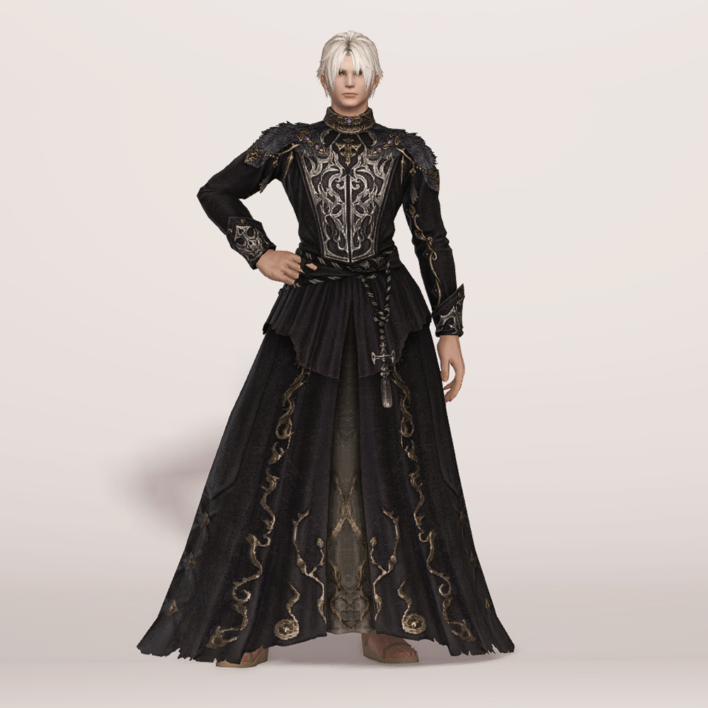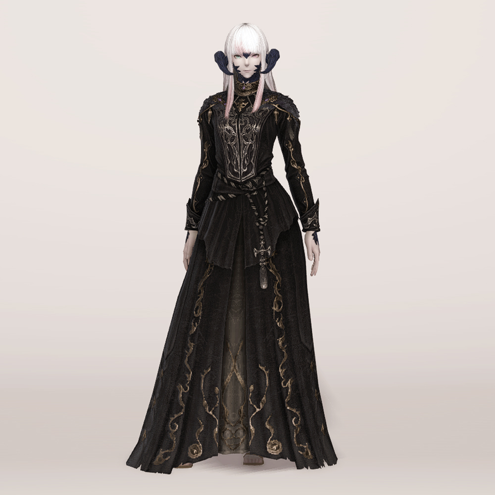 화려한 가슴 장식과 곳곳의 금장 디테일이 눈에 띄는 벨벳 재질의 로브드레스입니다. 로브 드레스에 허리 천을 둘러 허리끈으로 고정시킨 형태의 핏이 좋은 외투로 지금까지 파판14에서 보기 힘들었던 과한 부분 없는 화려한 드레스 디자인으로 섬네일 촬영시 흑마 90잡룩 아이템 손과 매치하였으나 다른 레벨의 흑마 잡룩이나, 세련된 장식의 에덴의 외침/합장 마술사 모자를 매치하여 부드러우나 고급스러운 느낌을 더하는 것도 추천드립니다.