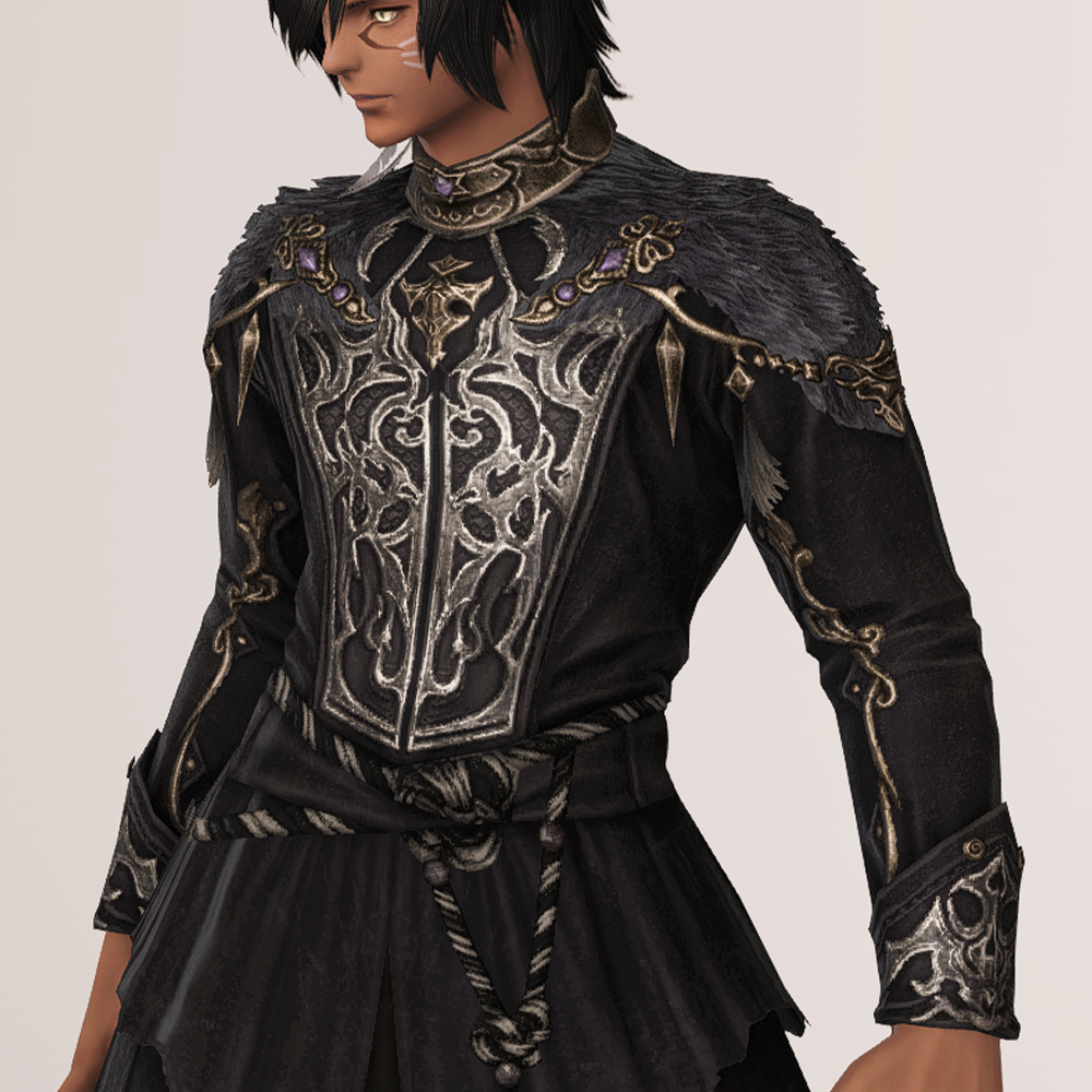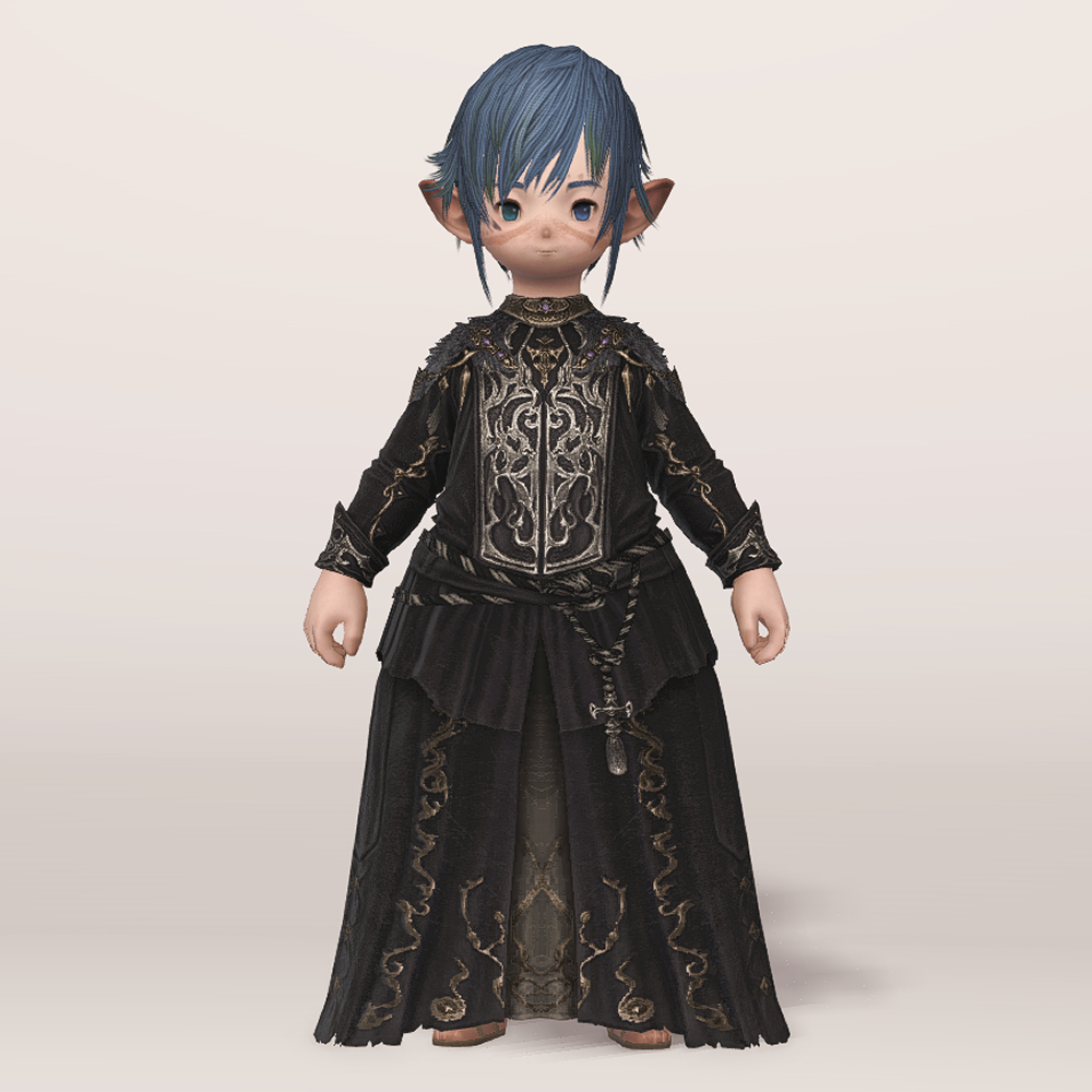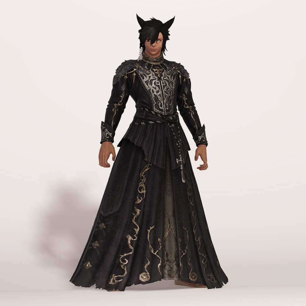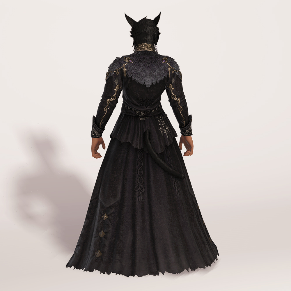 화려한 가슴 장식과 곳곳의 금장 디테일이 눈에 띄는 벨벳 재질의 로브드레스입니다. 로브 드레스에 허리 천을 둘러 허리끈으로 고정시킨 형태의 핏이 좋은 외투로 지금까지 파판14에서 보기 힘들었던 과한 부분 없는 화려한 드레스 디자인으로 섬네일 촬영시 흑마 90잡룩 아이템 손과 매치하였으나 다른 레벨의 흑마 잡룩이나, 세련된 장식의 에덴의 외침/합장 마술사 모자를 매치하여 부드러우나 고급스러운 느낌을 더하는 것도 추천드립니다.