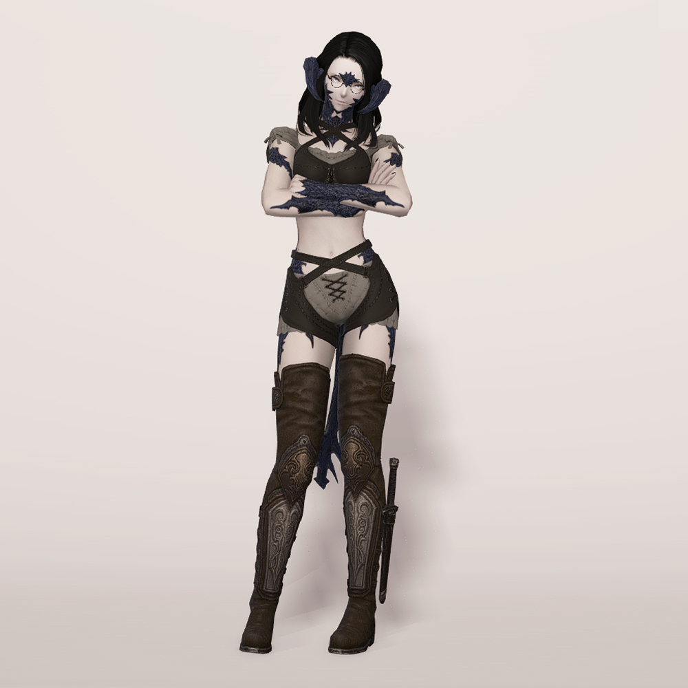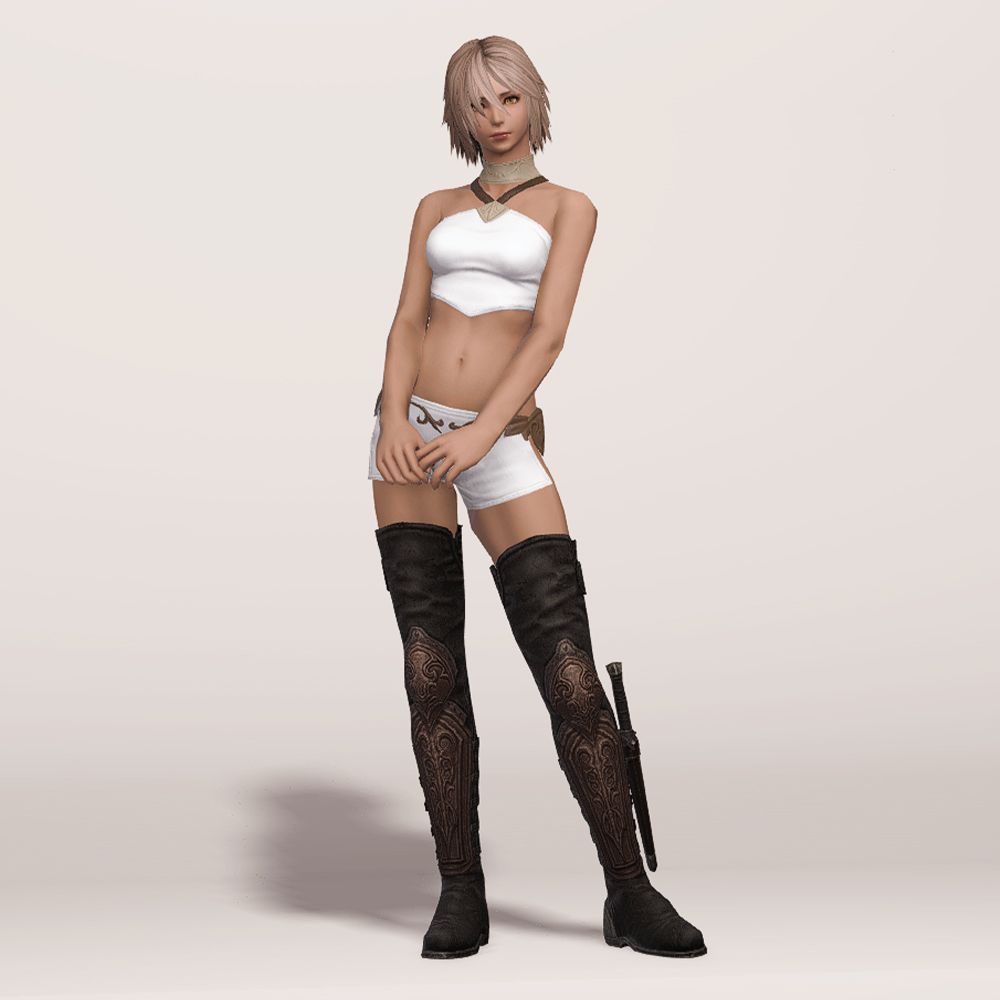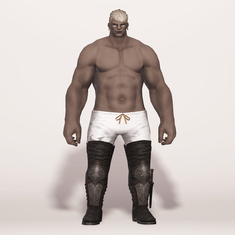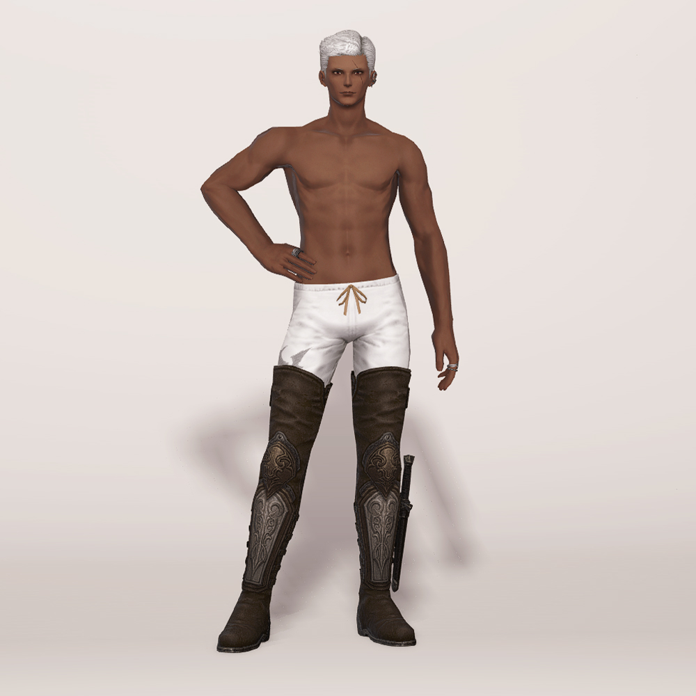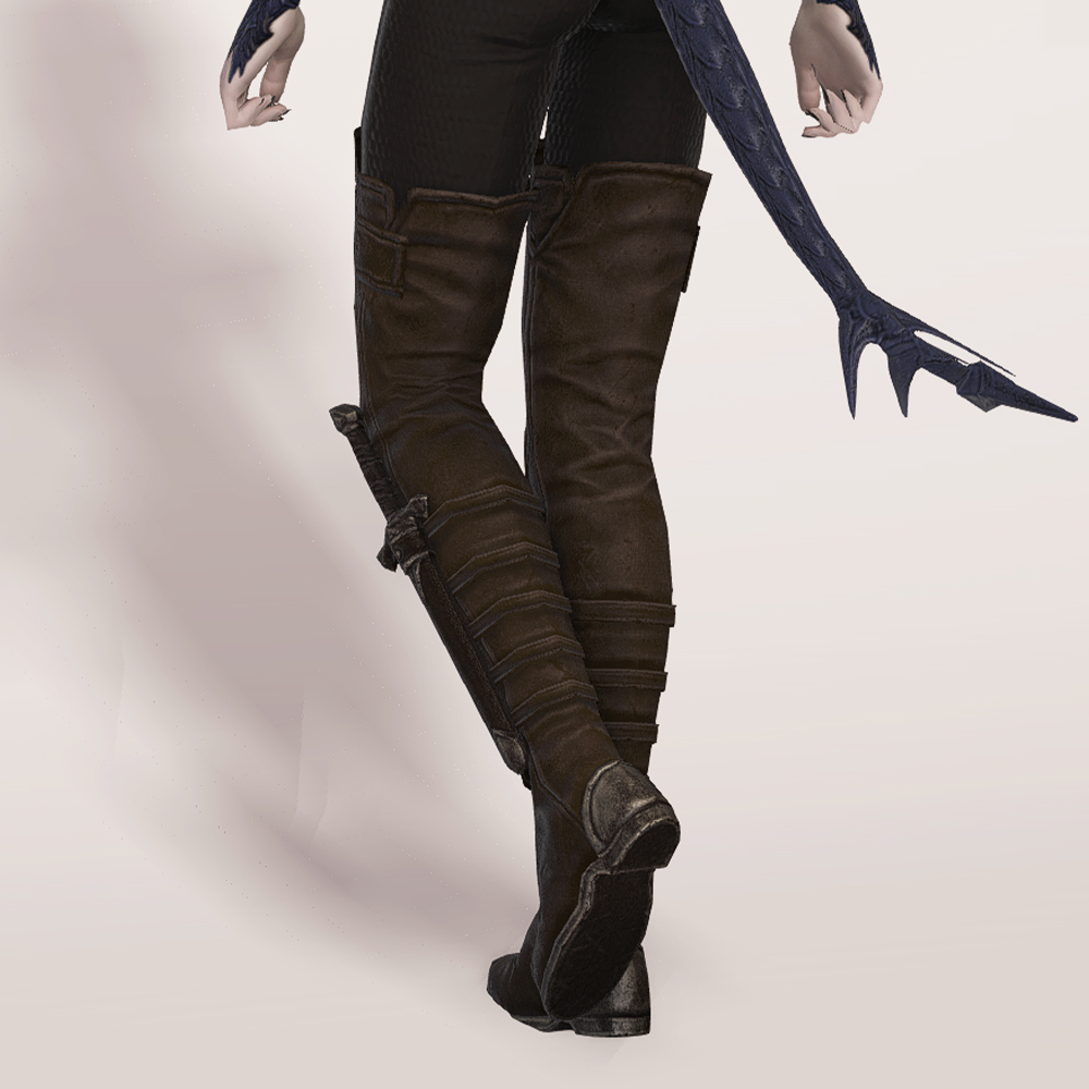 슬림한 핏의 허벅지장화가 취향이라면 주목해 볼 만한 아이템입니다. 다리를 착 감싸는 가죽부츠에 섬세한 문양이 양각된 금속 무릎보호대와 정강이받이로 포인트를 주었습니다. 앞모습도 독특한 매력이 있지만 뒤를 돌았을 때 드러나는 가죽 스트랩과 발뒤꿈치의 금속징에도 심플한 멋이 있어 여러모로 디테일에 신경썼다는 인상이 드는 신발입니다. 신이슈가르드 상의처럼 가죽 장식이 깔끔하게 들어간 옷과 매치해보는 것은 어떨까요?