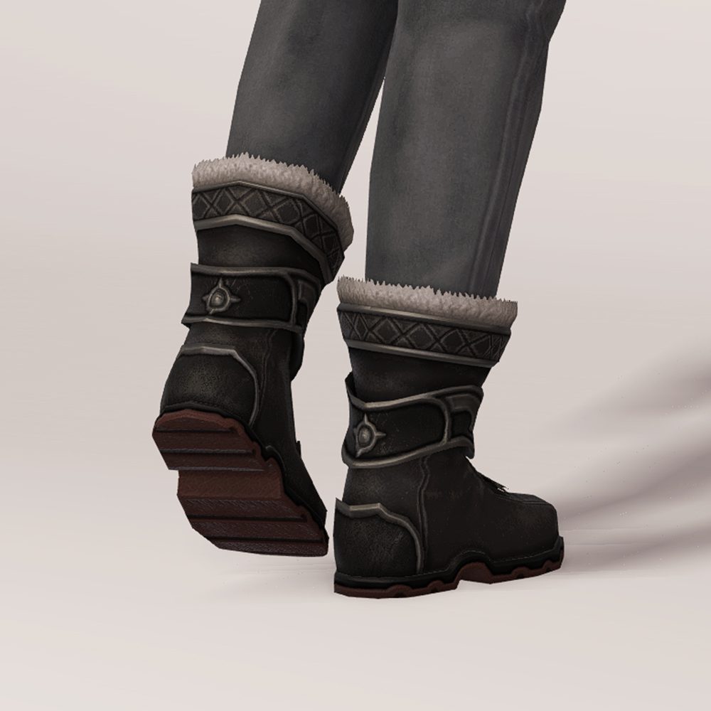 어그 부츠에 비해 깔끔하고 절도 있는 디자인이 특징인 가죽 앵클부츠입니다. 발목에 털 장식을 둘러줬으나 타직업군에 비해서는 빈약한 편으로 안감에 털이 있는 것이 아닌 이상 추운 갈레말 제국에서 살아남기 어려워 보입니다. 발목 안쪽에 장식된 금속 단추 디테일이 부츠의 단정함과 맵시를 살려주며, 앞코에서부터 이어지는 세로선 또한 부츠를 한결 슬림해 보이게 만들어줘 매력적입니다.