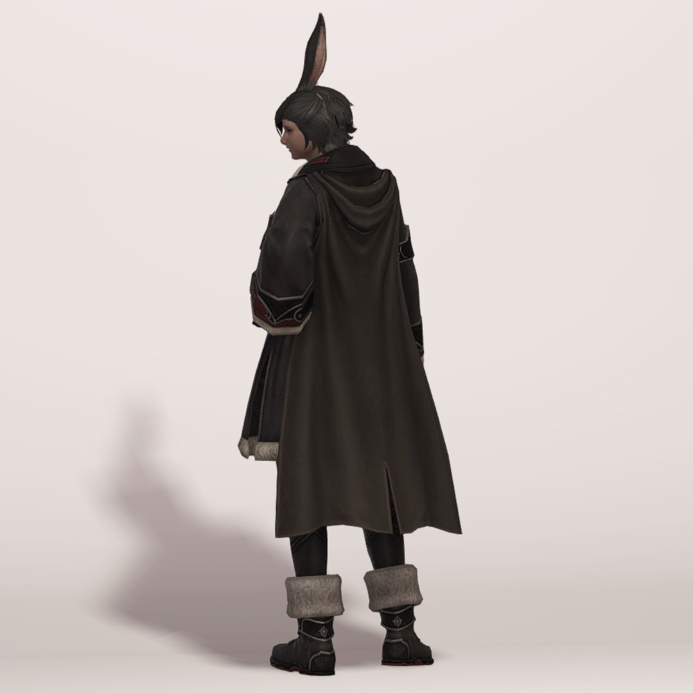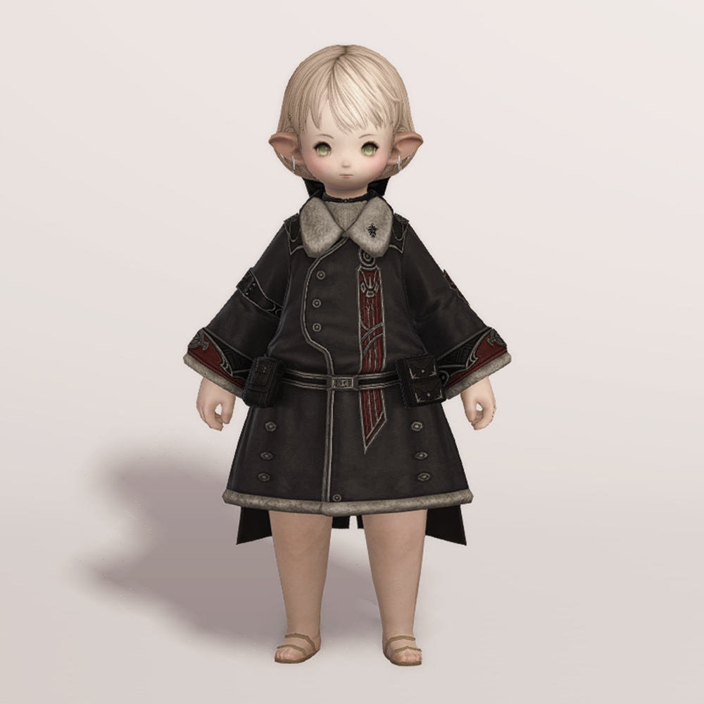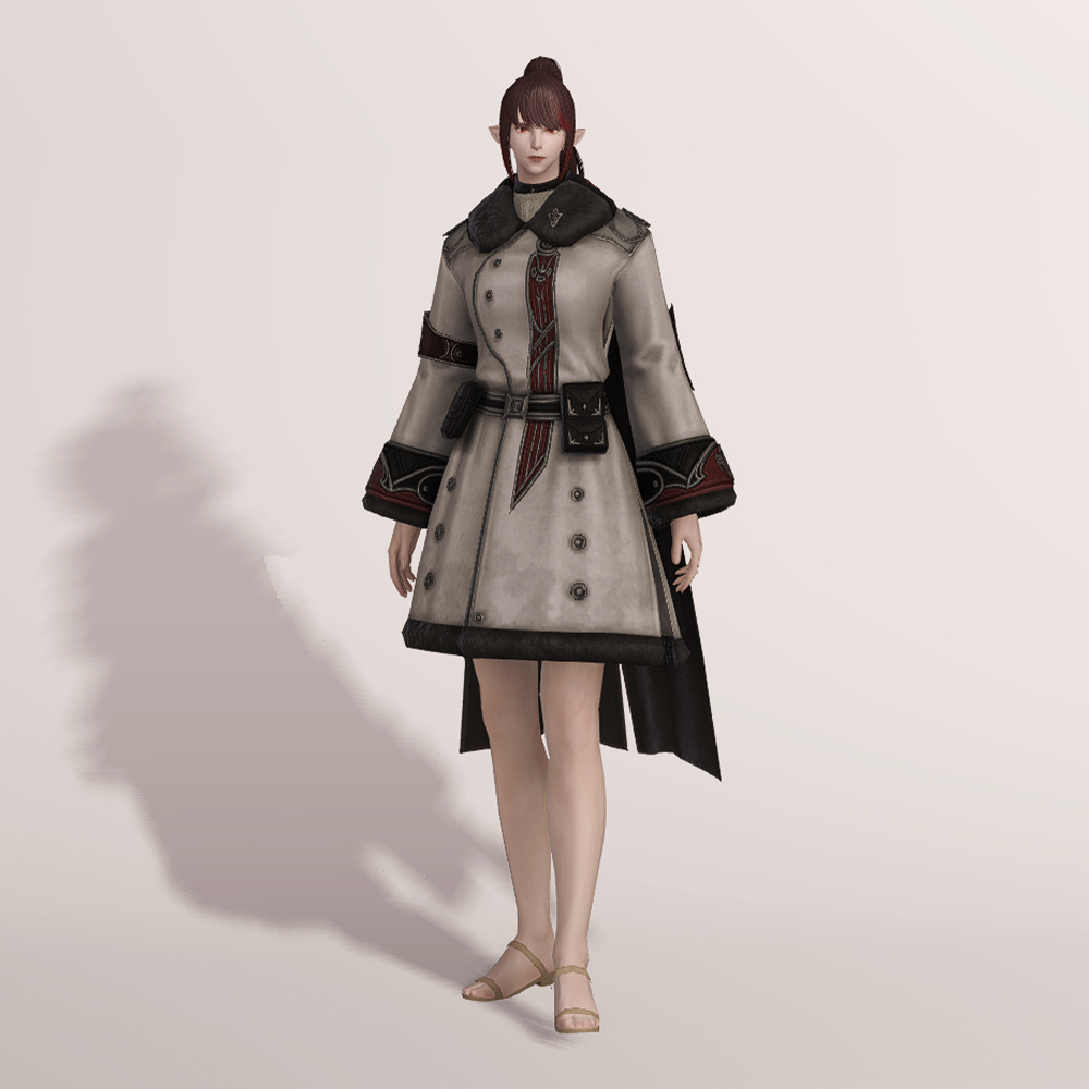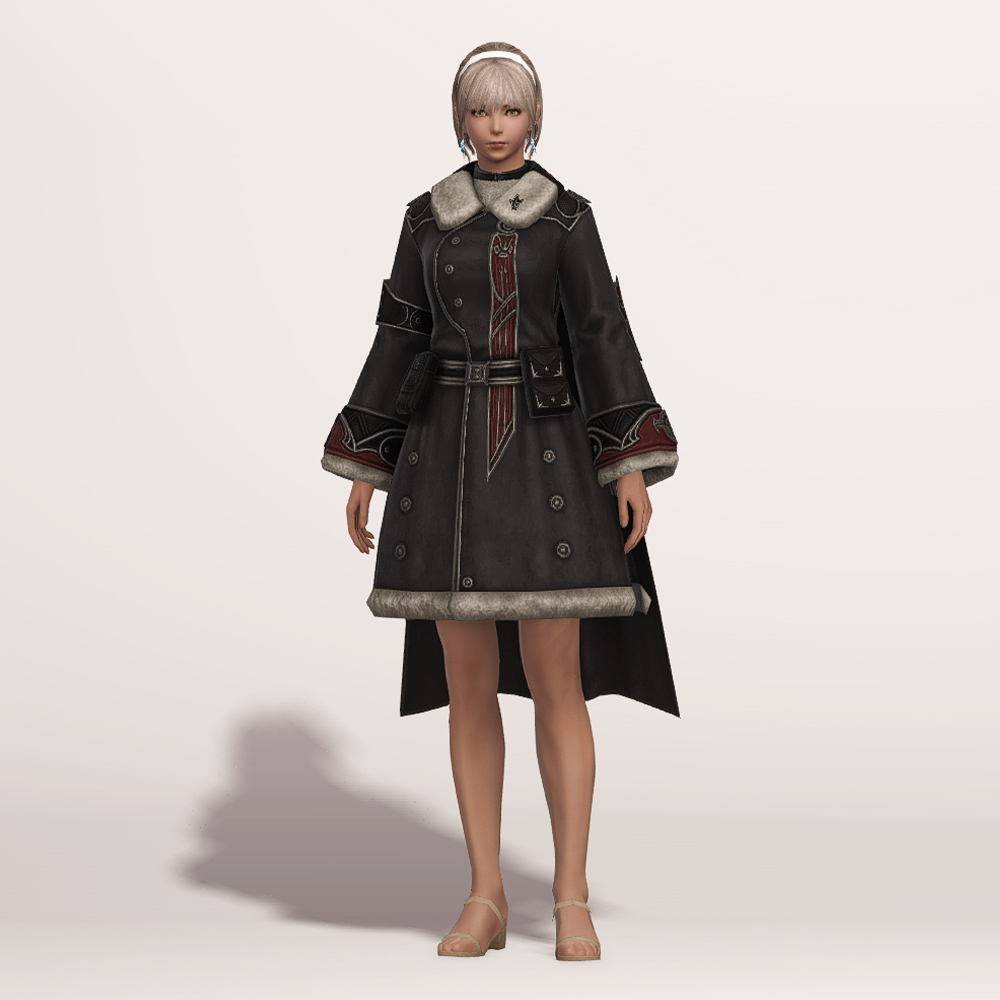 두께감 있는 소재와 털장식으로 방한복 느낌을 살리면서도 똑 떨어지는 A라인 핏과 망토로 중후함을 덜어낸 코트입니다. 얇게 펄럭이는 망토가 달려 있음에도 벨트로 허리선을 잡아주고 휘장은 자수로 대신하여 단정하고 깔끔한 분위기가 살아납니다. 기장이나 핏을 고려하면 슬림한 체형의 종족이 입었을 때 특히 맵시가 예쁜 편이며 외투 기장과 비슷하거나 짧은 길이의 스커트와 매치해도 잘 어울립니다. 제국 치유사 외투와 외형이 같으나 흑백이 반전된 색상입니다.