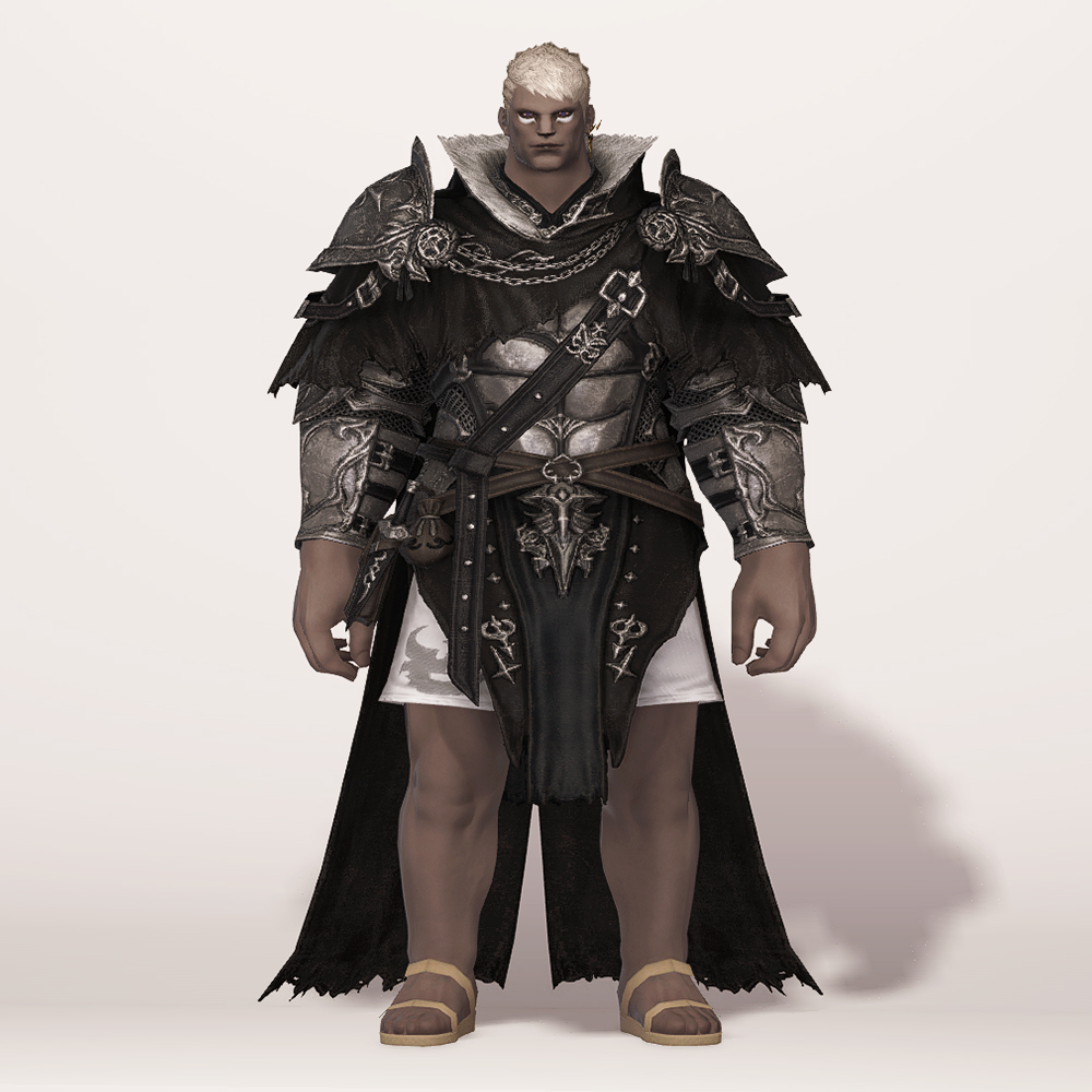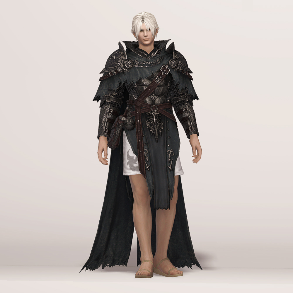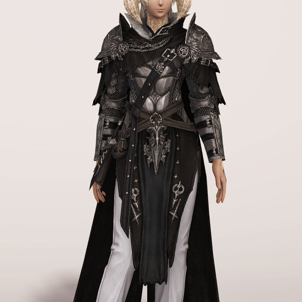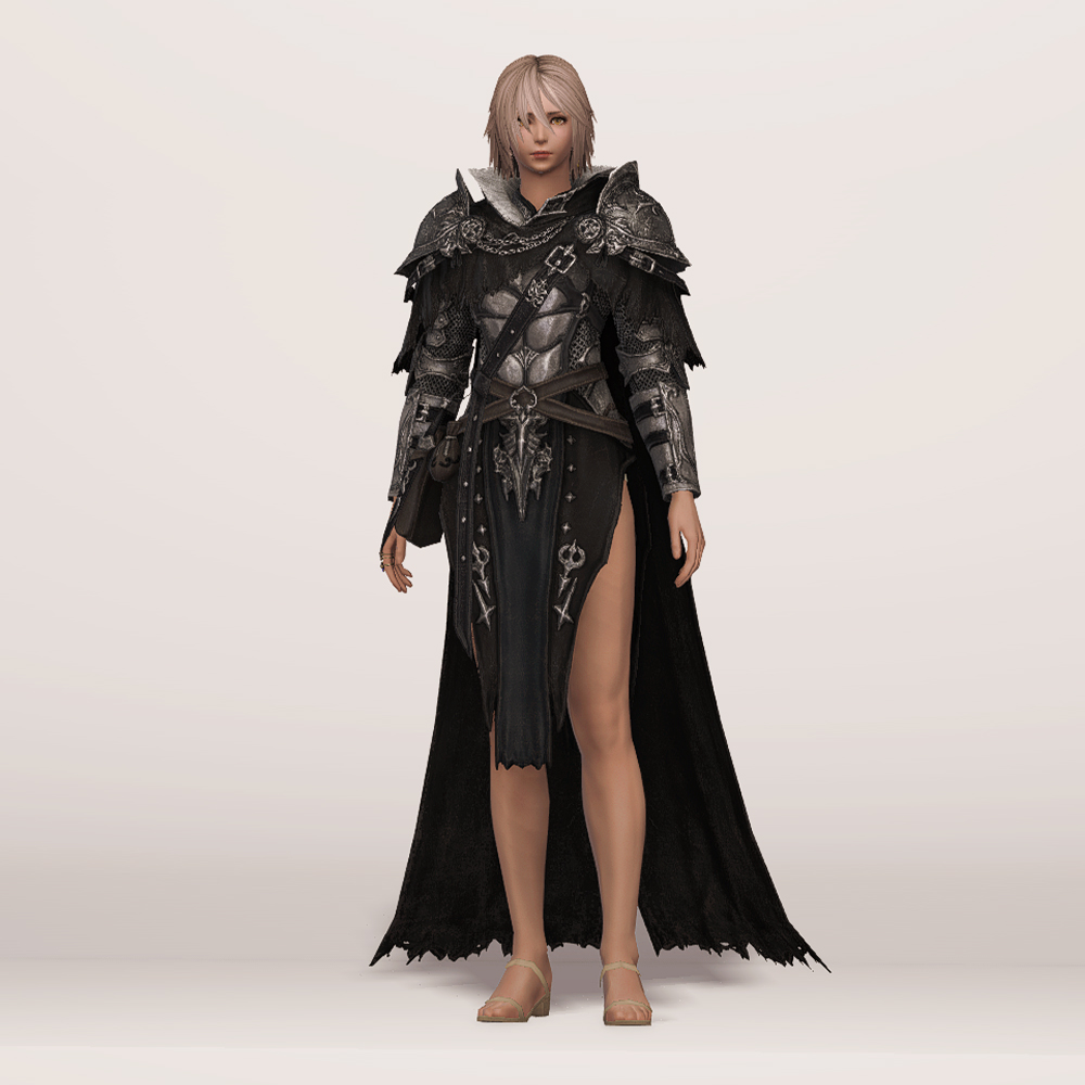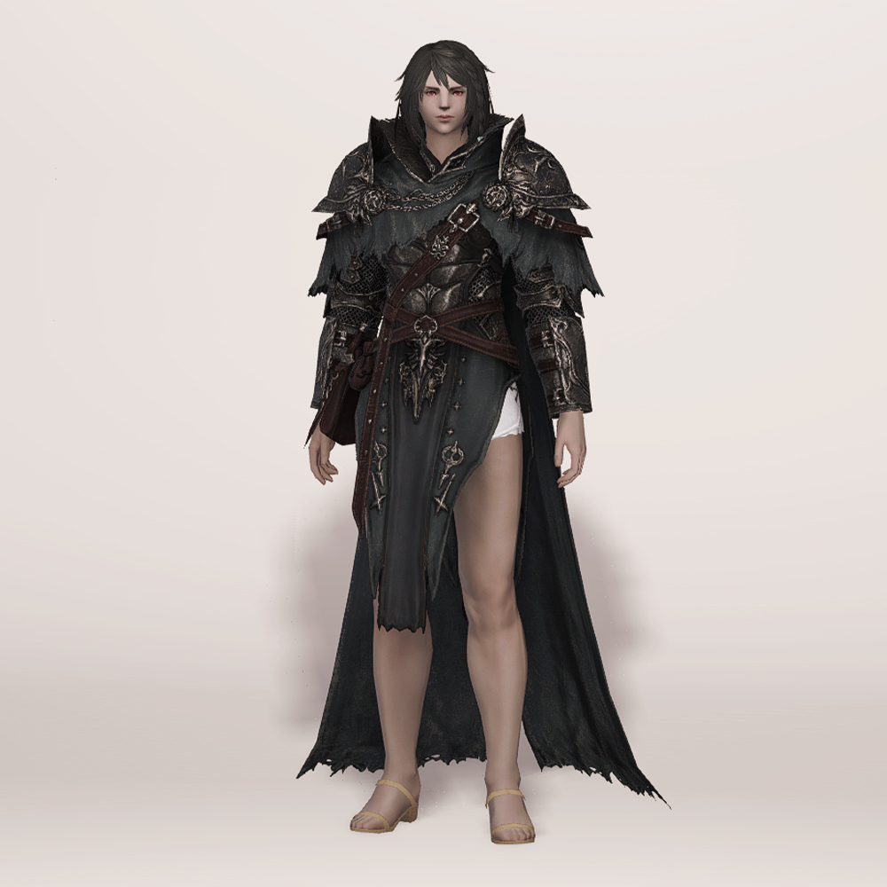 오래된 느낌을 주는 사슬갑옷에 끝단이 낡은 망토와 가죽 스트랩 등을 더해 모험가 또는 방랑 기사의 인상을 남기는 상의입니다. 복부에 덧댄 철판 장식은 6분할의 복근 모양으로 만들어져 근육질 체형을 드러내는 듯한 착시효과를 주기도 합니다. 특히 체격이 좋은 종족이 착용할 경우 강인하고 야성적인 느낌이 물씬 살아납니다. 녹슨 듯한 색감이나 너덜거리는 망토 자락은 방랑자다운 인상을 주지만, 어깨받이의 양각과 곳곳의 금속 장식들은 상당히 섬세하게 세공되어 있어 먼 옛날 궁전이나 성을 지키던 기사 같은 매력이 있는 아이템입니다. 하의나 신발을 볼륨감 있는 갑주로 선택해 위아래의 밸런스를 맞추어 주는 것도 추천합니다.