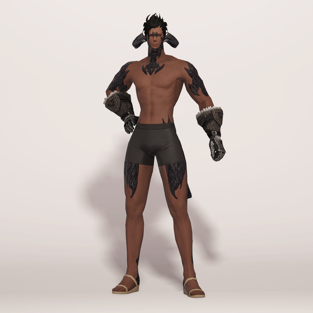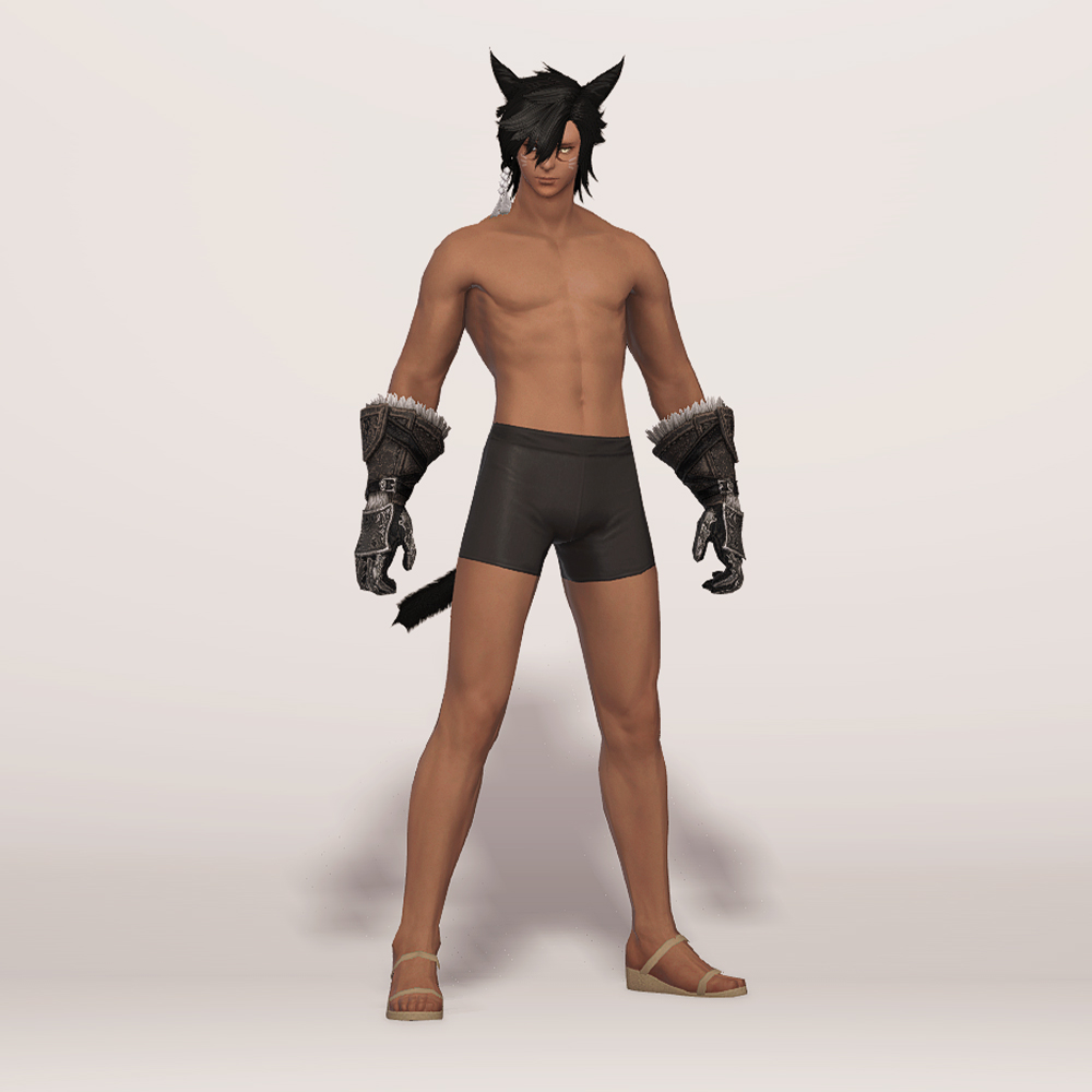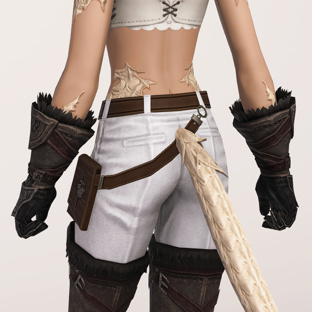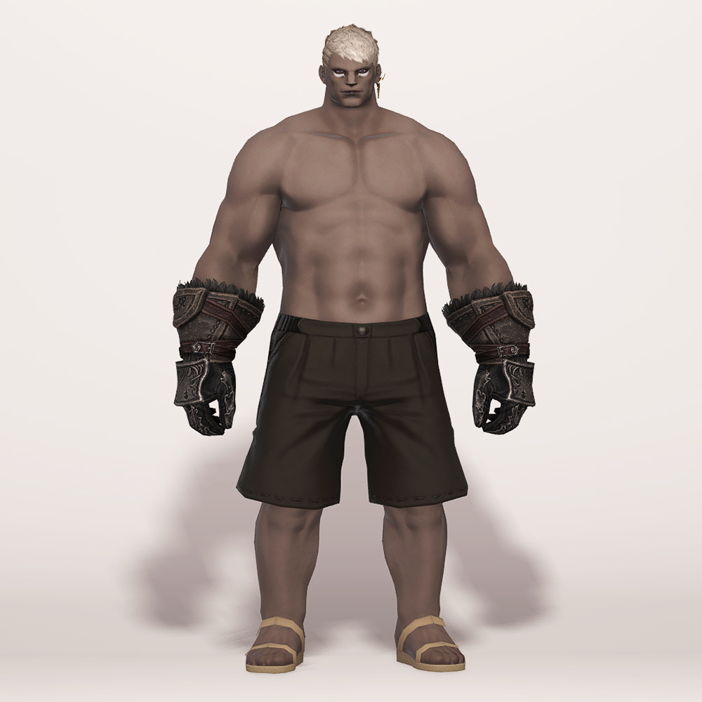 가죽으로 제작된 건틀릿입니다. 사용감이 느껴지며 팔목과 손목 부분에 털 장식이 들어갔고, 요마를 뜻하는 듯한 느낌의 문양과 함께 둘러진 스트랩과 스트치가 눈에 띕니다. 손등과 손가락을 안전하게 보호할 수 있도록 덧대어진 금속 보호구는 화려한 무늬들이 들어가 밋밋하지 않습니다. 판금 갑옷 계열보다는 가죽이나 천이 둘러져 있는 갑옷이나 스트랩이 눈에 띄는 상의와 매치하는 것을 추천드립니다.
