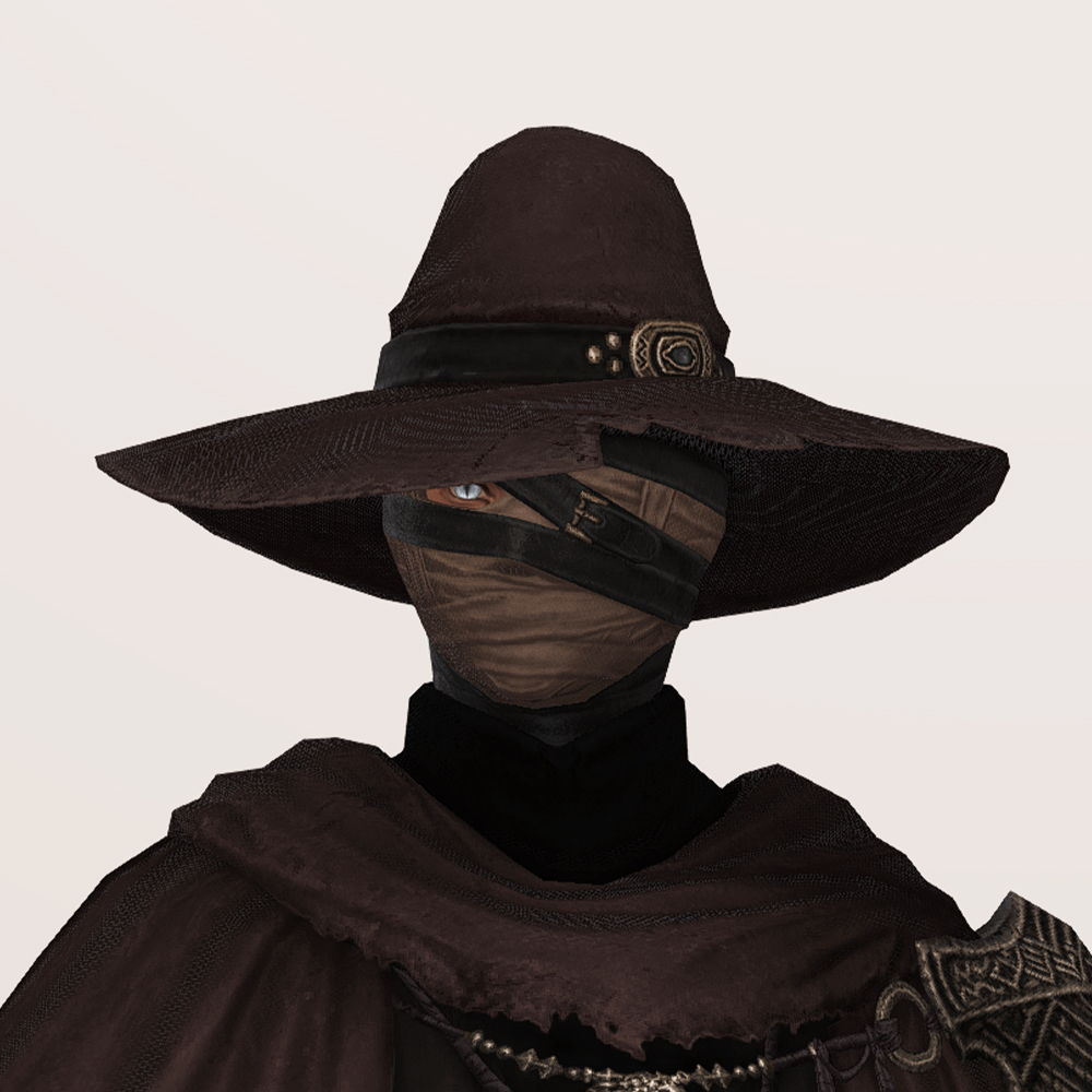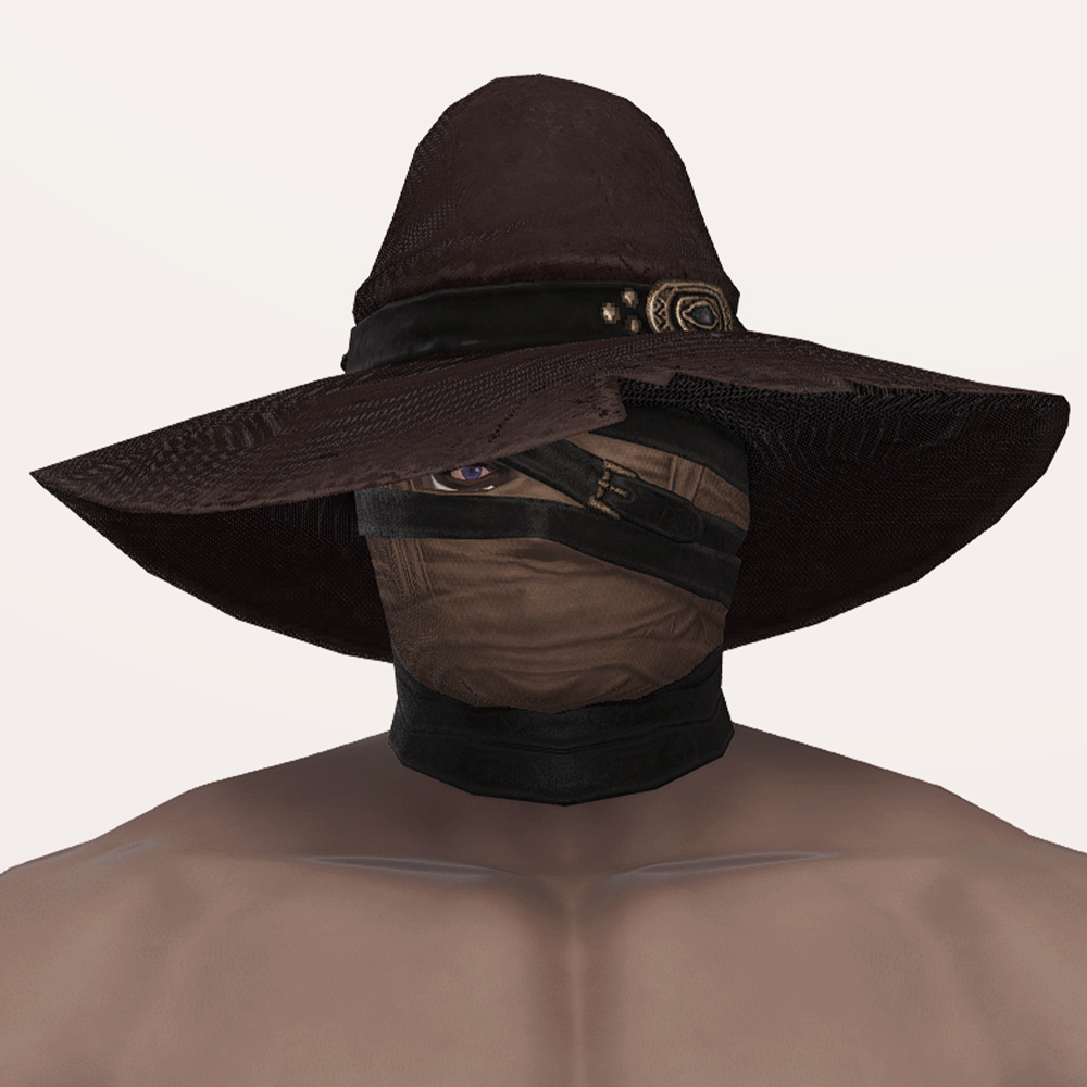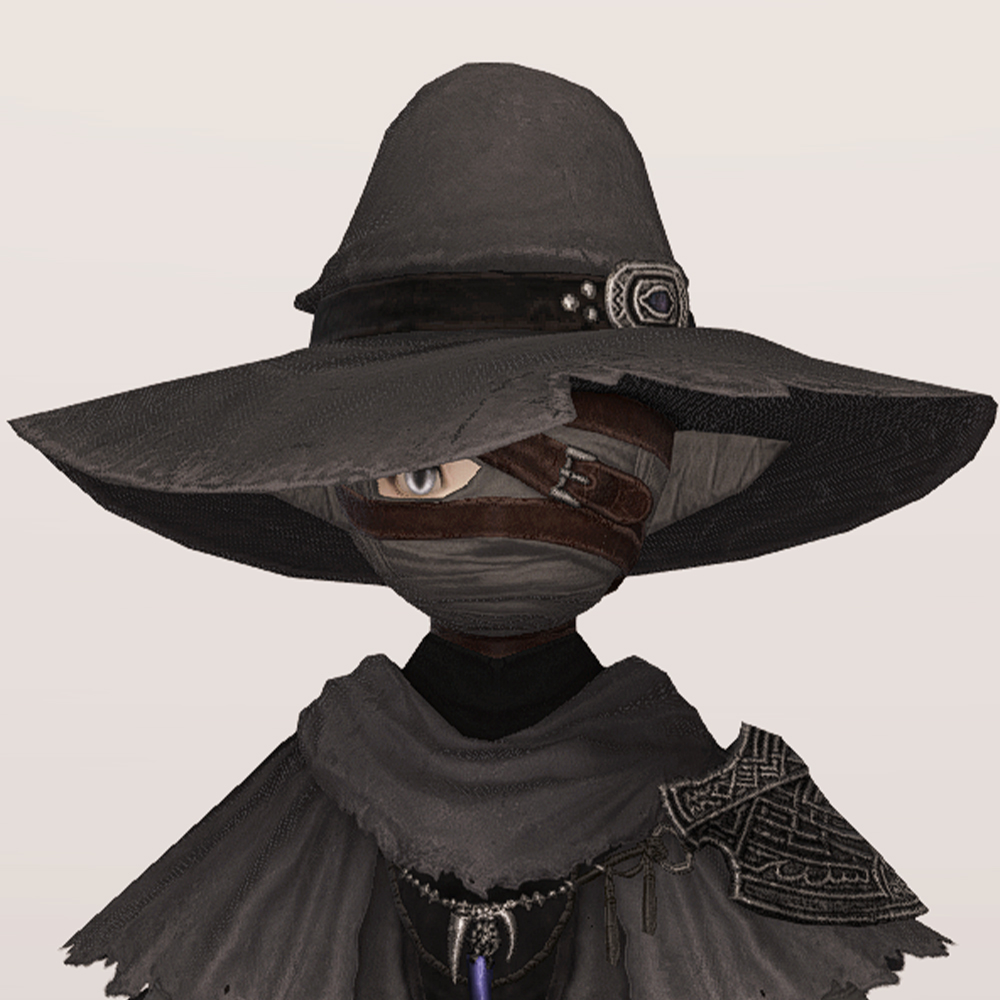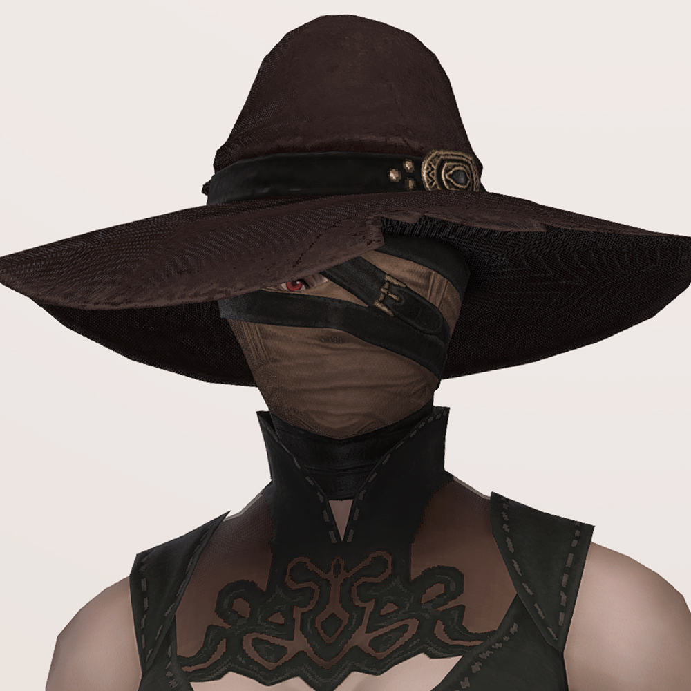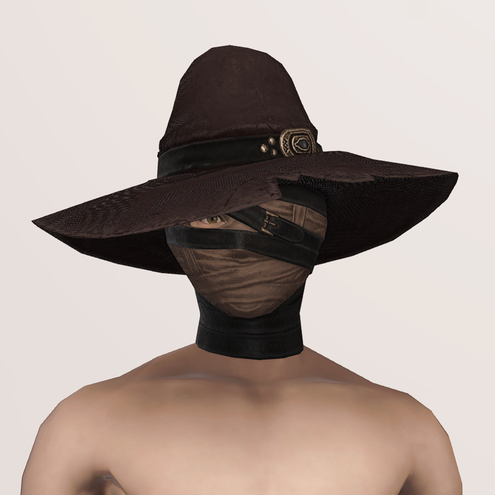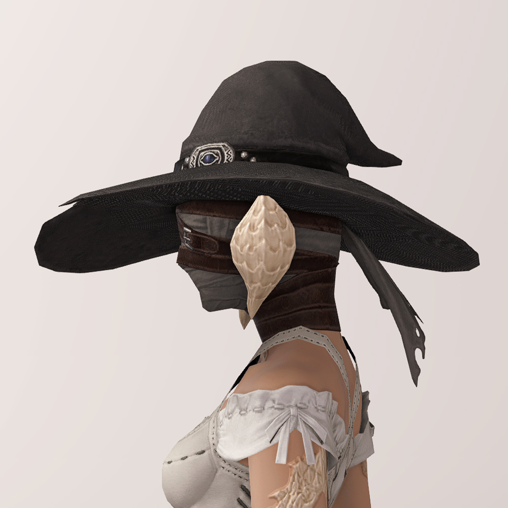 보는 사람을 기준으로 왼쪽 한쪽 눈을 제외하고 얼굴과 머리 전체를 붕대로 감은 뒤에 마법사, 마녀가 쓸법한 느낌의 꼬깔모자를 써 마도사 뾰족모자가 떠오르는 외관입니다. 바랜 듯한 색감의 꼬깔모자에는 눈을 닮은 느낌의 보석 장식이 눈에 띄며, 너덜거리는 붕대 끝자락은 다른 트로이아 장비들처럼 낡고 투박한 느낌을 한껏 끌어올립니다. 붕대 위에 가죽 스트랩이 둘러져 사연 있는 모험가다운 분위기를 연출하고 싶을 때 활용할 수 있습니다. 이슈가르드풍 드레스, 오피오타우로스 치유사 상의, 라자한 모직 가을 셔츠, ウェイクドクター・ホワイトコート 등과 매치하면 잘 어울려 추천드립니다.