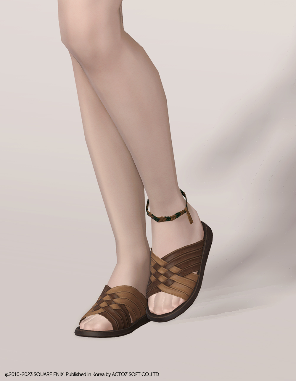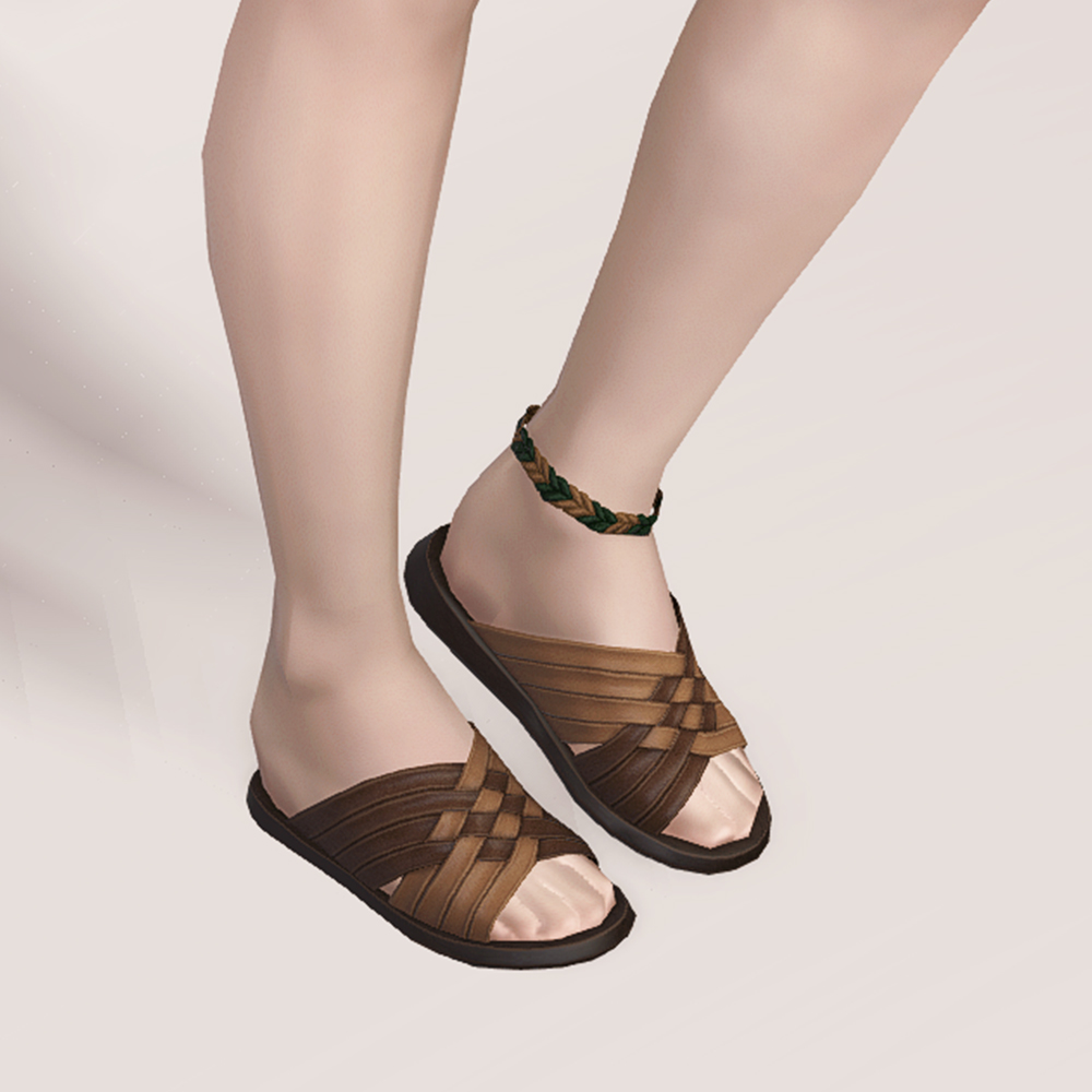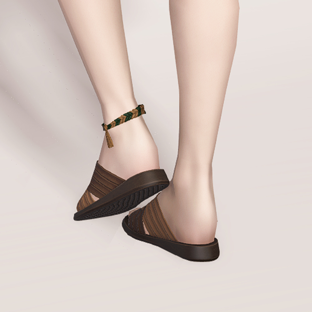 가죽 질감의 스트랩을 체크무늬로 엮어 만든 여름 슬리퍼에 매듭발찌로 귀여운 포인트를 더했습니다. 휴양지의 방갈로에 어울릴 법한 슬리퍼입니다. 좀더 차분한 스타일에도 무난하게 매치할 수 있겠지만, 다리를 드러내는 반바지나 짧은 스커트, 수영복 등과 함께 착용한다면 왼발목에 엮인 발찌가 돋보여 더 매력적일 것 같습니다.