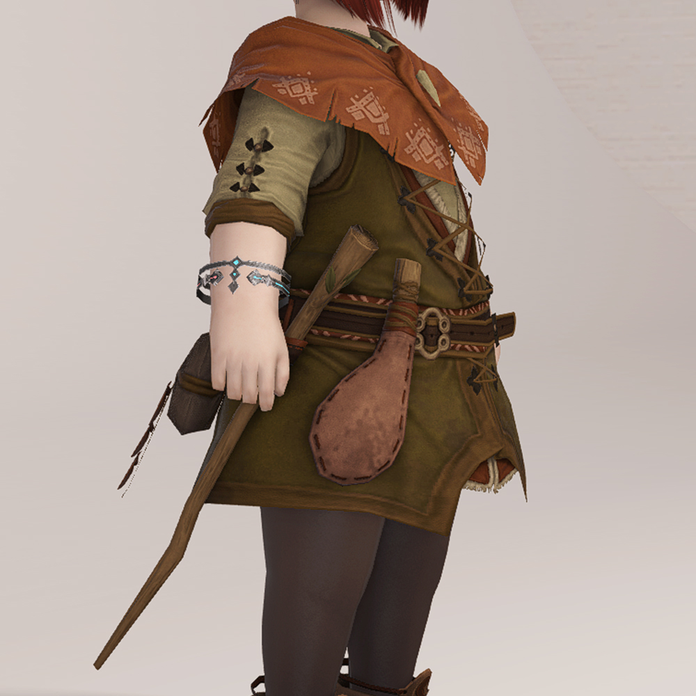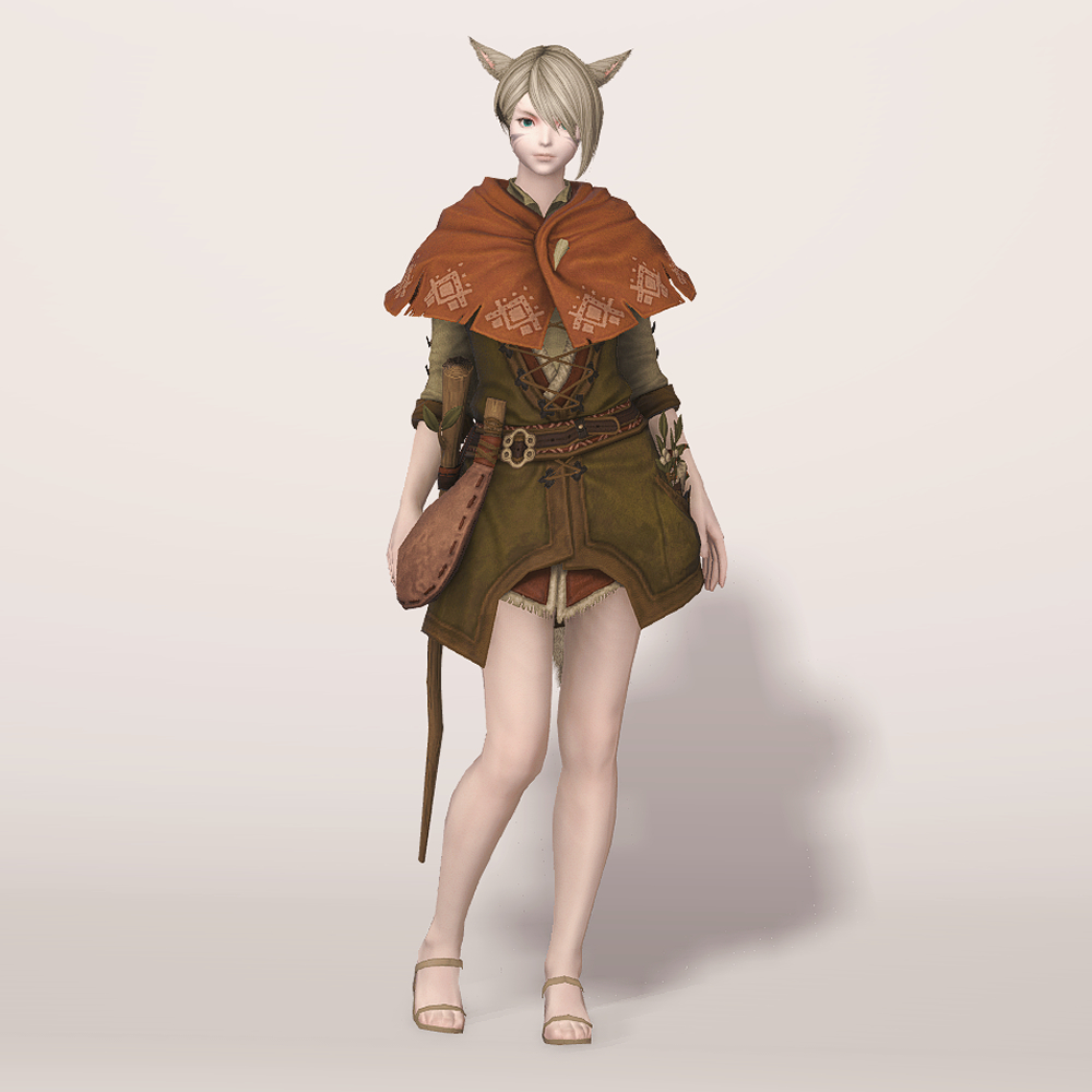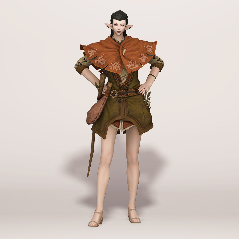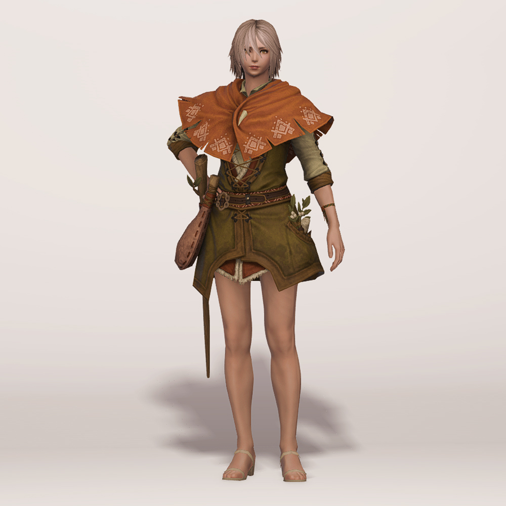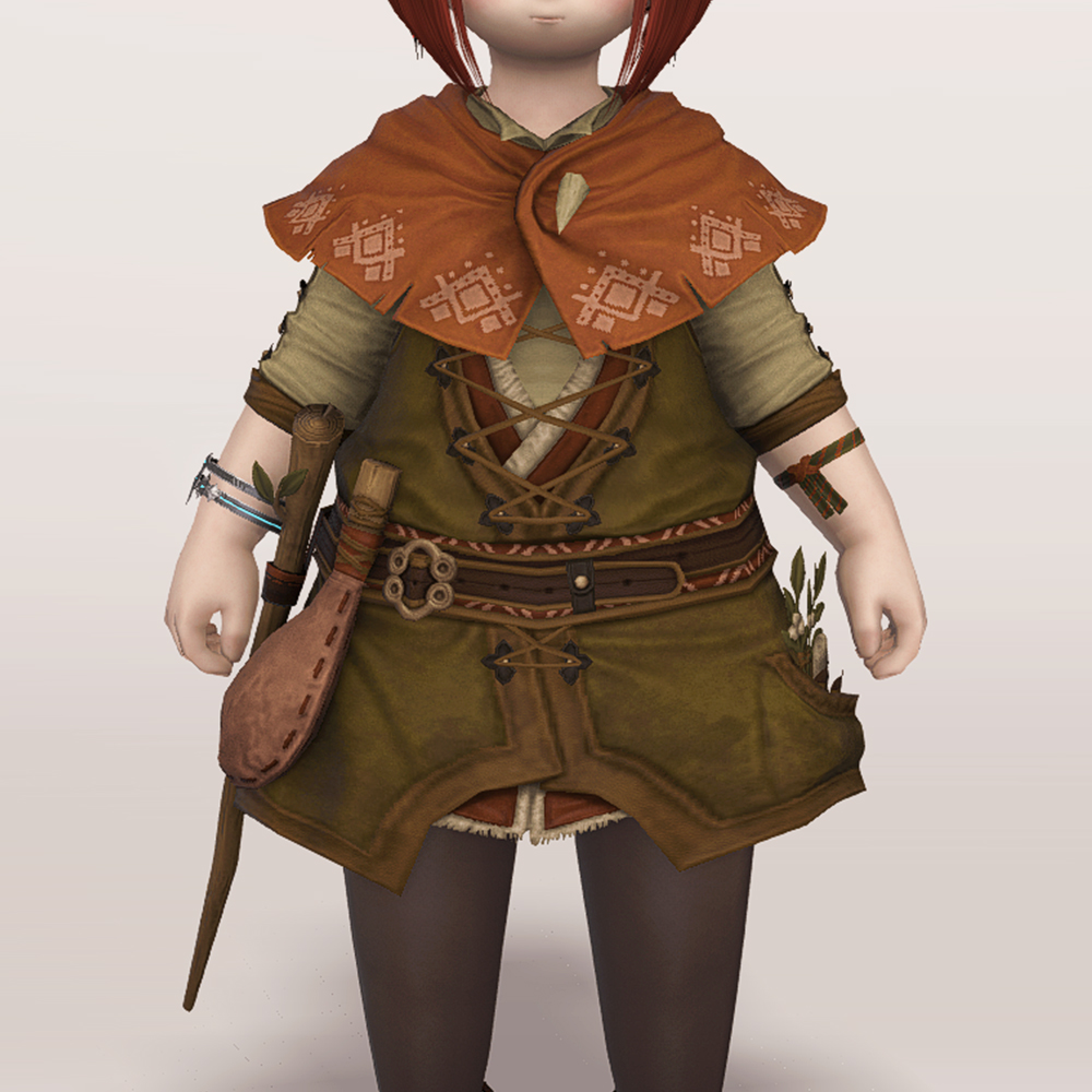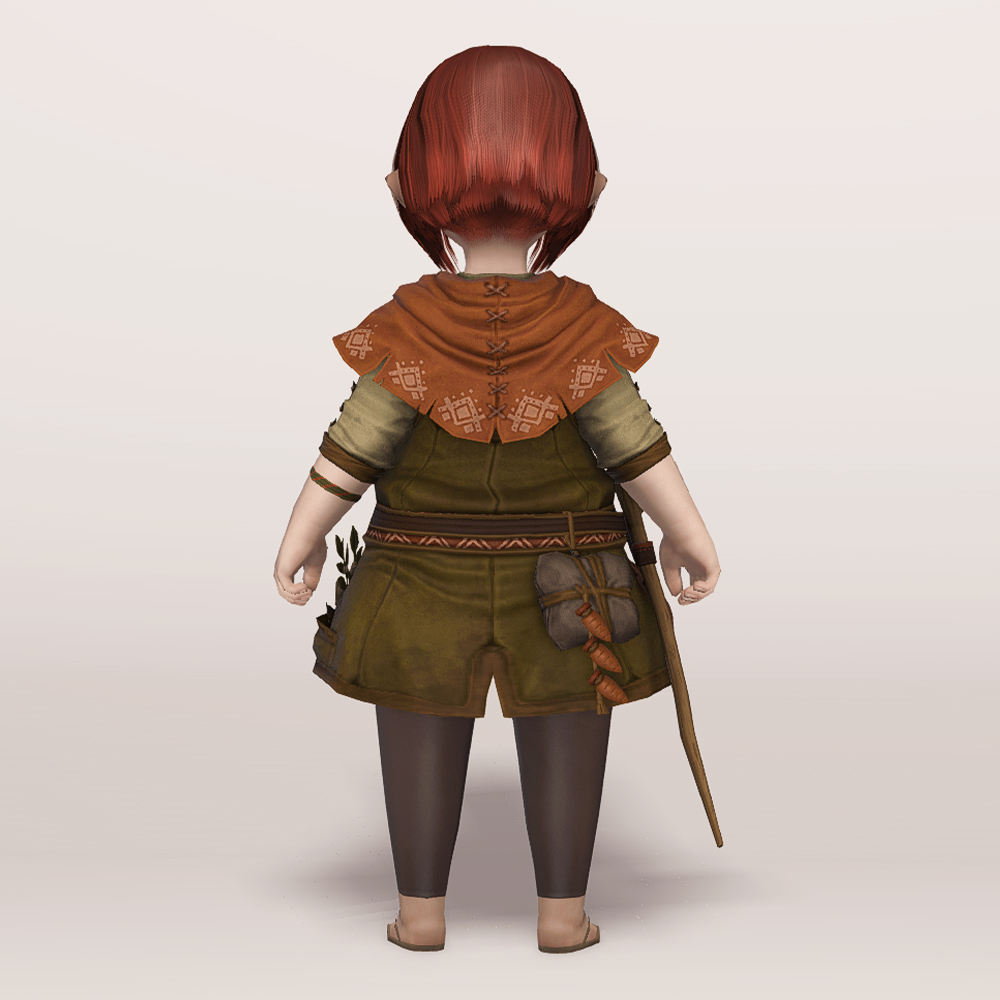 소매를 걷은 셔츠 위에 가죽조끼를 입고, 기다란 모양의 뿔 단추로 고정시킨 케이프를 두른 깜찍한 상의입니다. 양쪽 팔과 조끼에 위치한 버튼은 각각 씨앗과 꽃잎을 닮았으며 팔뚝의 실매듭 팔찌, 그리고 허리띠와 함께 매여진 나무 지팡이와 가죽 물주머니가 눈에 띕니다. 나무 지팡이의 작은 새싹, 물주머니의 스티치, 벨트의 무늬와 장식 등이 디테일하며, 보는 사람을 기준으로 오른쪽 조끼 주머니에 소중하게 들어있는 겨우살이와 도토리, 지도는 정말 귀엽습니다. 허리 뒤쪽에는 약초를 담은 느낌의 보따리와 당근을 닮은 장식이 눈에 띕니다. 전체적으로 디테일하며 귀여운 포인트가 한두 개가 아니라서 입는 즐거움이 있으며 음유시인이나 여행자스러운 느낌도 있어 추후에 모조룩으로 나올 경우 좀 더 다양하게 활용할 수 있어 보입니다.