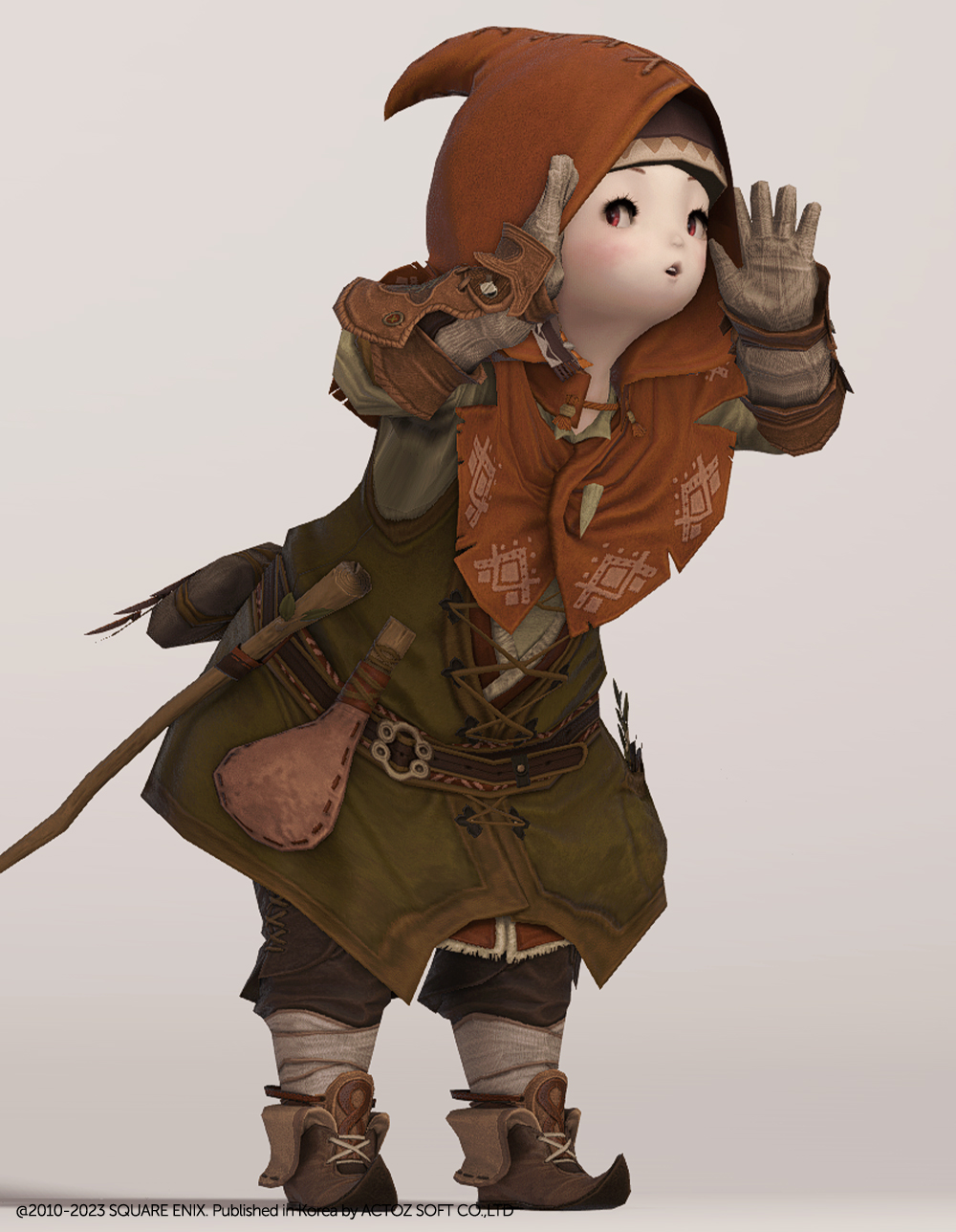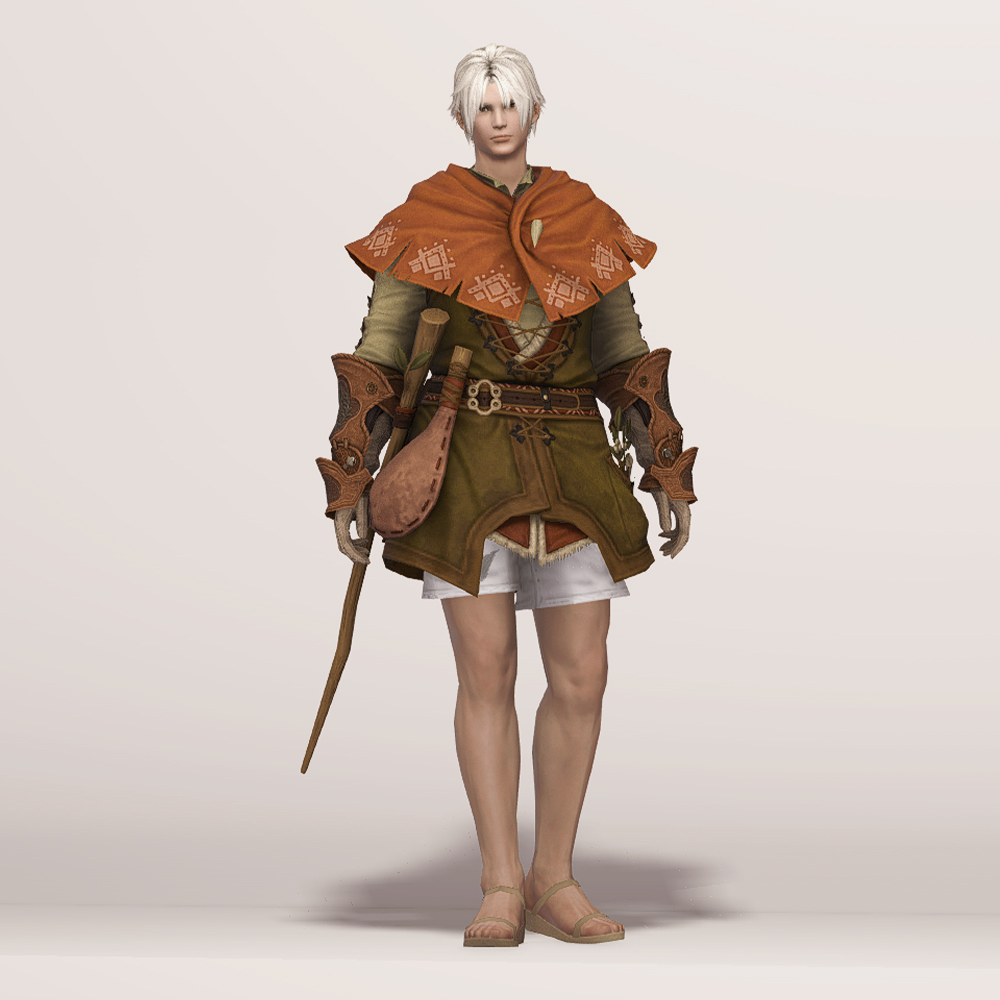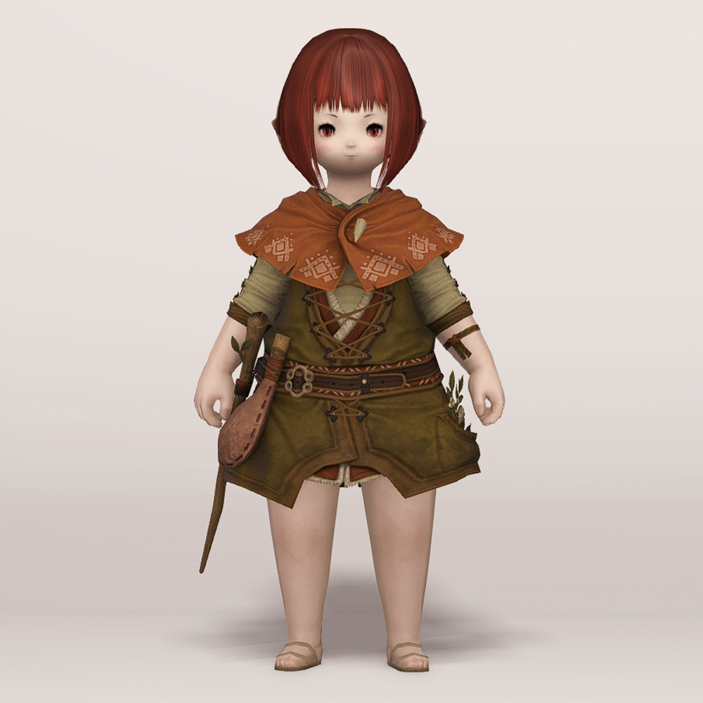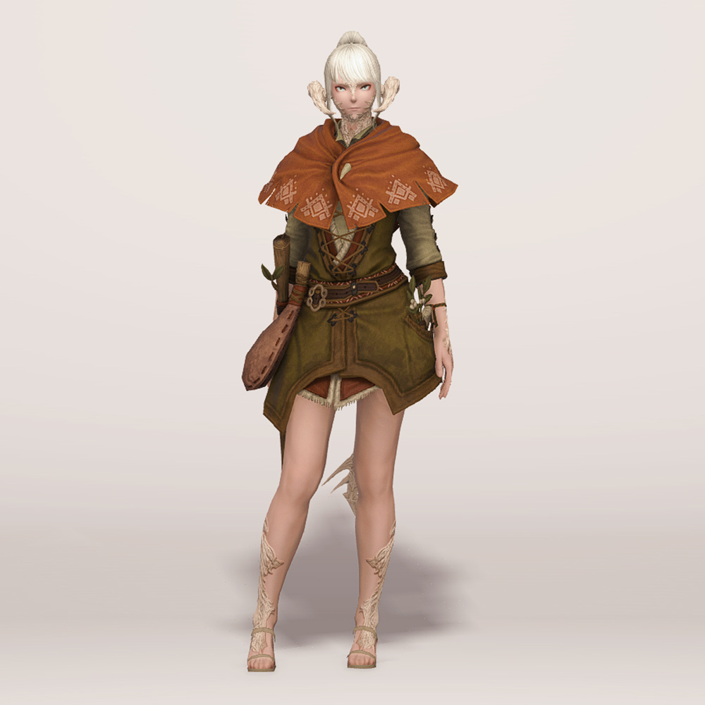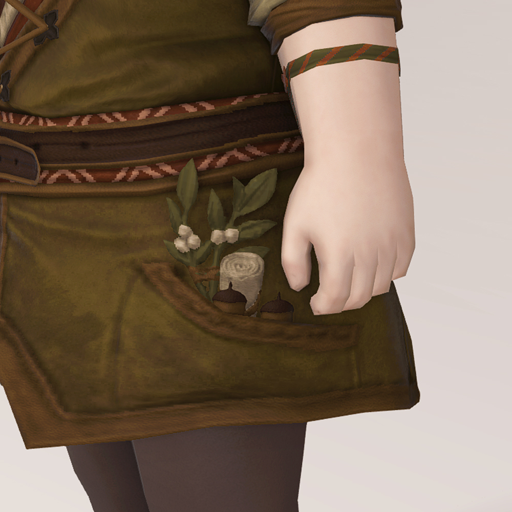 소매를 걷은 셔츠 위에 가죽조끼를 입고, 기다란 모양의 뿔 단추로 고정시킨 케이프를 두른 깜찍한 상의입니다. 양쪽 팔과 조끼에 위치한 버튼은 각각 씨앗과 꽃잎을 닮았으며 팔뚝의 실매듭 팔찌, 그리고 허리띠와 함께 매여진 나무 지팡이와 가죽 물주머니가 눈에 띕니다. 나무 지팡이의 작은 새싹, 물주머니의 스티치, 벨트의 무늬와 장식 등이 디테일하며, 보는 사람을 기준으로 오른쪽 조끼 주머니에 소중하게 들어있는 겨우살이와 도토리, 지도는 정말 귀엽습니다. 허리 뒤쪽에는 약초를 담은 느낌의 보따리와 당근을 닮은 장식이 눈에 띕니다. 전체적으로 디테일하며 귀여운 포인트가 한두 개가 아니라서 입는 즐거움이 있으며 음유시인이나 여행자스러운 느낌도 있어 추후에 모조룩으로 나올 경우 좀 더 다양하게 활용할 수 있어 보입니다.