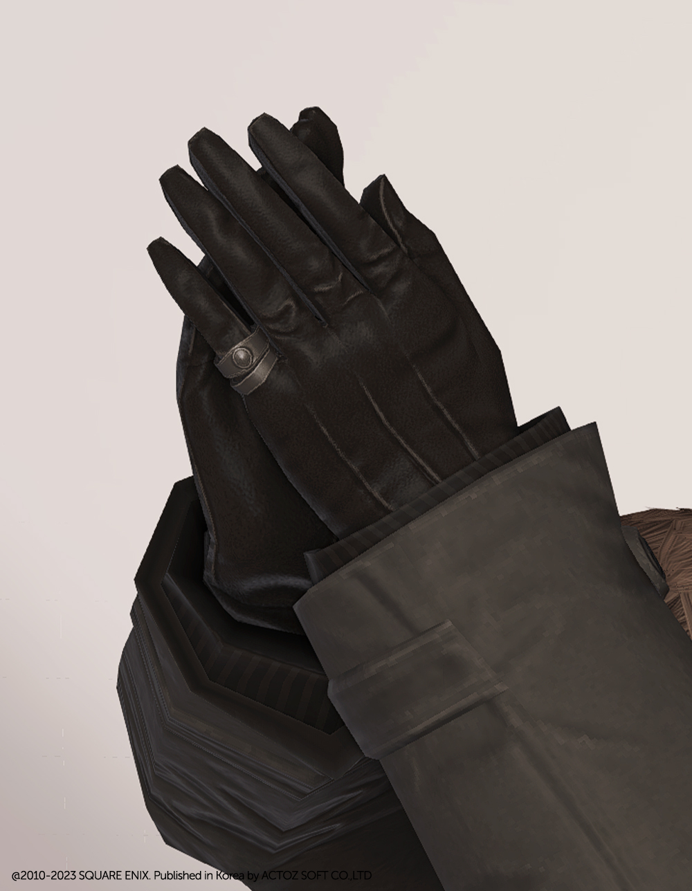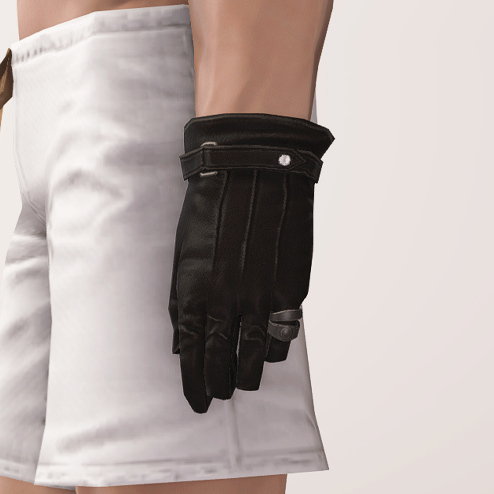 카리스마 있는 느와르 패션을 마무리하는 검은색 가죽 장갑입니다. 적당한 두께감이 느껴지는 핏, 군더더기 없는 디자인, 왼손에 끼워진 투박한 느낌의 반지가 어우러져 중후하고 묵직한 분위기를 풍깁니다. 발렌티온 조끼나 르베유르 지정 재킷처럼 깔끔한 정장에도 잘 어울리지만 좀더 화려한 크라바트나 코트, 혹은 스팀펑크풍의 의상에도 잘 어울려 두루두루 활용하기 좋습니다. 하얀 눈색이나 순백색으로 염색한다면 블랙과는 또 다른 매력을 뽐낼지도 모릅니다!