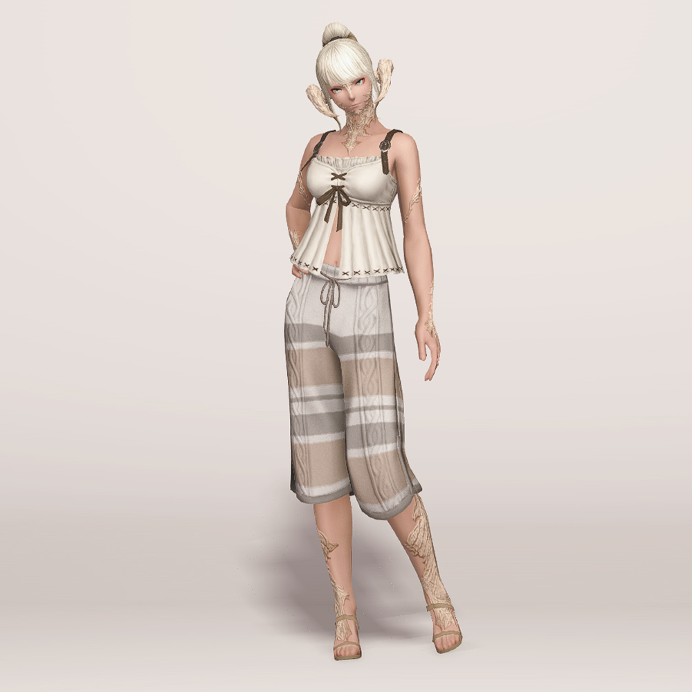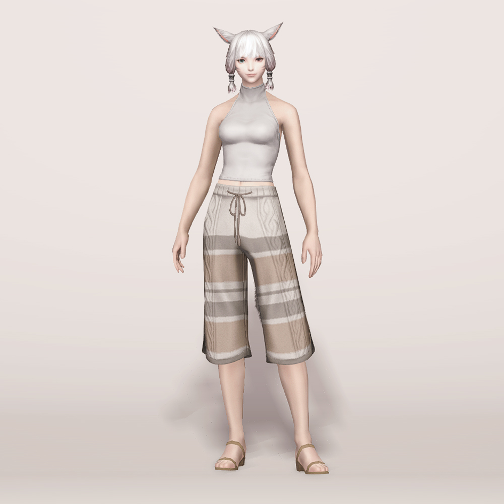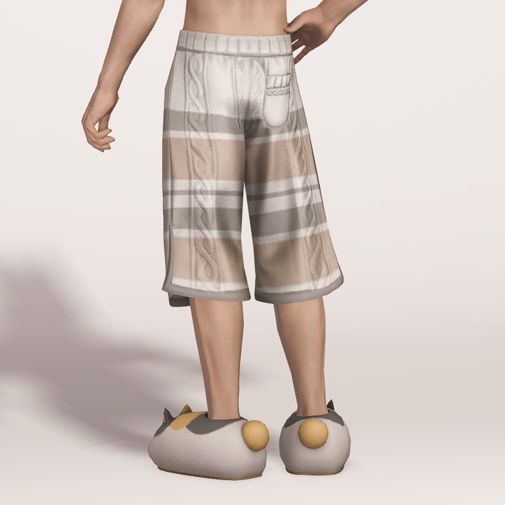 꽈배기 짜임을 넣은 편안한 니트 바지에 뚱냥이의 삼색 컬러를 입혔습니다. 무릎 위까지 덮는 기장의 반바지가 부드럽고 따뜻해 보이며, 밑단 양쪽의 트임이나 작게 달린 뒷주머니를 보면 꼼꼼한 디테일이 느껴집니다. 겨울 스웨터나 모험가의 스웨터에 매치하면 포근해 보이는 니트 패션이 완성됩니다.