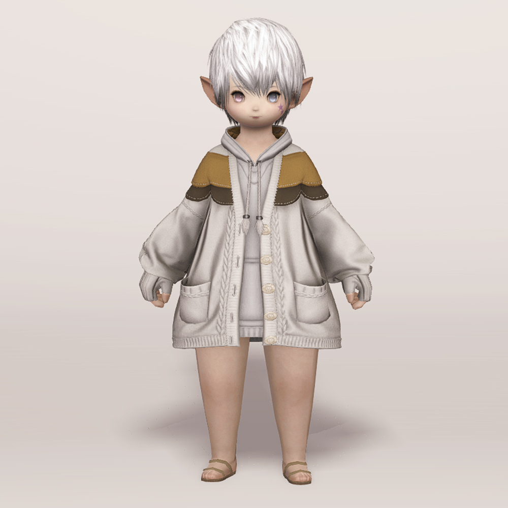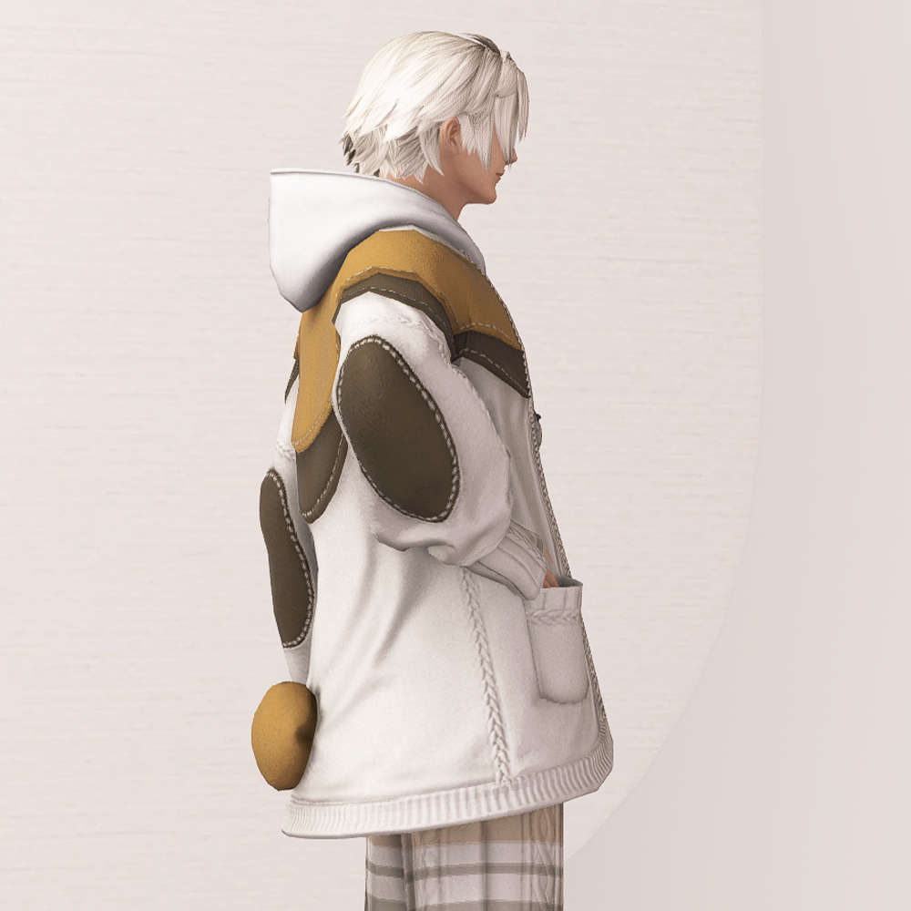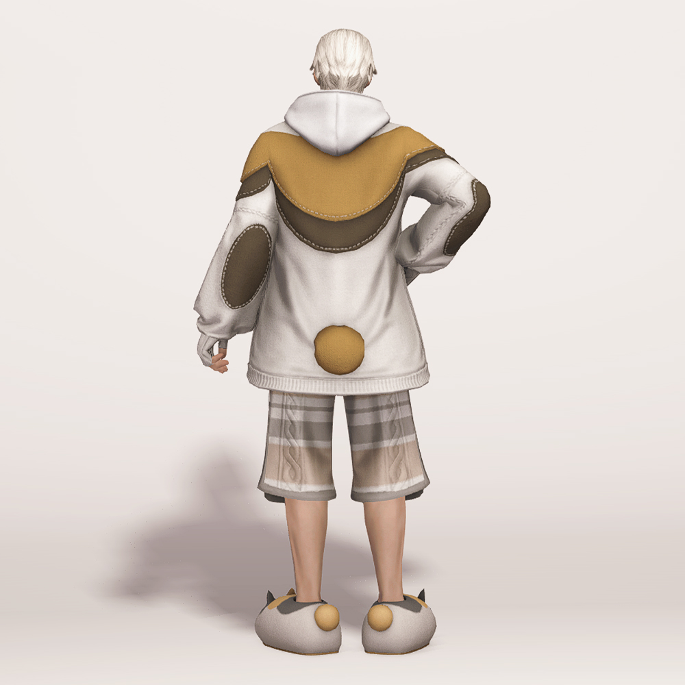 꼬마 친구 뚱냥이를 모티브로 만들어져 삼색 고양이를 닮은 귀여운 라운지웨어입니다. 후드티와 핸드워머 위에 루즈핏 니트 가디건을 걸쳐 따뜻하고 편안한 느낌이 강조됩니다. 곳곳에 포인트로 들어간 꽈배기 짜임과 어깨와 가슴, 팔 뒤쪽에 덧대어진 천 조각의 스티치, 그리고 엉덩이에 달려있는 둥글고 푹신해 보이는 꼬리는 사랑스러움을 더해줍니다. 대학생 빵모자, 송아지 가죽 라이더 모자, 플란넬 털모자, 개척자 리본 등 다양한 아이템들과 잘 어울리며 집 안에서는 가볍고 편안하게 홈웨어로, 집 밖에서는 편안한 외출복으로 코디할 수 있는 점이 매력적입니다.
