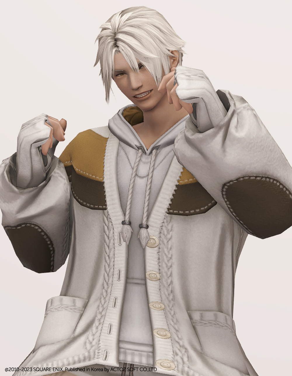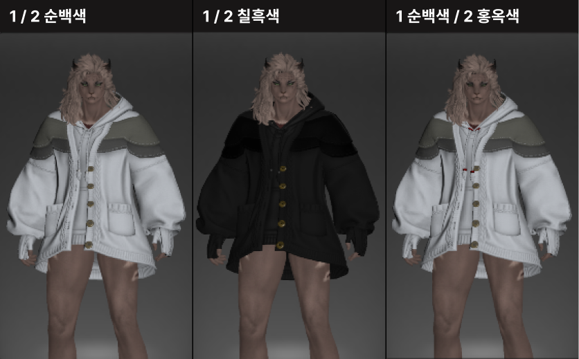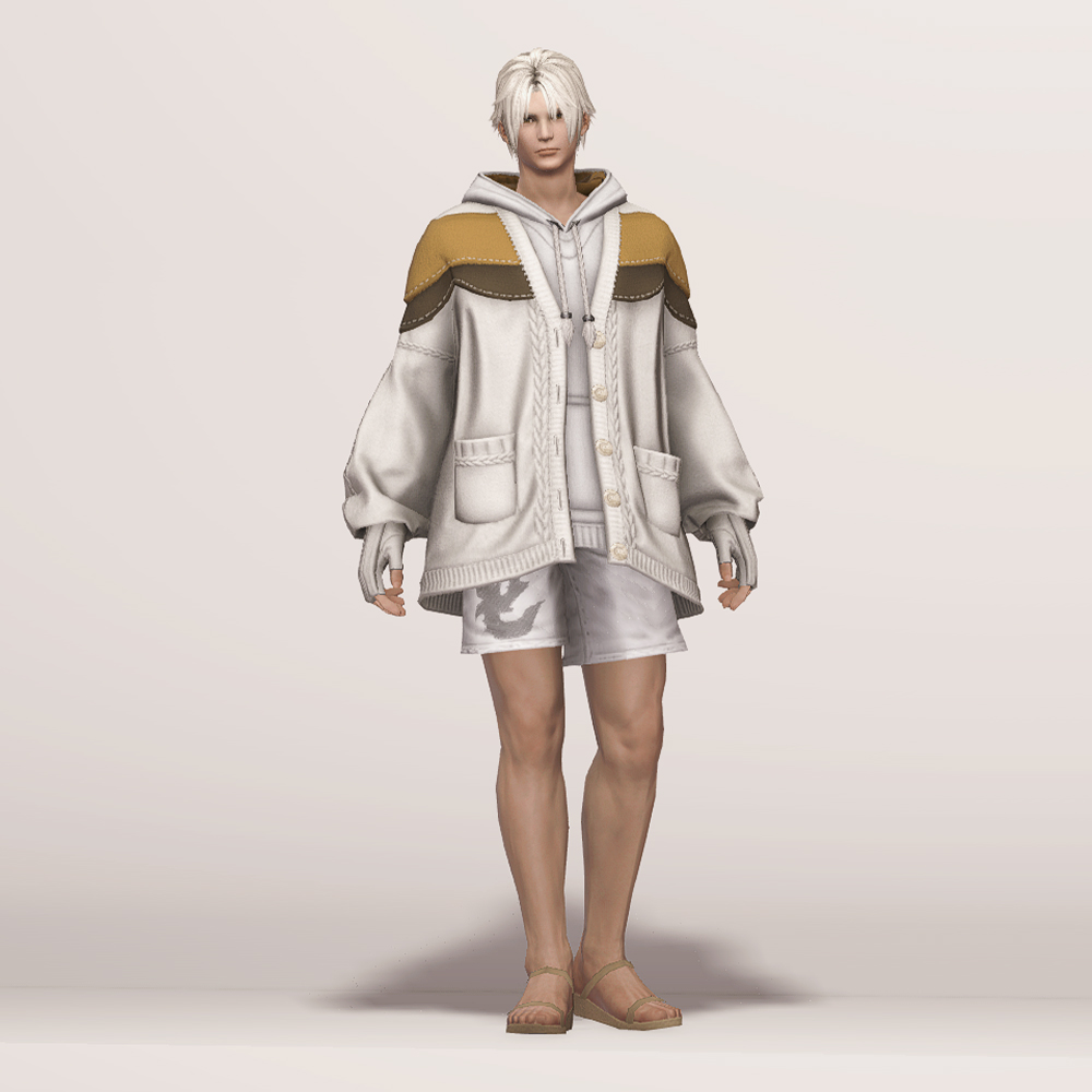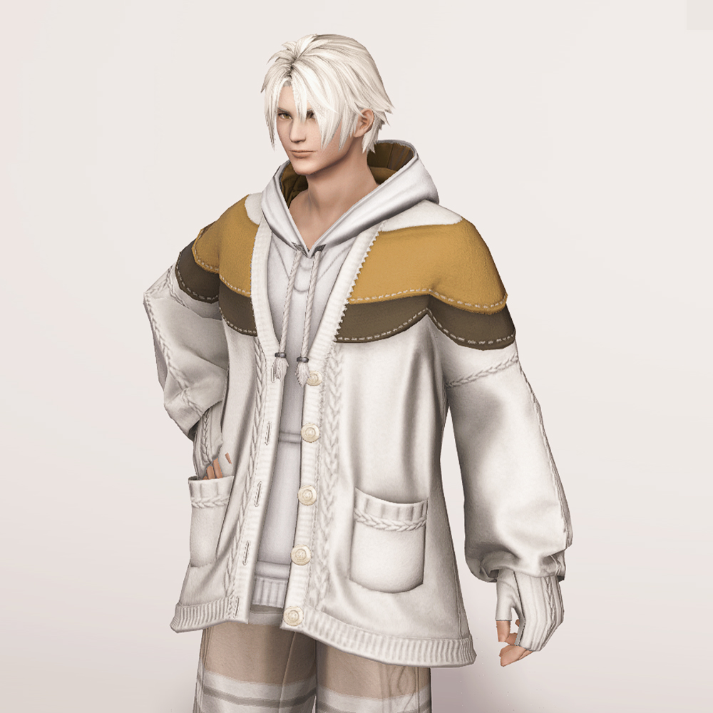 꼬마 친구 뚱냥이를 모티브로 만들어져 삼색 고양이를 닮은 귀여운 라운지웨어입니다. 후드티와 핸드워머 위에 루즈핏 니트 가디건을 걸쳐 따뜻하고 편안한 느낌이 강조됩니다. 곳곳에 포인트로 들어간 꽈배기 짜임과 어깨와 가슴, 팔 뒤쪽에 덧대어진 천 조각의 스티치, 그리고 엉덩이에 달려있는 둥글고 푹신해 보이는 꼬리는 사랑스러움을 더해줍니다. 대학생 빵모자, 송아지 가죽 라이더 모자, 플란넬 털모자, 개척자 리본 등 다양한 아이템들과 잘 어울리며 집 안에서는 가볍고 편안하게 홈웨어로, 집 밖에서는 편안한 외출복으로 코디할 수 있는 점이 매력적입니다.
