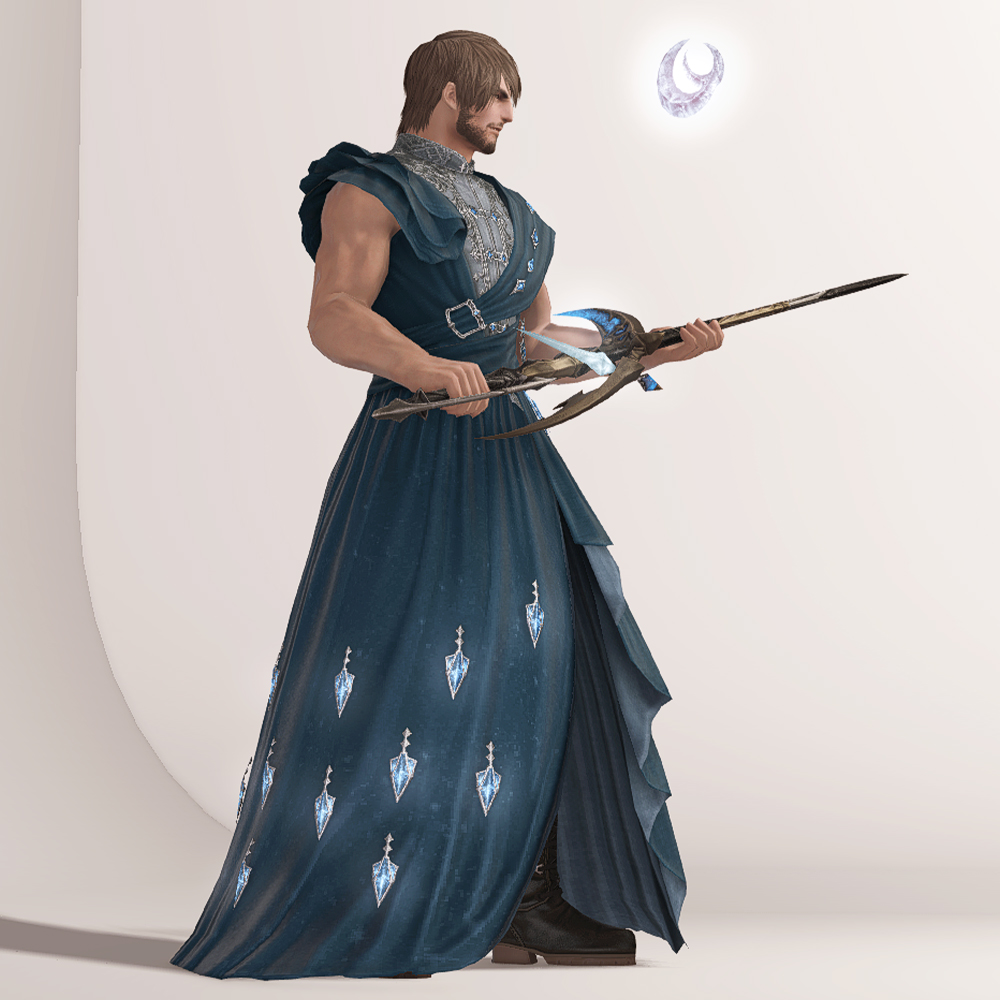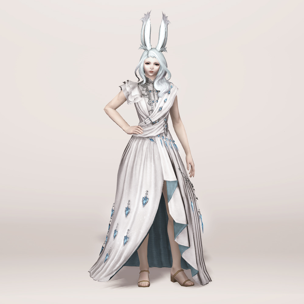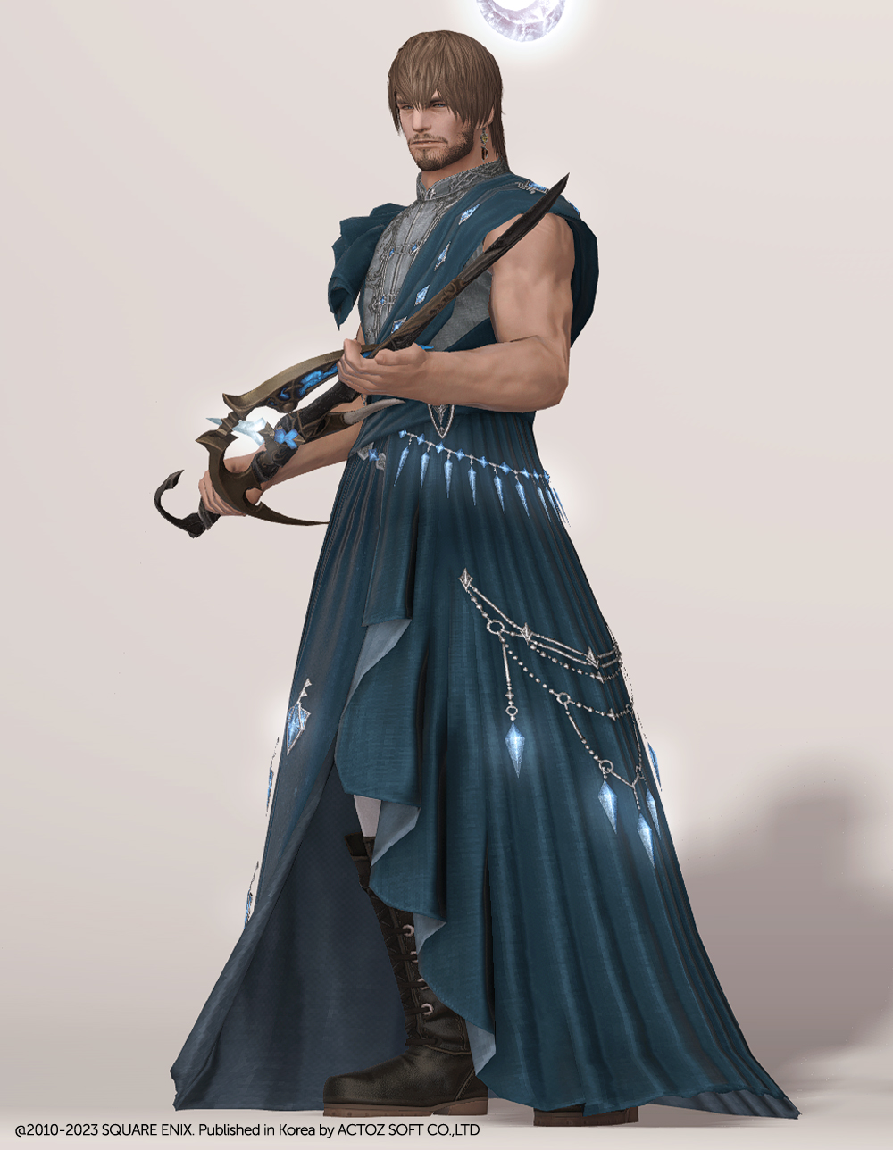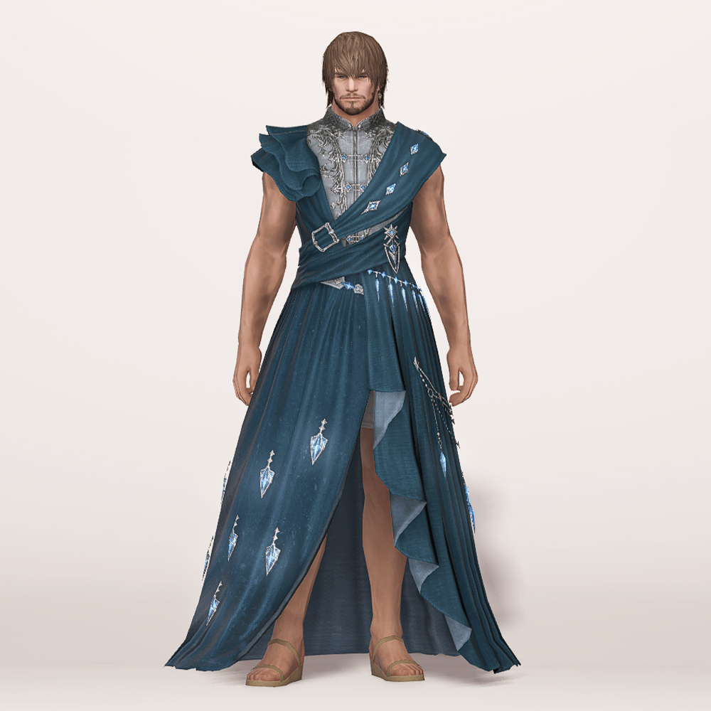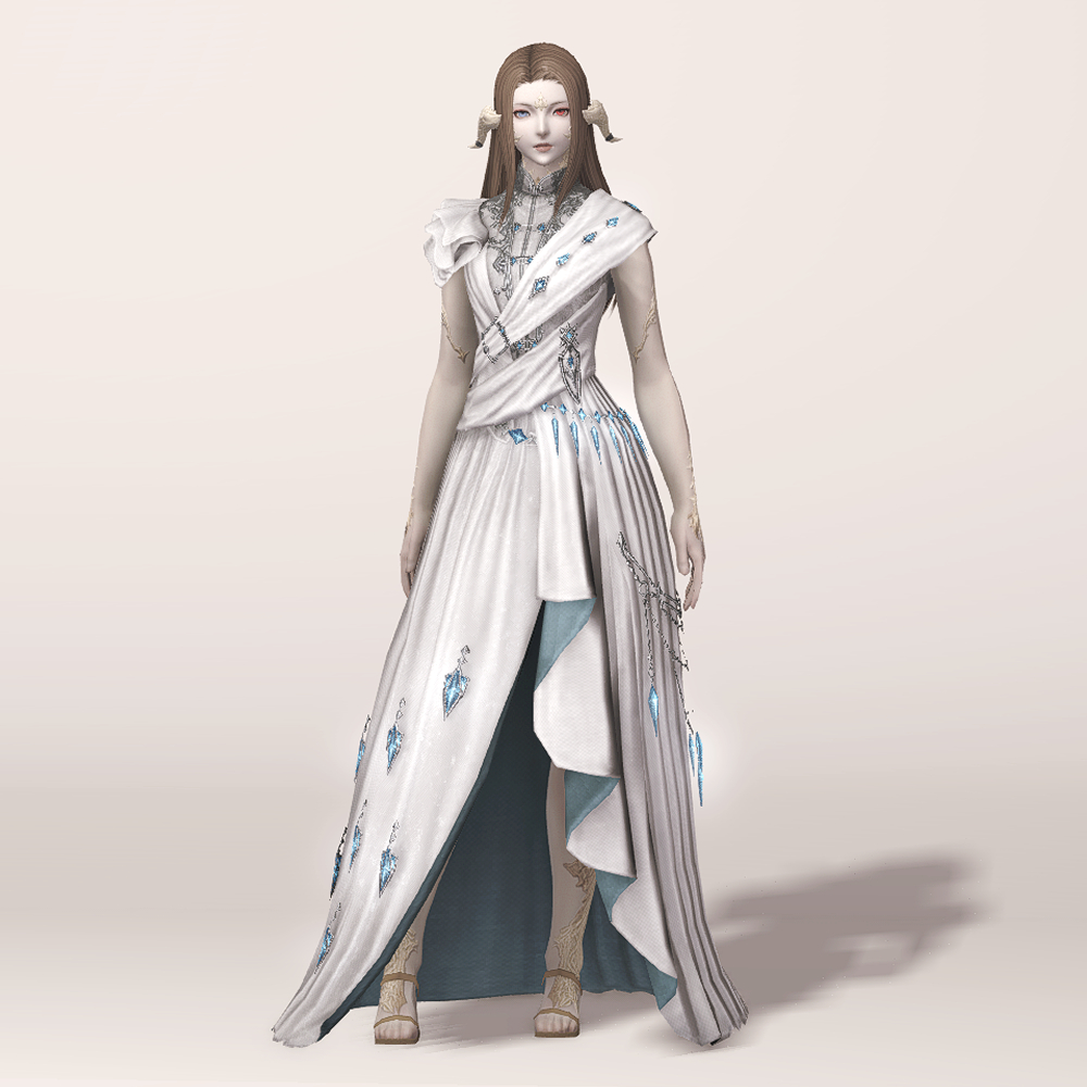 6.3 업데이트 기쁨의 신역 에우프로시네에서 만나볼 수 있는 상의입니다. 어깨 부분부터 밑단까지 길게 드레이프가 들어간 형태로, 그리스의 전통 복식 히마티온이나 로마의 토가 스타일과 얼핏 유사해 보이며, 독특하게도 자수로 장식한 화려한 차이나카라 상의를 민소매 드레이프와 프릴이 감싸고 있는 스타일입니다. 어깨에서 허리로 내려오는 드레이프와 천 아랫단으로 내려가며 늘어뜨린 장식들이 은은한 푸른빛으로 빛나고 있어 마법적인 인상이 강해졌습니다. 적당하게 잘 어울리는 머리 장식을 찾는다면 메그 야카 머리장식, 달사절단 마술사 머리꽂이, 에덴의 합창 마술사 모자 등을 추천드립니다.