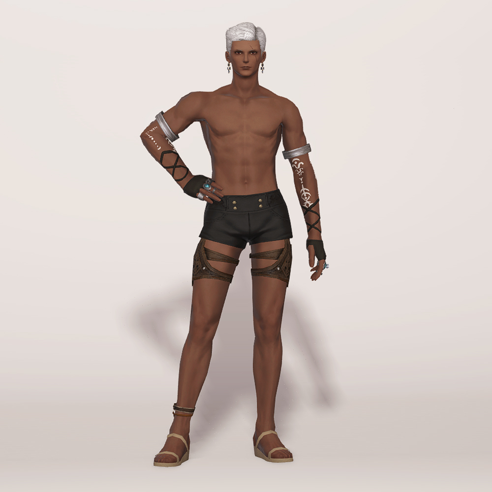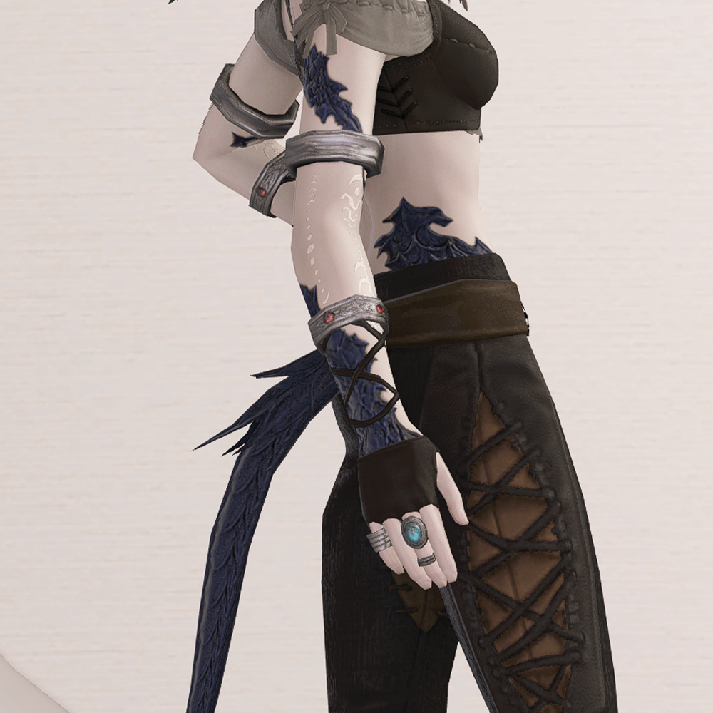 시원하게 드러낸 팔의 문신이 매력적인 장갑입니다. 문신을 기준으로 위팔과 아래팔에 금속으로 제작된 고리를 착용하고, 팔목에 가는 스트랩을 격자무늬로 둘러매 밋밋함을 커버했으며, 심플한 반장갑에 반지를 여러 개 착용해 포인트를 줬습니다. 태닝피부와 인외피부일 때 팔의 하얀 문신이 빛을 발하며, 고전 군단기수 키톤, 파글단 마술사 가슴덮개, 팔라카 마술사 조끼 등 그 외 민소매 종류와 매치하면 잘 어울려 추천드립니다. 비슷한 느낌의 대체 아이템으로는 고전 군단기수 반장갑을 추천드립니다.