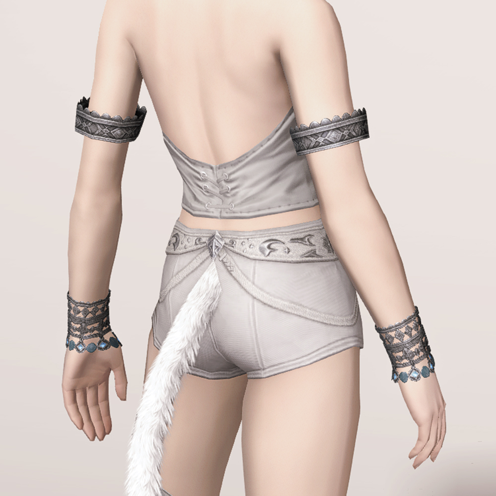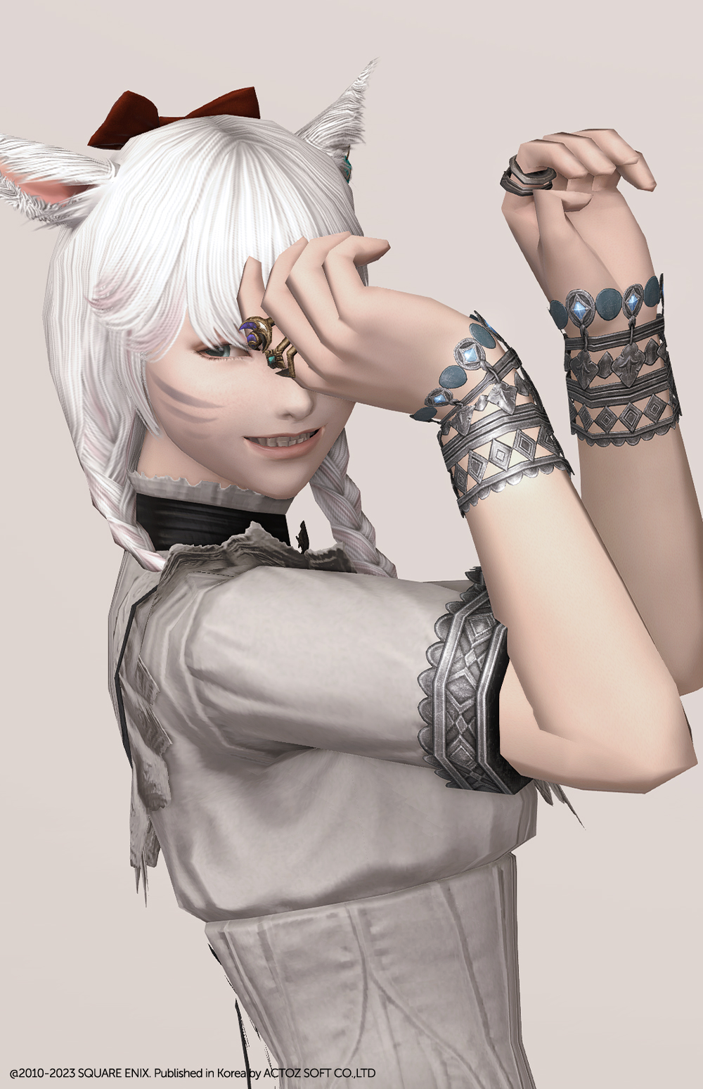 6.3 업데이트 기쁨의 신역 에우프로시네에서 만나볼 수 있는 팔장식입니다. 민소매 상의에 시원한 느낌으로 포인트를 주어도 좋고, 마음에 들지 않은 긴소매의 옷을 깔끔하게 정리하는데에도 사용가능해 가볍게 매치하기 좋겠습니다. 다른 소매를 정리해주는 팔장식 중에서도 가장 깔끔한 느낌을 자랑하며, 전체적으로 고급스럽고 화려한 패턴으로 마감되어있어 하늘하늘한 옷이나 화려한 옷에도 부담없이 착용가능합니다. 염색파트가 전체적으로 염색이 되지 않고 일부만 적용되어 아쉬운 부분이 있을 수 있으나 색감을 살리는 포인트로 살리는 방향도 좋을 것 같습니다.