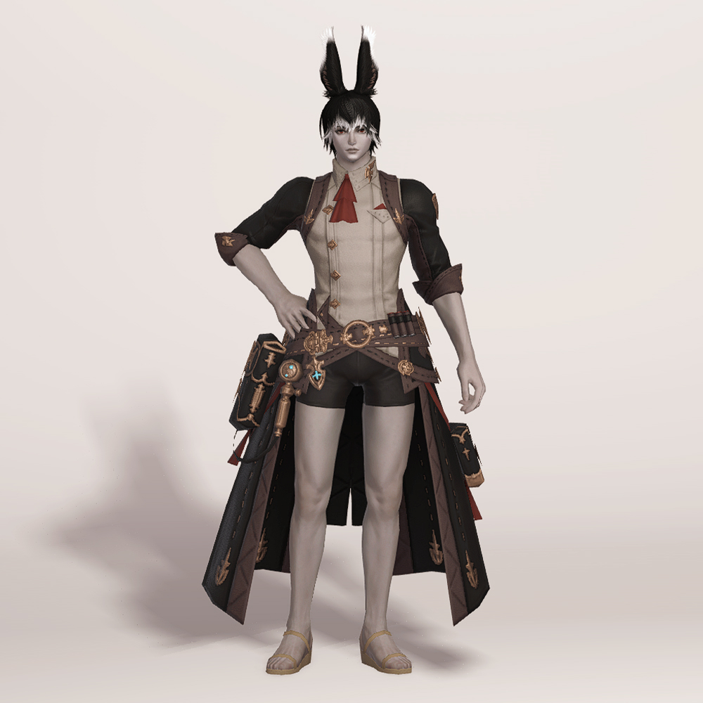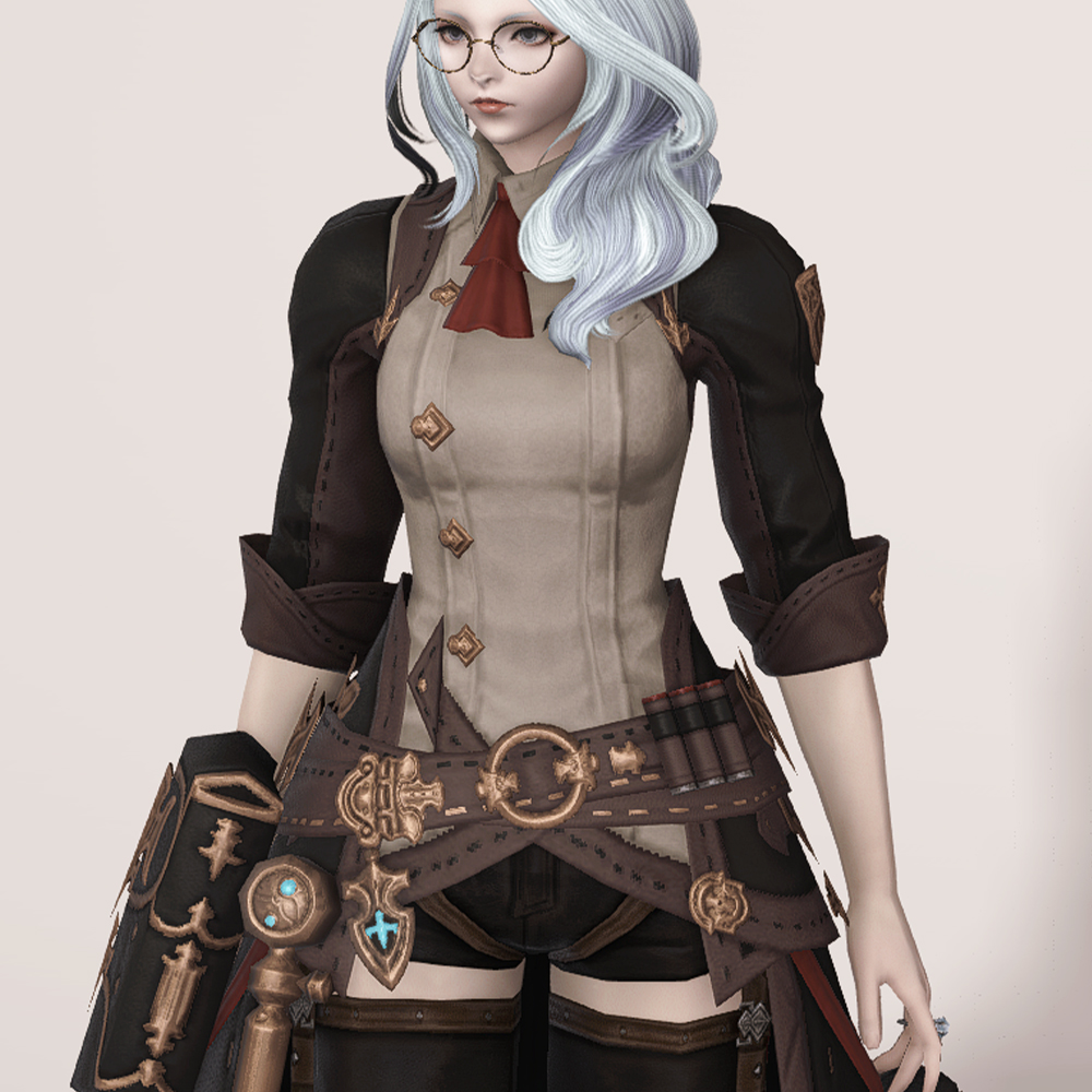 포인트로 들어간 붉은색 크라바트 넥타이가 눈에 띄는 스팀펑크 느낌의 상의입니다. 상체의 스트랩이 묘하게 하네스 느낌이 나며, 등과 허리의 스트랩이 몸을 잡아 라인을 살려주고, 걷어올린 소매까지 더해 섹시합니다. 천과 가죽, 금장 장식으로 이루어져 고풍스러우면서도 깔끔한 외관은 제복이 연상됩니다.