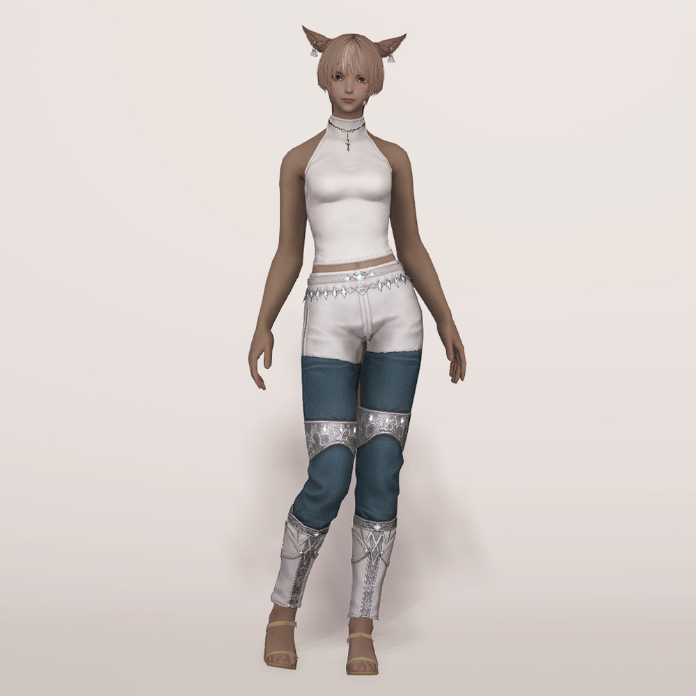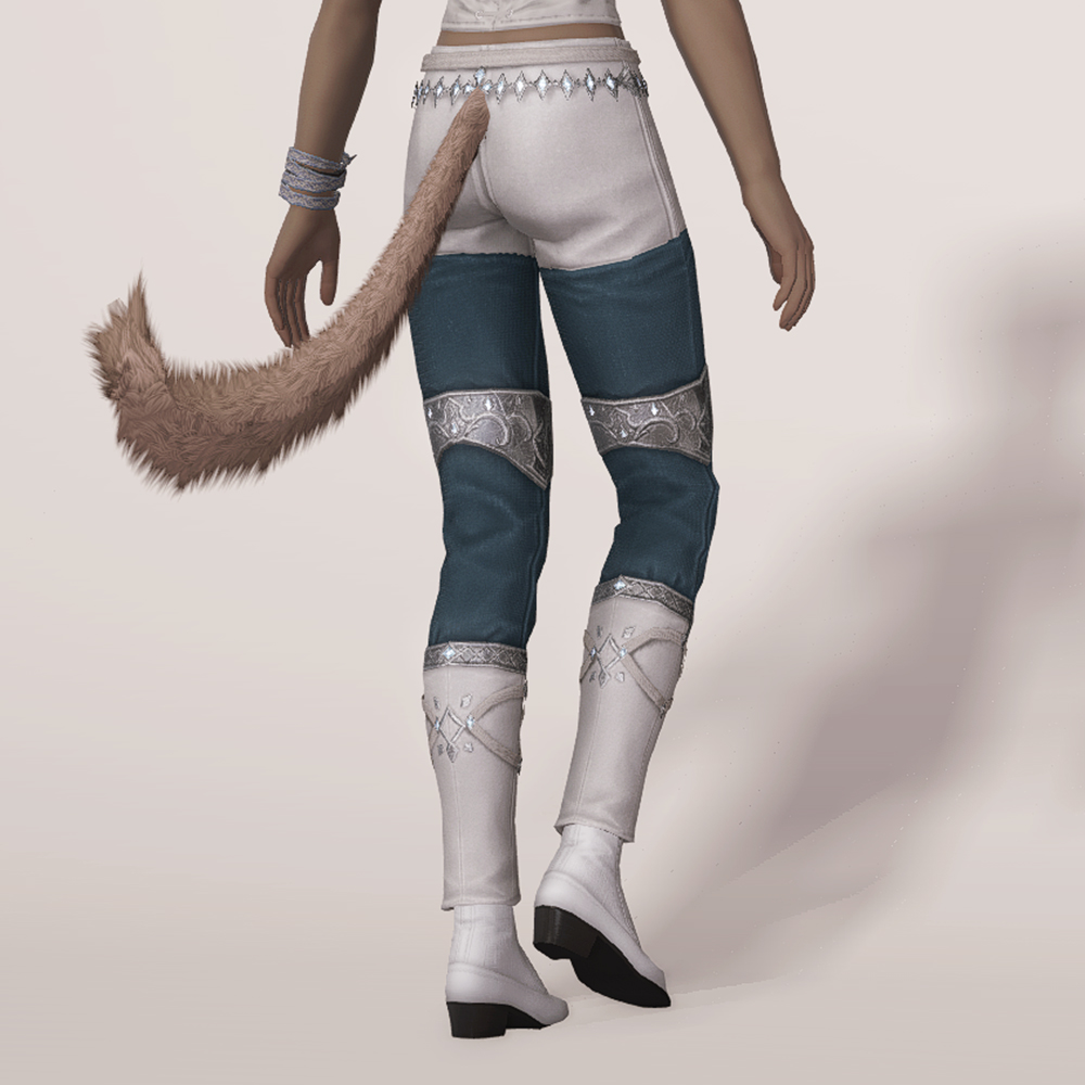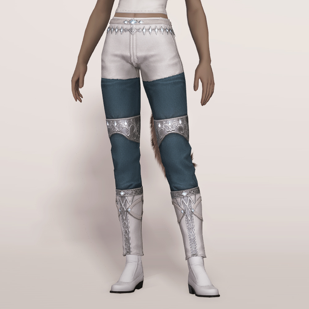 6.3 업데이트 기쁨의 신역 에우프로시네에서 만나볼 수 있는 하의입니다. 화려하게 보석으로 장식된 허리부분이 인상적인 바지로, 흰색으로 만들어진 기본 바지 위로 청색 가죽이 덧대어진 구조의 기마바지입니다. 신축성이 좋아 보이는 바지에 가죽으로 제작된 쇼스를 사이하이삭스 정도의 높이로 올려 입어 가터벨트의 형태를 하고 있는 무릎장식으로 고정했습니다. 종아리 부분의 화려한 장식이 섬세하게 세공된 장화처럼보여 깔끔한 흰색 신발을 매치하여 코디하는 것도 추천드립니다. 순백색으로 염색할 경우 기존 흰색 부분의 천 색상과 차이가 나는 편입니다.