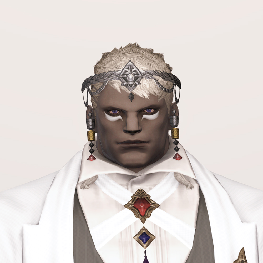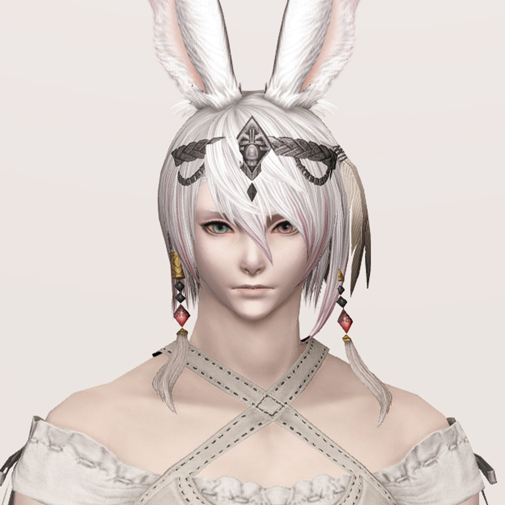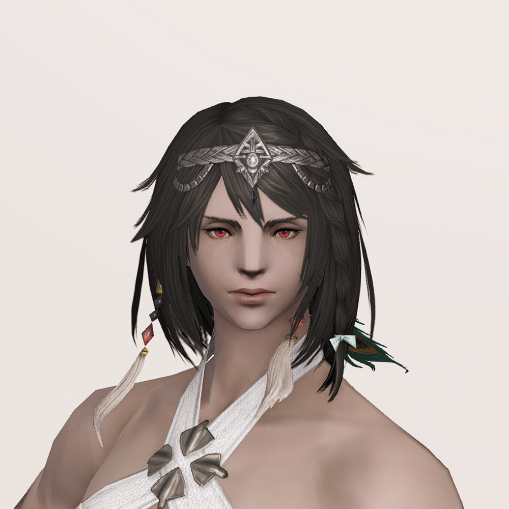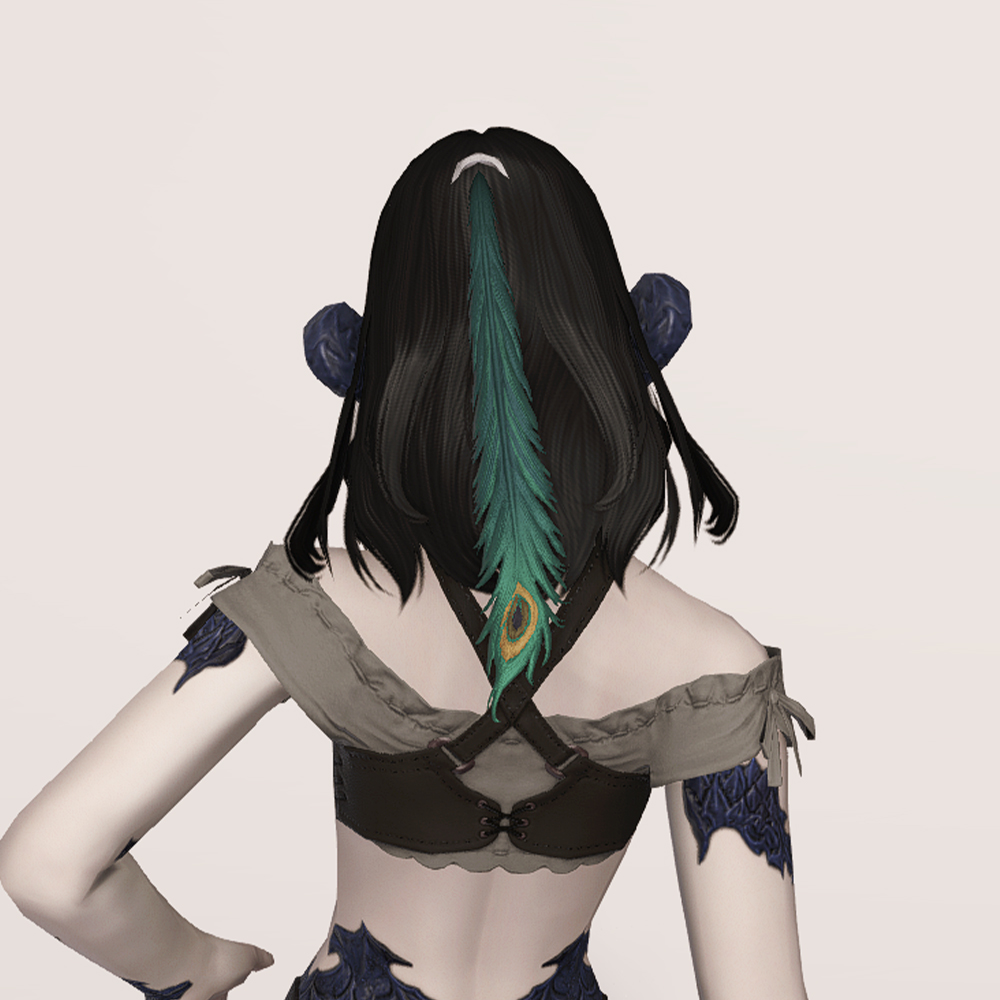 머리에 살짝 걸치게 쓰는 좁은 띠 형태의 금속관, 서클릿입니다. 제사장, 무녀, 주술사 등이 떠오르는 디자인으로 머리 뒤쪽의 공작 깃털 장식이 눈에 띕니다. 헤어스타일이나 아우라 종족의 뿔 종류에 따라 앞쪽의 구슬과 술 장식이 귀걸이처럼 보이기도 합니다.