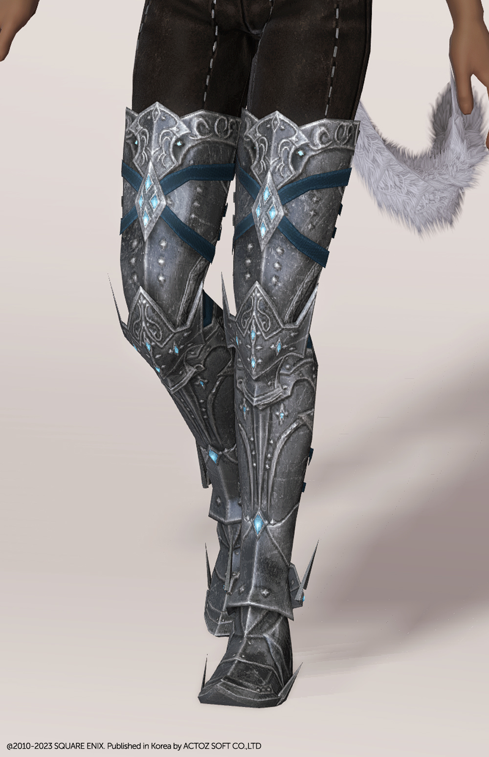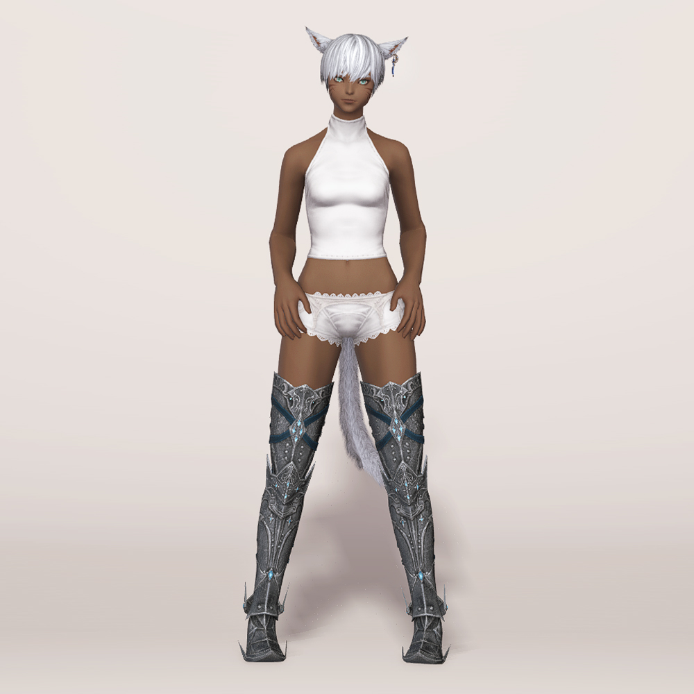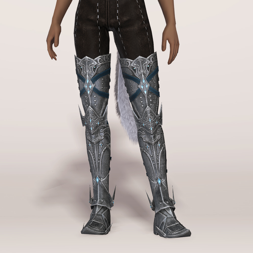 6.3 업데이트 환희의 신역 에우프로시네에서 만나볼 수 있는 허벅지까지 올라오는 판금장화입니다. 장화 뒷부분이 끈장식으로 단단히 고정되어있어 전투시에도 든든합니다. 전체적으로 디테일이 상당해 타 갑주 시리즈의 디자인과 밀도 차이가 크다보니 같이 조합해서 입는 것은 살짝 어려운 점이 있습니다. 하지만 룩 조합에 자신있는 모험가분들이라면 충분히 매치 가능하지 않을까 생각됩니다.