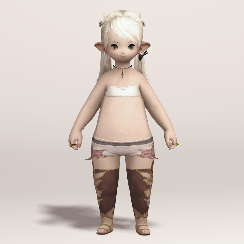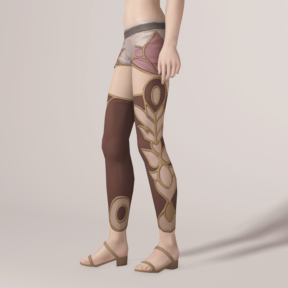 중국 신화에 등장하는 신, 나타를 모티브로 만들어진 의상입니다. 핫팬츠와 사이하이삭스의 조합으로 스포티한 매력이 있으며, 연꽃잎 또는 불꽃같은 무늬가 개성 있어 눈에 띕니다. 얼핏 보면 허벅지와 종아리 부분이 뚫려 맨살이 노출된 것처럼 보이지만, 살구색 천이 덧대어진 것입니다.