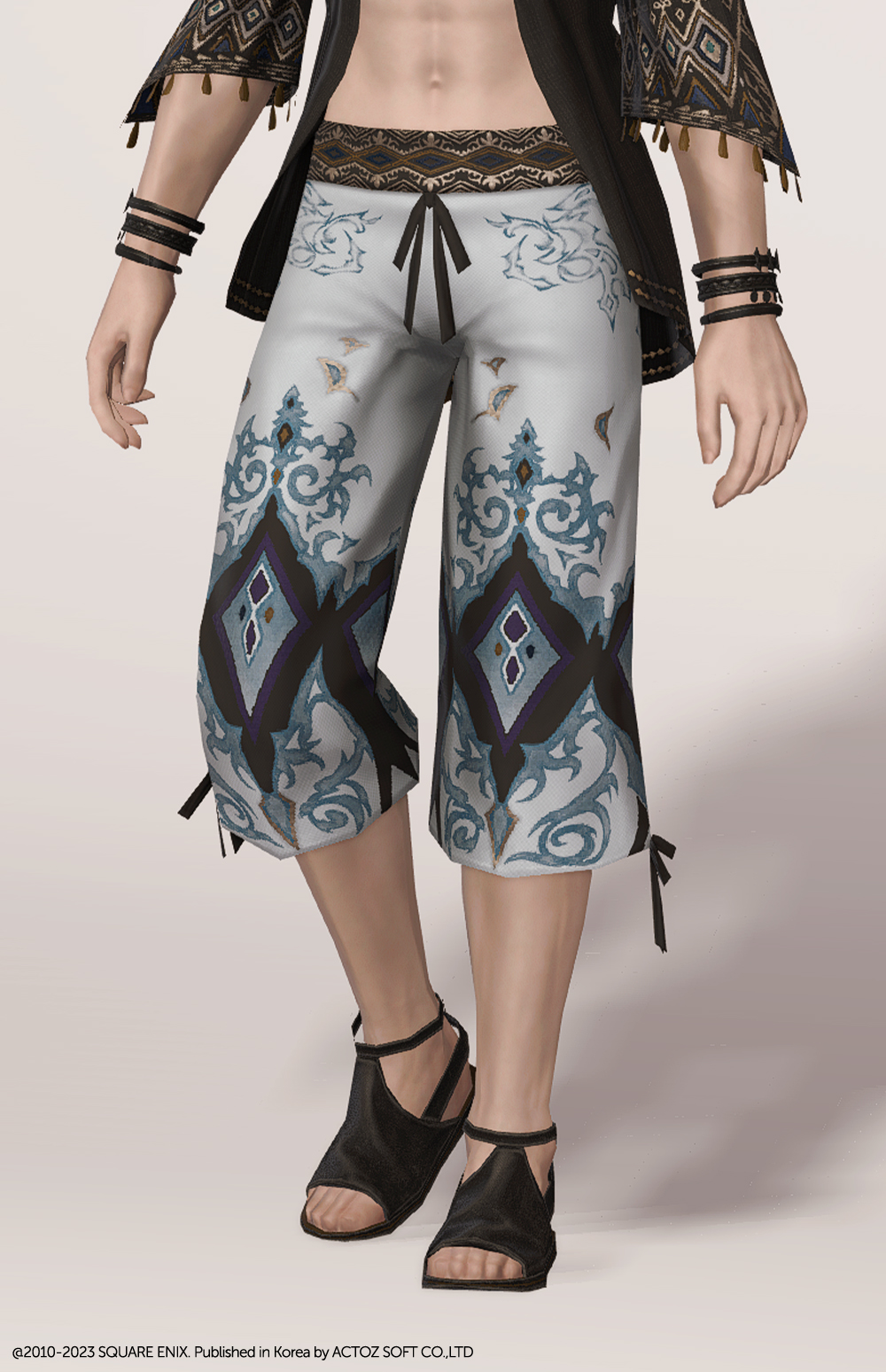 시원한 바다를 거닐기 좋은 느낌의 화려한 패턴이 새겨진 하늘하늘한 소재의 7부 트렁크 바지입니다. 허리띠부분이 금장장식으로 화려하게 장식되어있으며 바지 끝이 리본장식으로 되어있어 캐주얼한 느낌을 더했습니다.