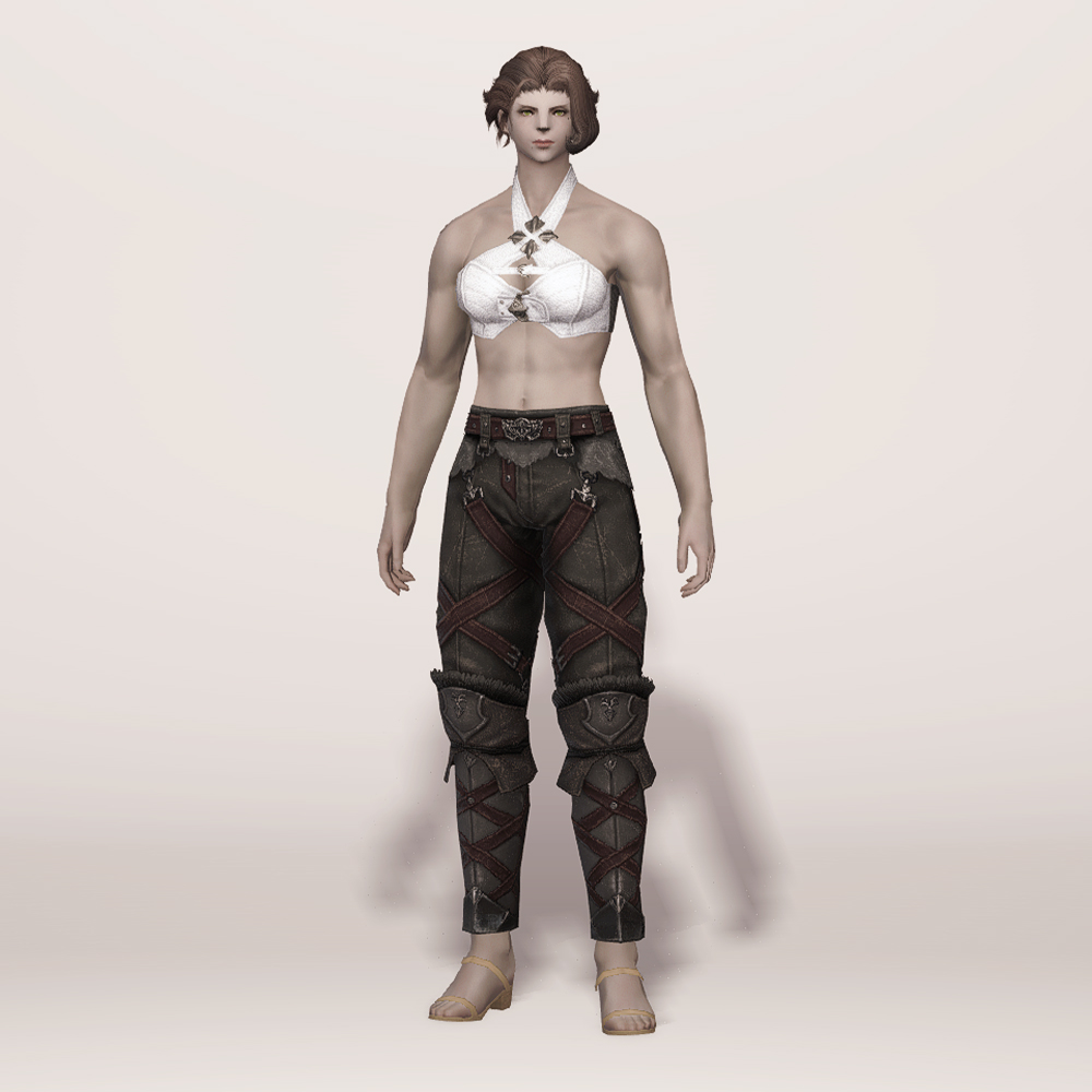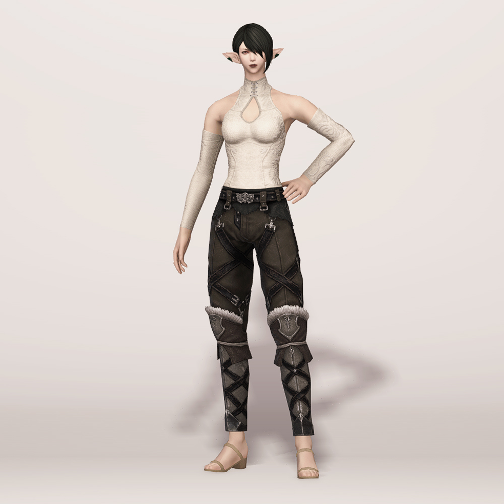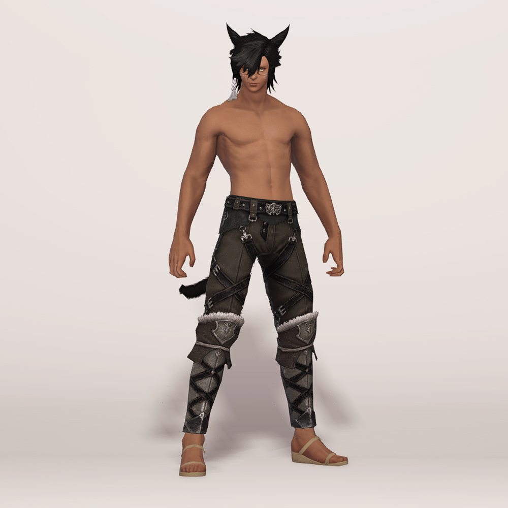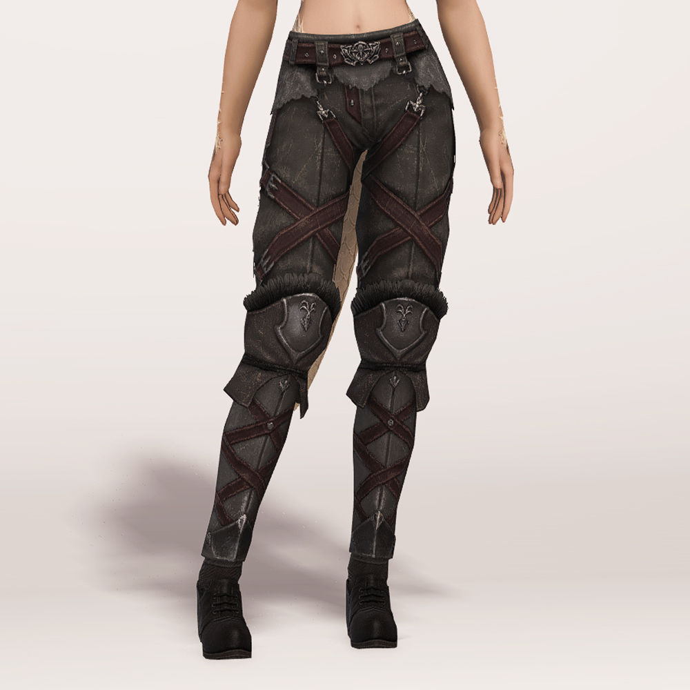 깔끔한 슬랙스 위에 가죽과 금속으로 제작된 종아리 보호대를 덧대어 니하이 부츠를 착용한 듯한 핏을 연출하는 하의입니다. 허리에 얇은 가죽을 덧대고 그 위에 벨트를 매 지저분하지 않고 깔끔하며, 허벅지와 종아리에 엑스 자 모양의 스트랩을 둘러 포인트를 줘 밋밋하지 않습니다. 동시에 다리 핏까지 잡아줘 부해 보이지 않고 깔끔해 매력적입니다. 트로이아 수호자 장비 디자인이 워낙 잘 나와 세트 그대로 입는 것을 제일 추천하지만 클라우드 조끼, 동방 술사의 팔장식 등과 같이 스트랩이 많은 의상과 매치하면 꽤나 잘 어울립니다.