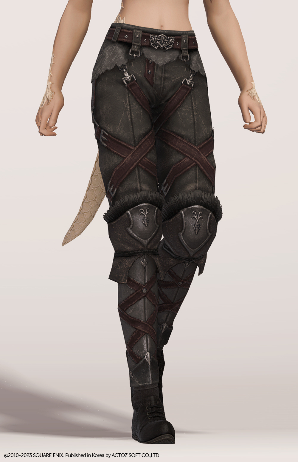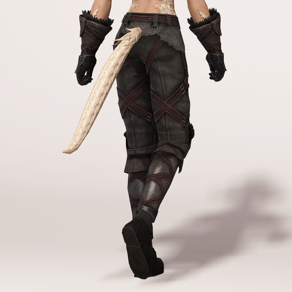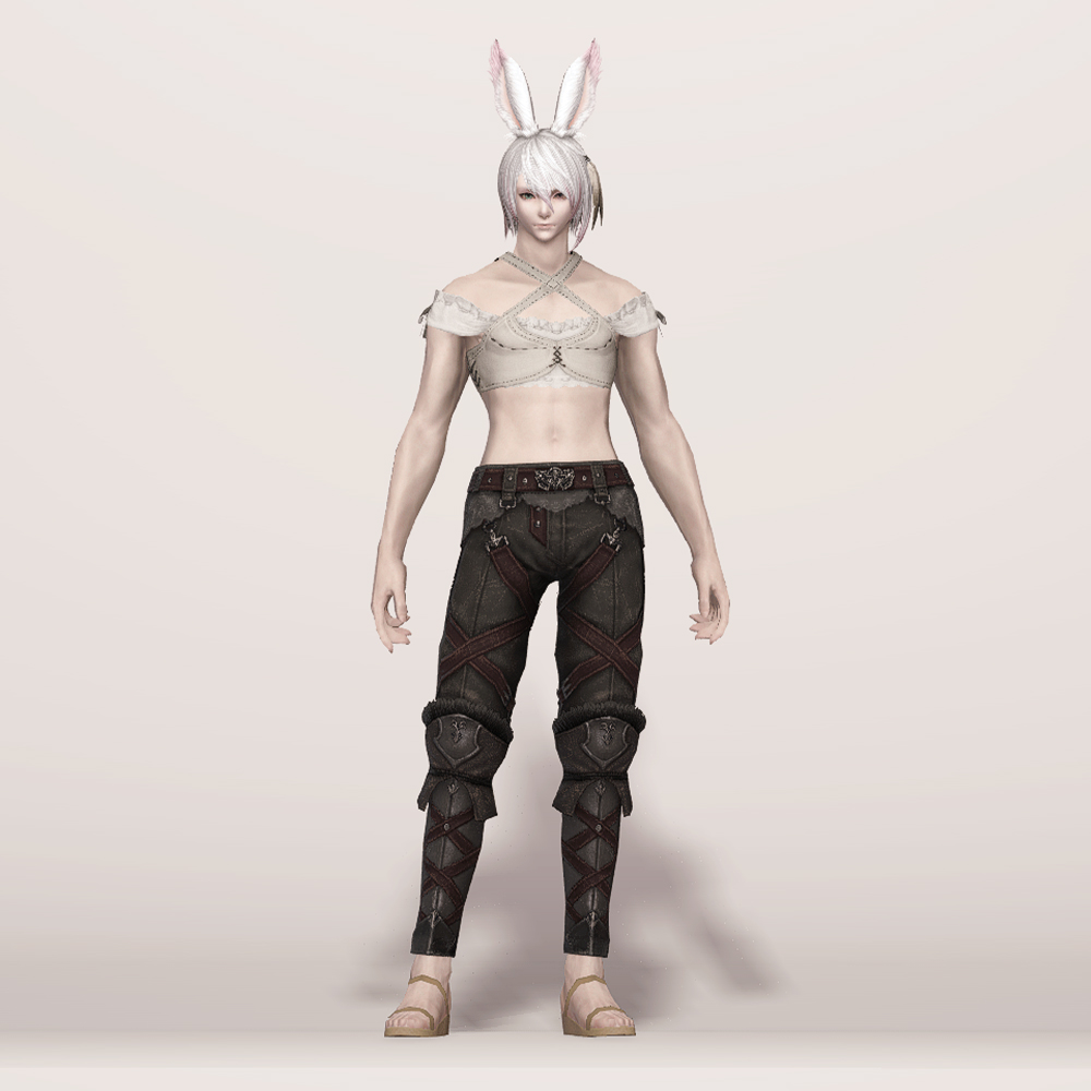 깔끔한 슬랙스 위에 가죽과 금속으로 제작된 종아리 보호대를 덧대어 니하이 부츠를 착용한 듯한 핏을 연출하는 하의입니다. 허리에 얇은 가죽을 덧대고 그 위에 벨트를 매 지저분하지 않고 깔끔하며, 허벅지와 종아리에 엑스 자 모양의 스트랩을 둘러 포인트를 줘 밋밋하지 않습니다. 동시에 다리 핏까지 잡아줘 부해 보이지 않고 깔끔해 매력적입니다. 트로이아 수호자 장비 디자인이 워낙 잘 나와 세트 그대로 입는 것을 제일 추천하지만 클라우드 조끼, 동방 술사의 팔장식 등과 같이 스트랩이 많은 의상과 매치하면 꽤나 잘 어울립니다.