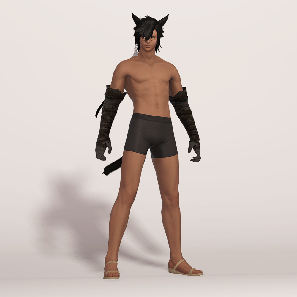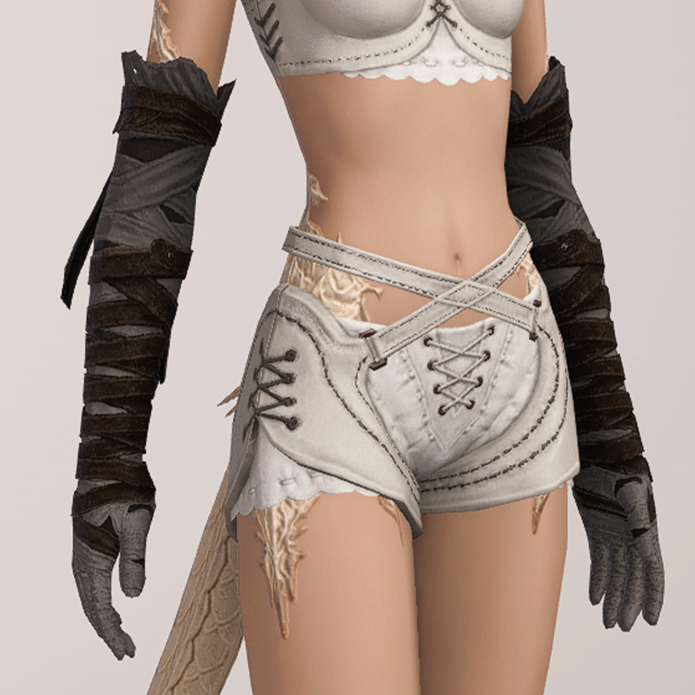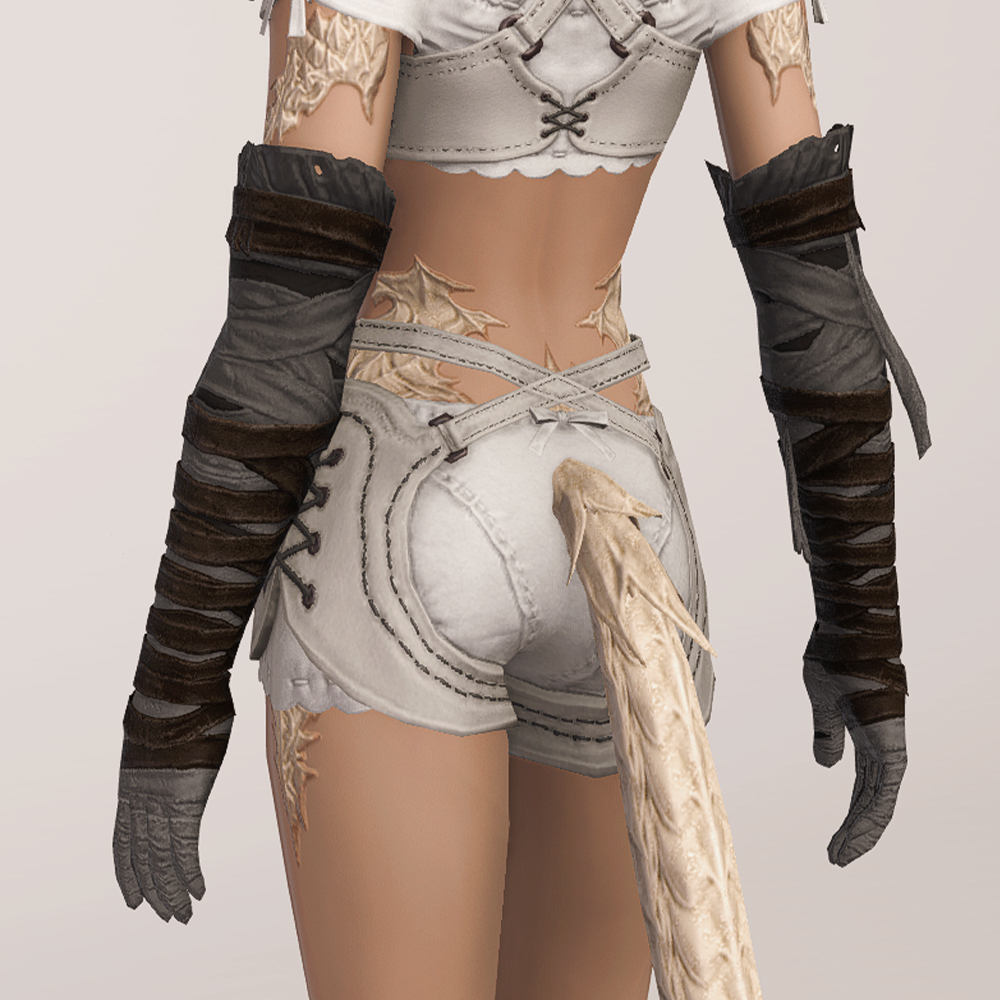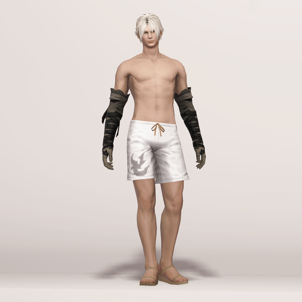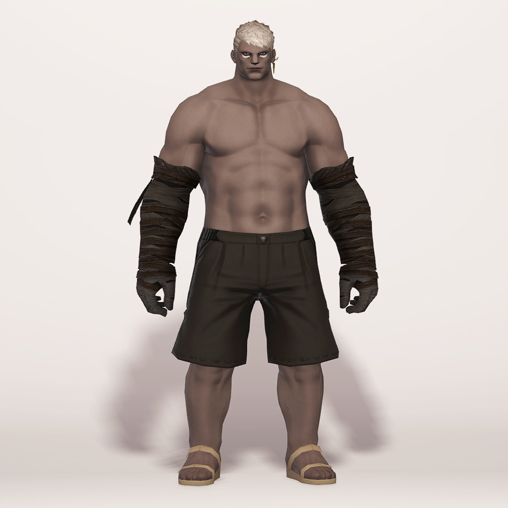 트로이아 유격대 붕대처럼 짙은 색의 붕대와 가죽끈을 팔꿈치 위까지 감아놓았습니다. 팔에 딱 맞게 감은 붕대답게 핏이 상당히 슬림해서, 마찬가지로 얇은 핏이나 활동성이 높은 간결한 옷차림에 잘 어울립니다.
