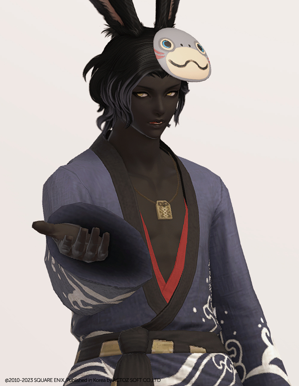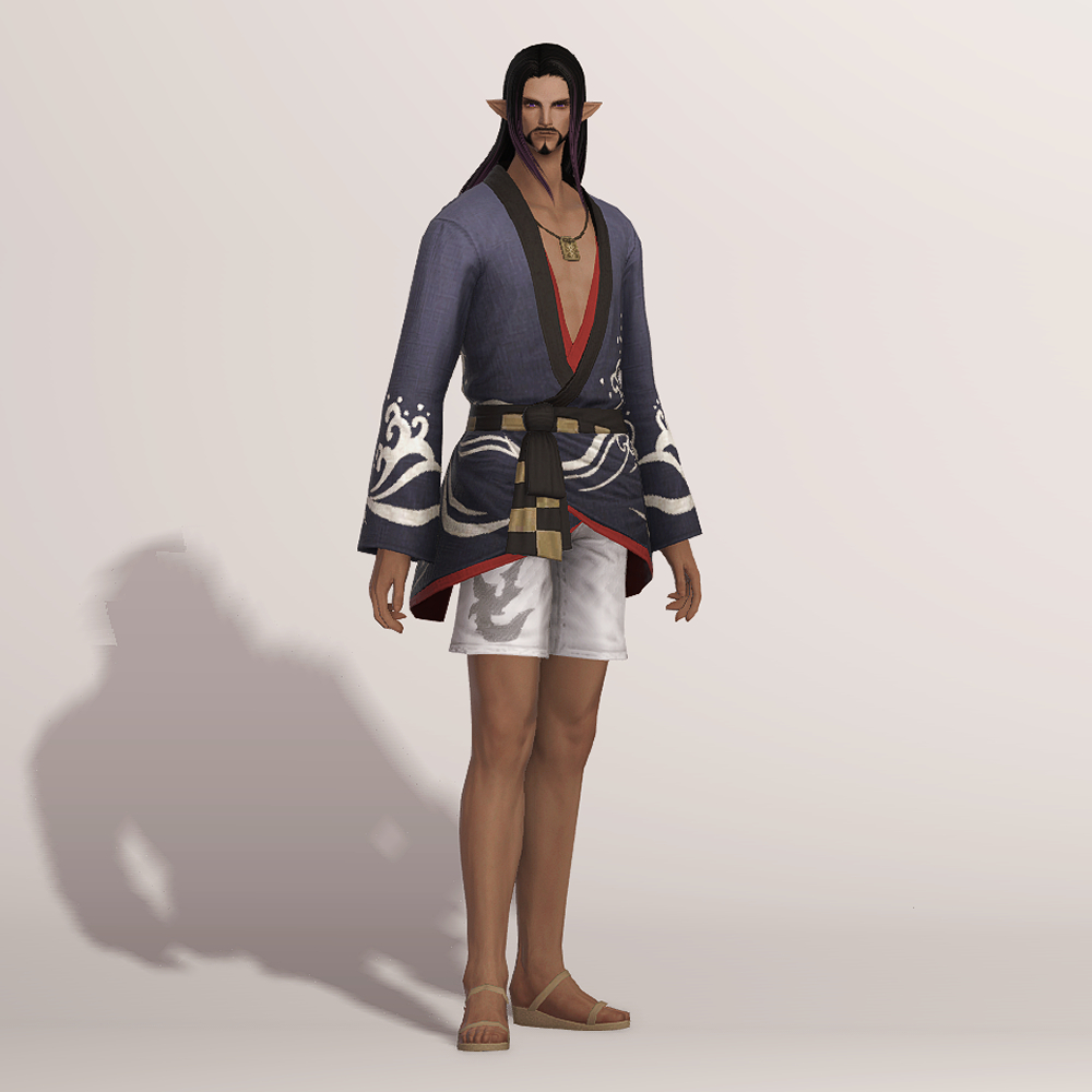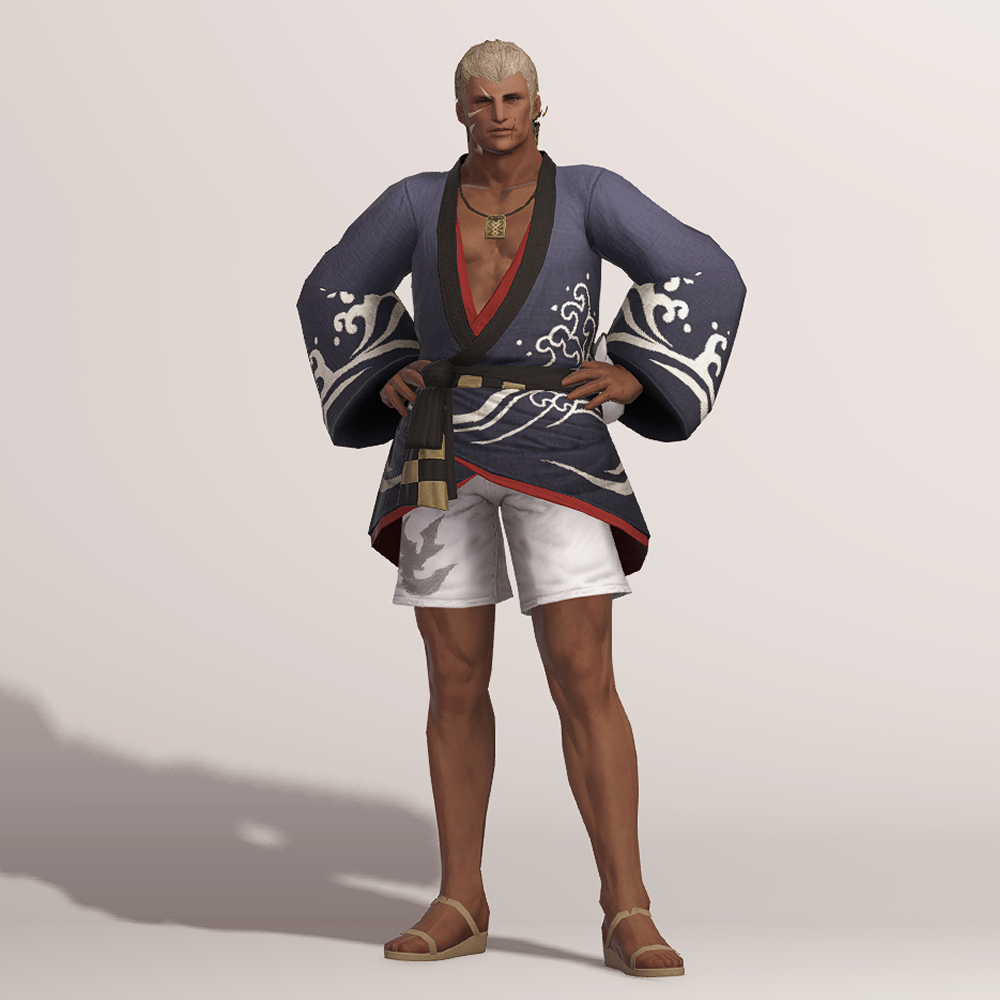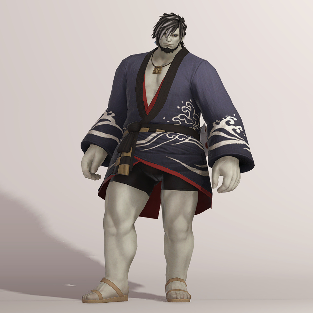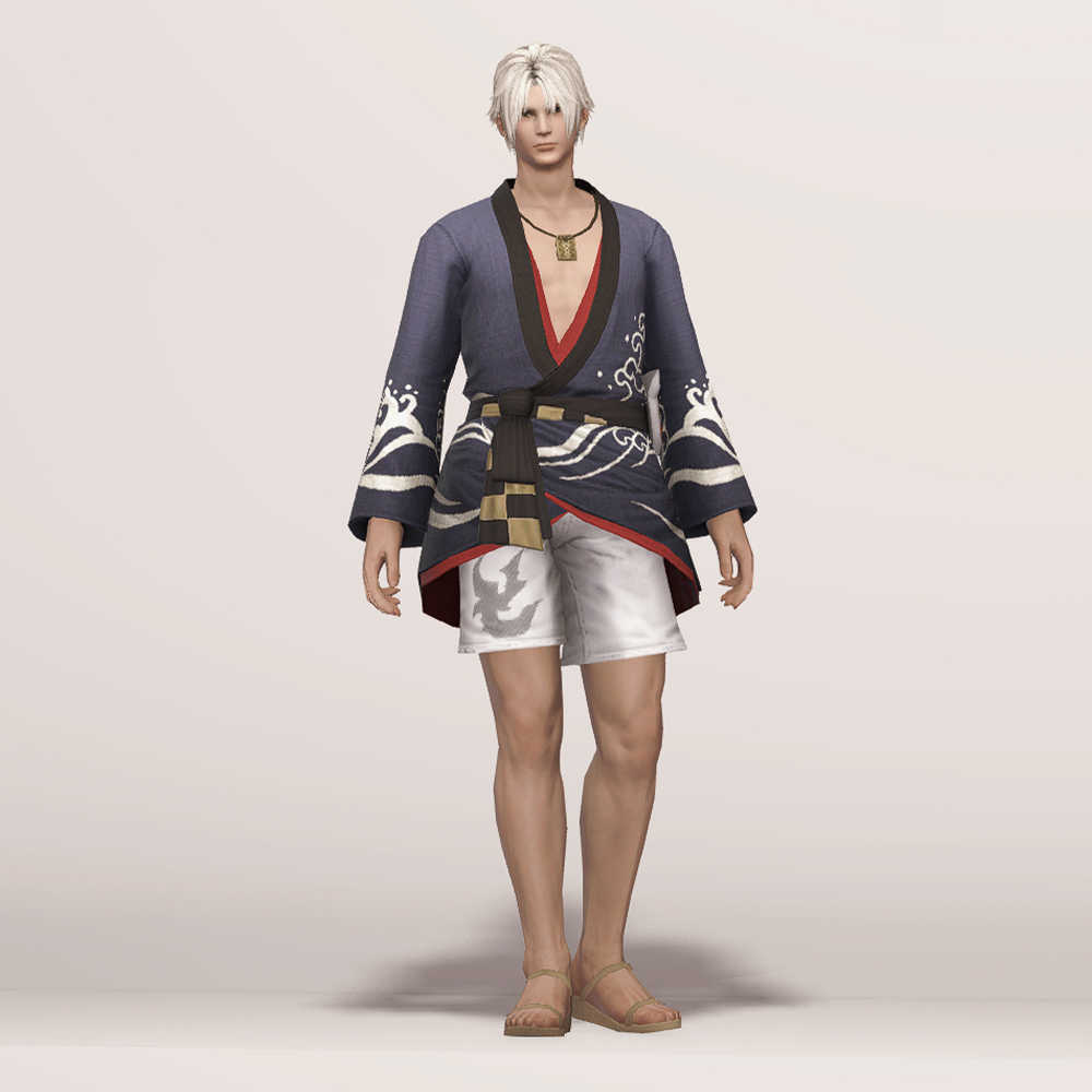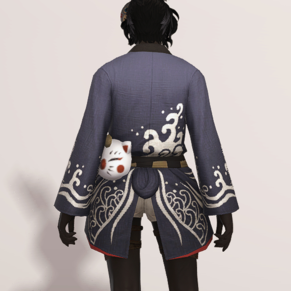 일본풍 특유의 느낌을 살린 흰색 파도 문양과 함께 시원하게 드러낸 가슴이 눈에 띄는 유카타입니다. 나무로 된 오마모리 목걸이와 허리 뒤쪽의 하얀 모그리 가면 장식이 포인트로 남성용 잠방이와 모그리/나마즈오 가면과 매치하면 예쁜 여름축제 코디가 완성됩니다.