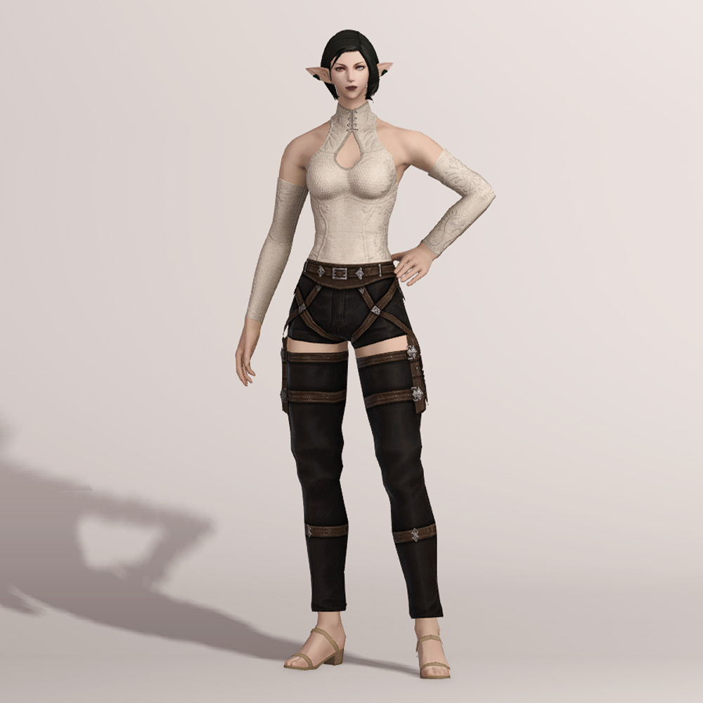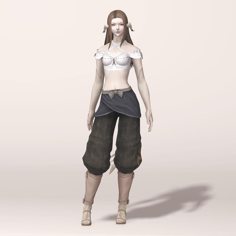 동방풍의 넉넉한 바지, 그러나 투사라는 사용자의 특성에 맞추어 무릎 밑에 천을 덧대어 단단히 고정시켜, 행동에 방해되지 않게 마무리 지은 디테일이 좋은 하의입니다. 사용감이 짙게 느껴지며, 자칫 밋밋해 보일 수 있는 점을 보안하듯 허리께에도 천을 덧대어 예쁘게 동여맨 허리띠와 왼쪽 무릎 옆의 휘몰아치는 형상의 금색 자수가 포인트입니다. 허리를 드러낸 옷이어도, 가린 옷이어도 무난하게 매치가 가능합니다.