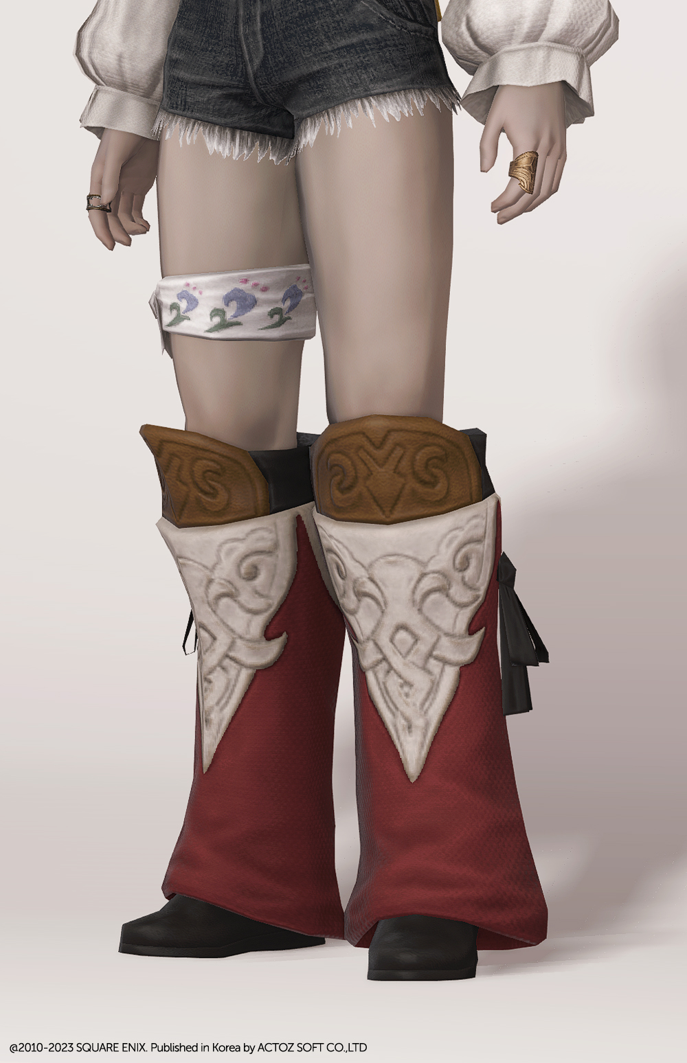 순백색으로 염색시 레그워머로 사용하기 좋은 장화입니다. 허전하지 않게 누름장식이 들어간 가죽 장식과 함께 리본장식이 사랑스러운 느낌을 좀더 더해주는 레그워머 타입의 장화입니다. 짧은 하의, 치마 등 오버핏의 상의와 조합하는 것을 추천드립니다.