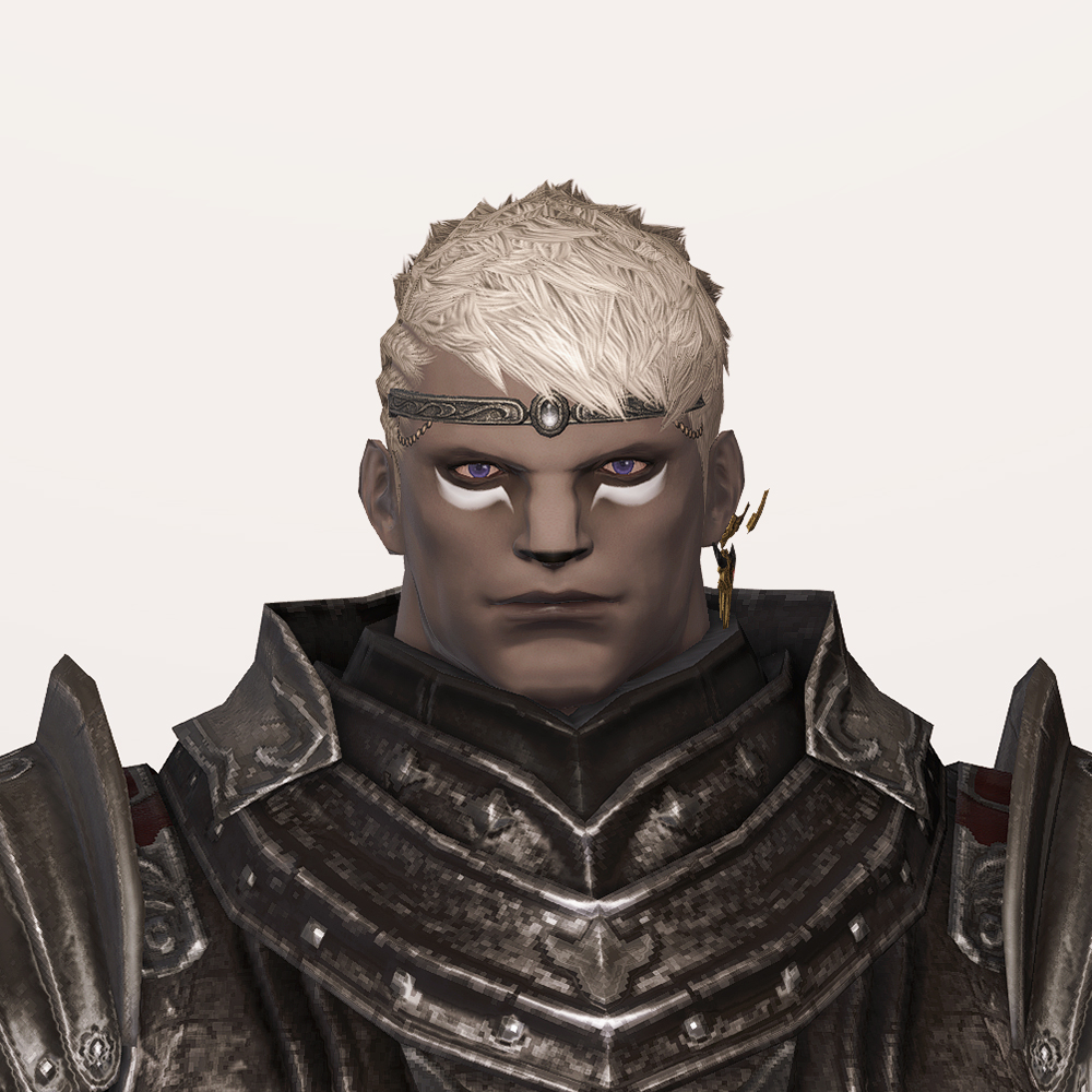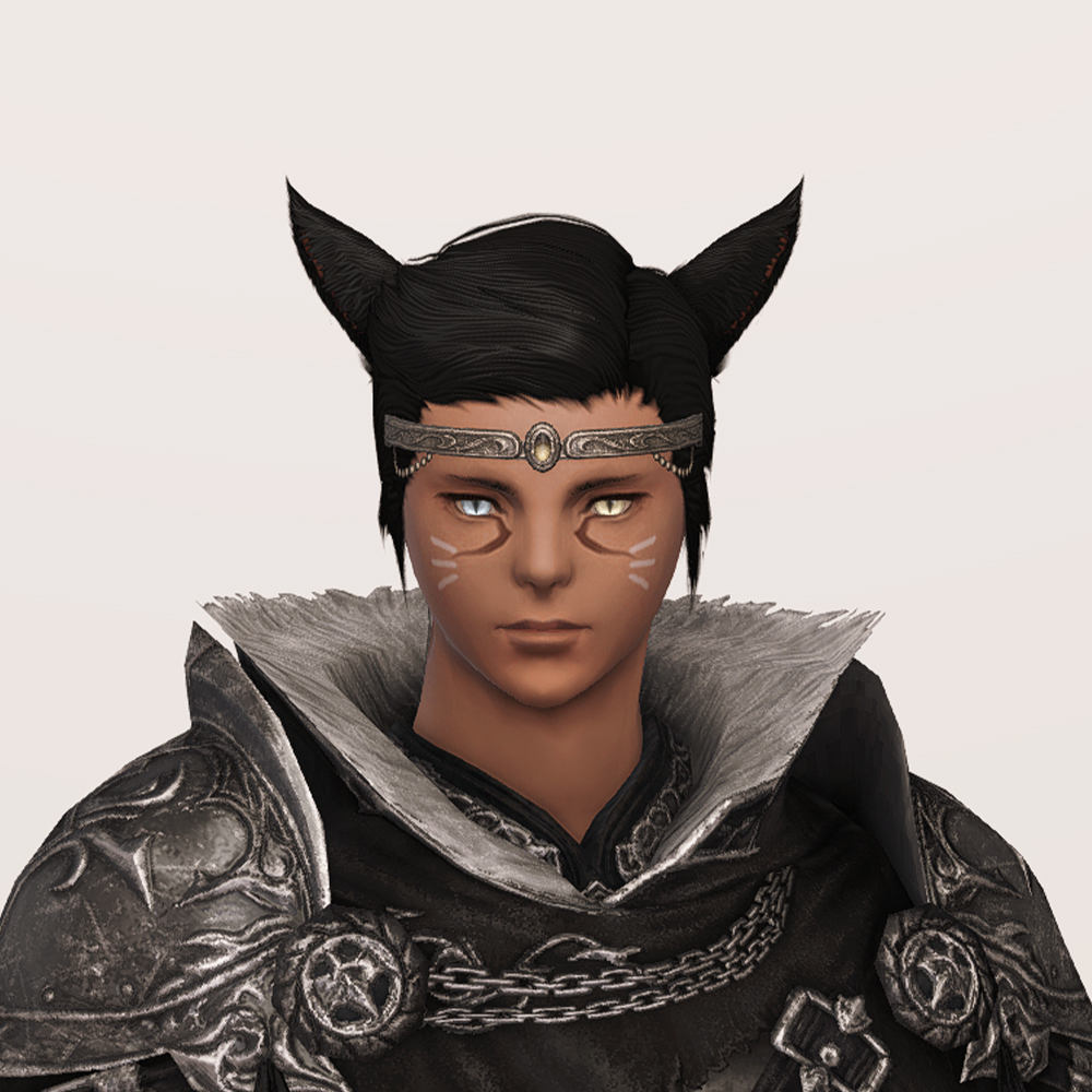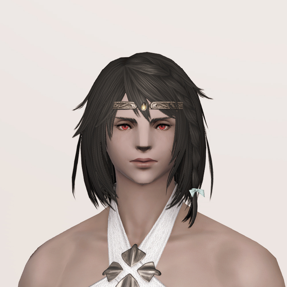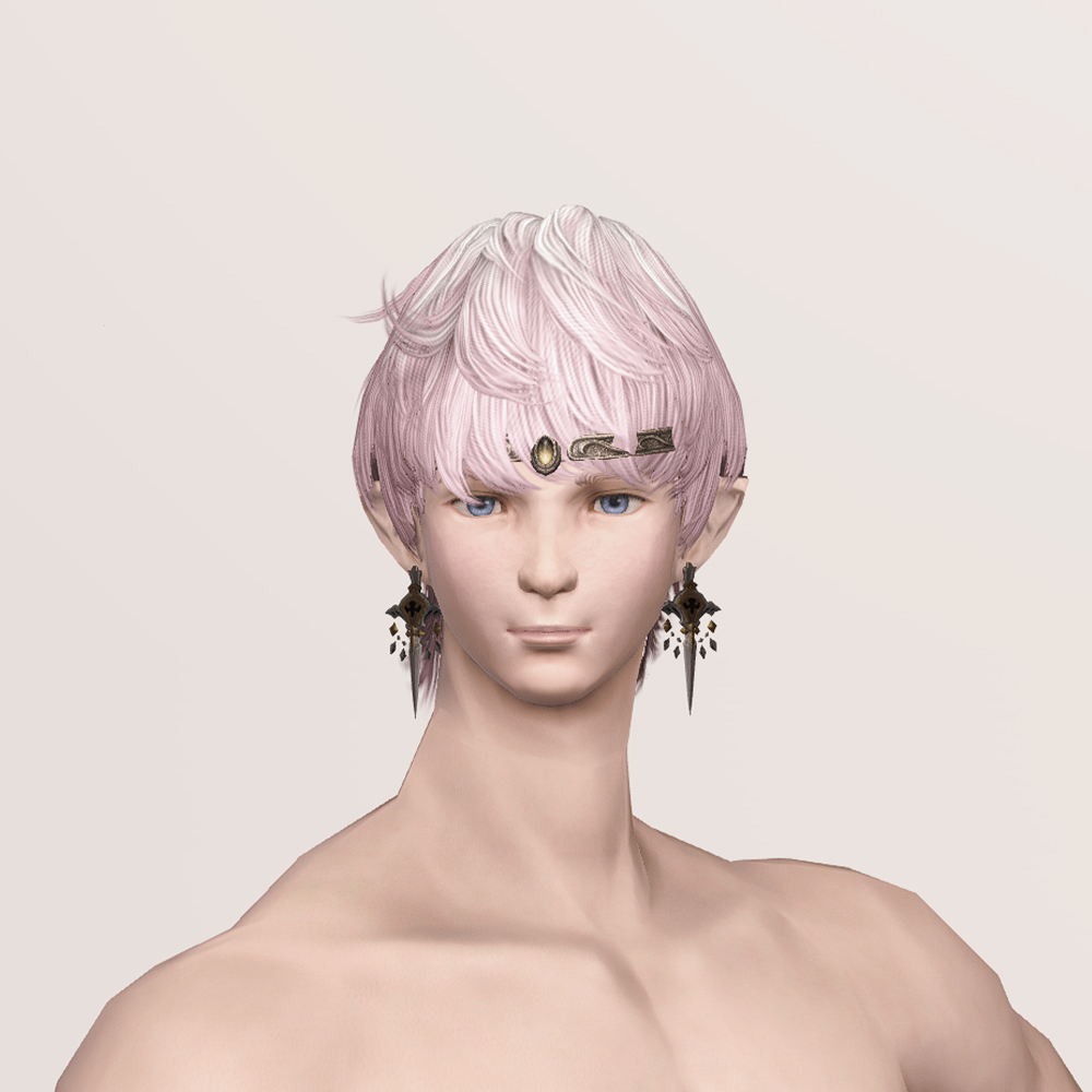 머리에 살짝 걸치게 쓰는 좁은 띠 형태의 금속관, 서클릿입니다. 언뜻 보면 투박해 보일지 몰라도, 검은색 빛이 살짝 도는 흰색 보석을 중심으로 양옆으로 뻗어 둘러진 금속 끝의 볼체인과 생각보다 디테일하게 새겨진 문양이 고급스러움을 자아내 계속해서 눈이 가는 매력적인 머리장식입니다. 앞머리가 있는 경우 서클릿과 장식이 묻혀 조금만 보입니다.