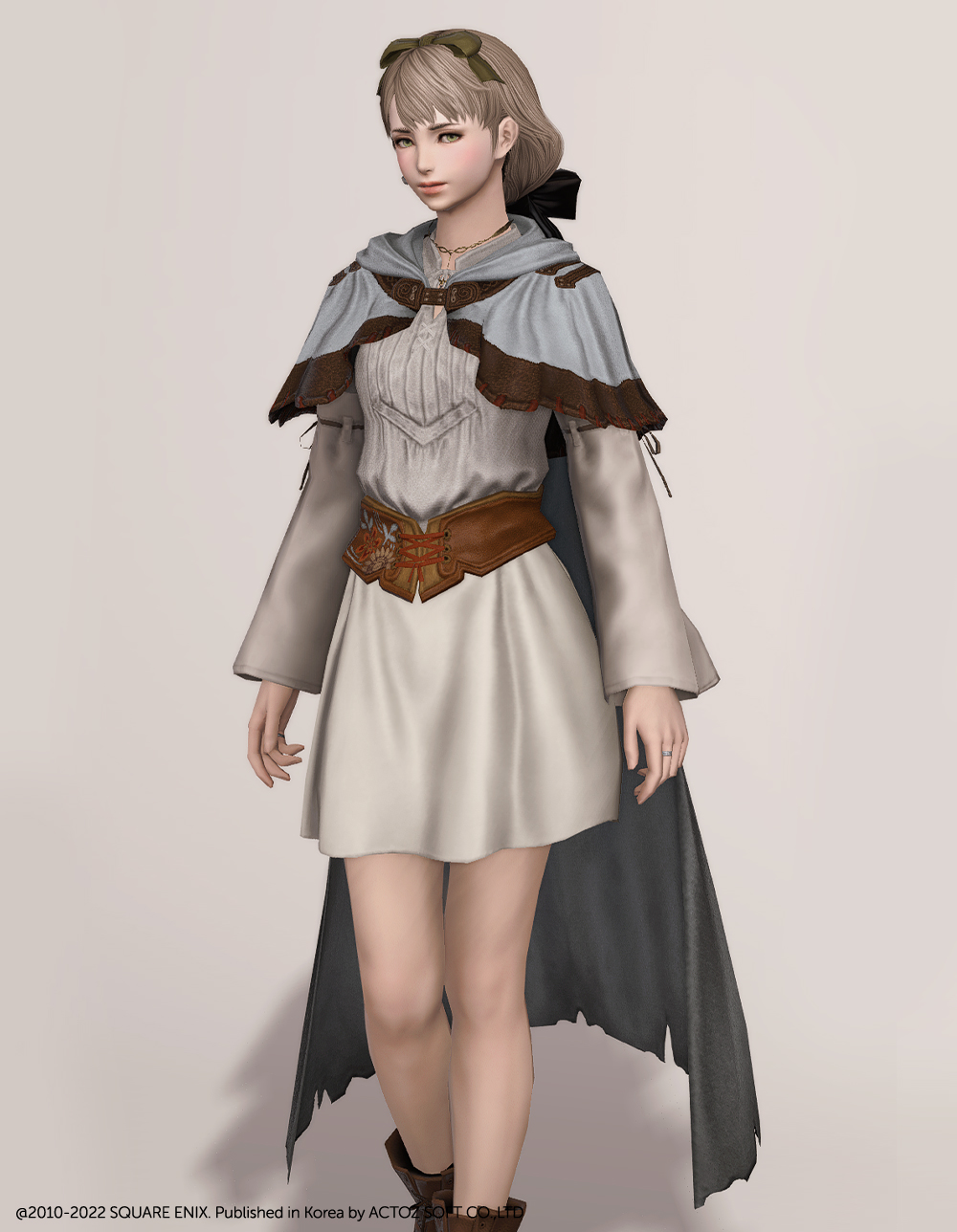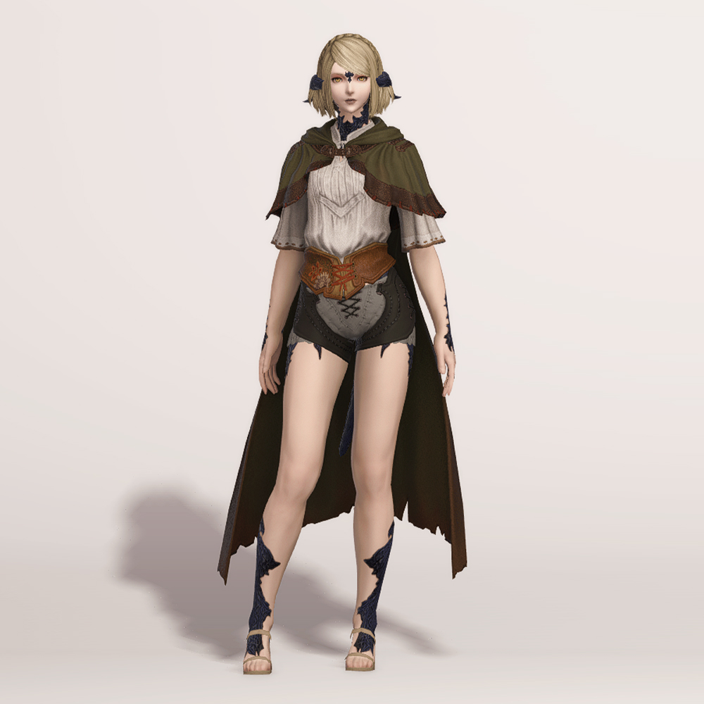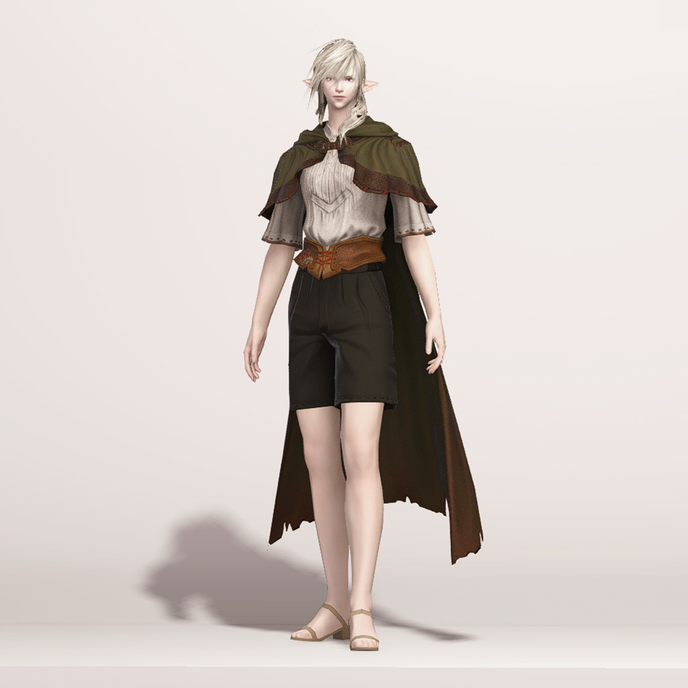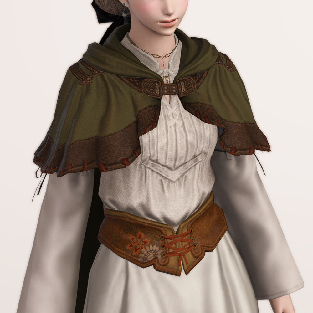 일상복 코디를 좋아하신다면, 절대로 놓치면 안될 케이프망토입니다. 어깨에 잡힌 러플부터 허리의 가죽에 놓인 꽃무늬까지 놓칠 부분이 없는 디테일이 가득합니다. 원래 짧은 소매 옷이나 사베네어 팔덮개, 고위 소환사 팔덮개(두더지 색으로 염색시 염색X의 블라우스색과 동일)등 소매가 긴 팔 장식 아이템과 매치하는 것도 추천드립니다.