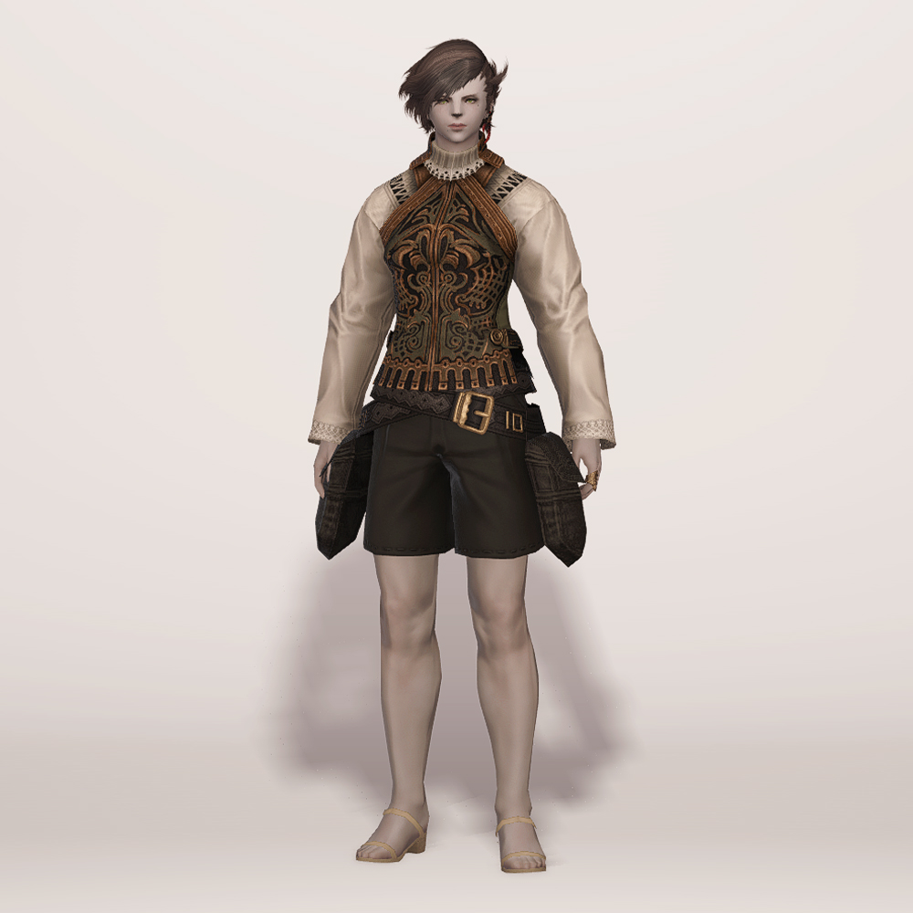 FFXII 발프레아의 의상 디자인을 따왔습니다. 어깨측에 이중으로 덧댄 안감을 노출시킨 셔츠 위로 황동색의 자수가 인상적인 조끼를 겹쳐입인상적인 상의입니다. 허리에서 골반으로 두꺼운 벨트를 교차시켜 여분의 작은 가방을 매단 디테일이 좋습니다. 주인이 있는 옷이라지만, 허리 라인을 깔끔하게 잡아주는 매력적인 조끼를 중심으로 브라운톤의 옷을 매치하여 고풍스러운 느낌의 코디에 조합하는 것을 추천드립니다.