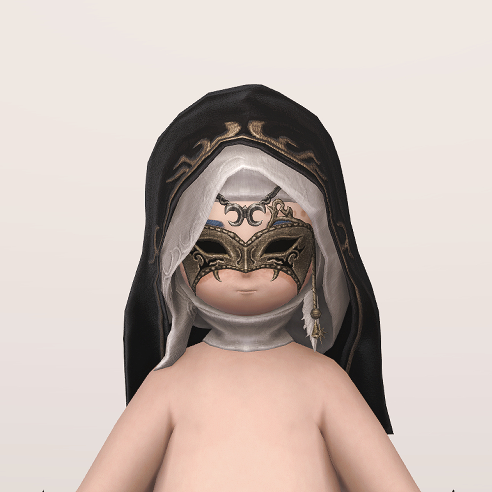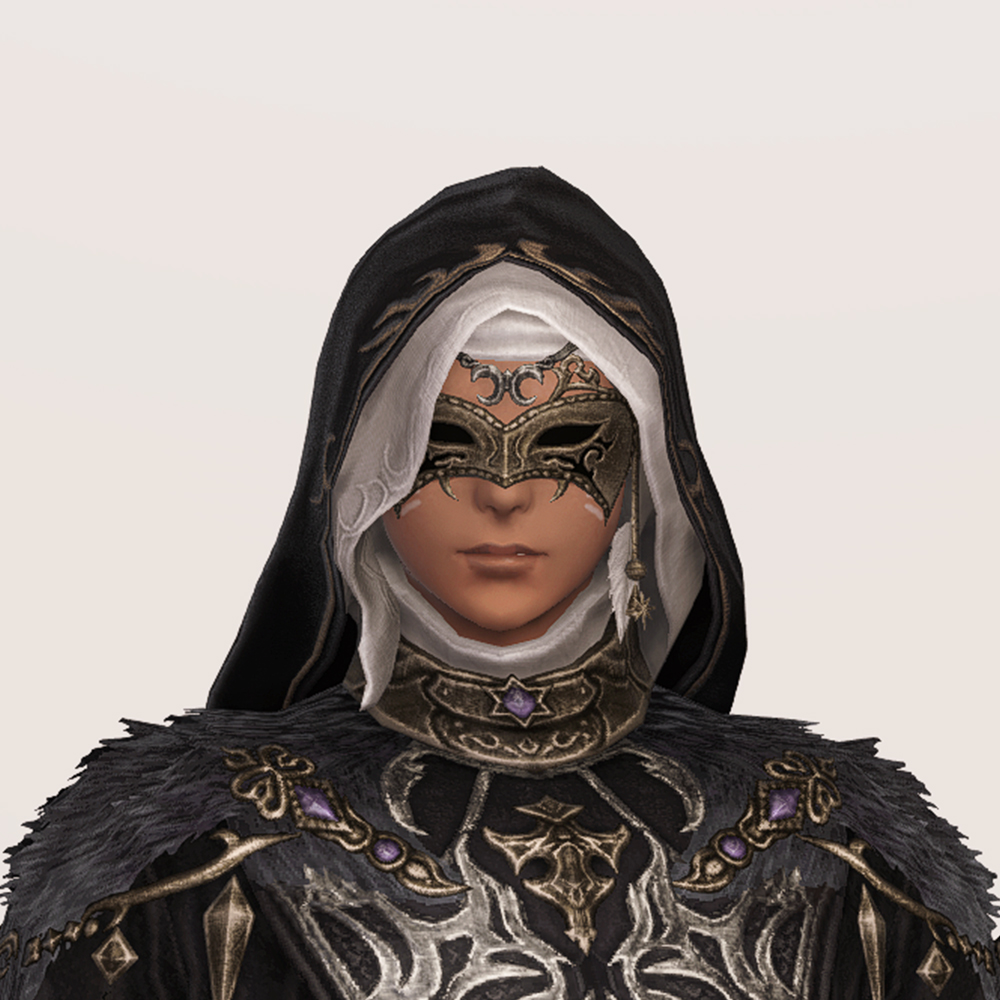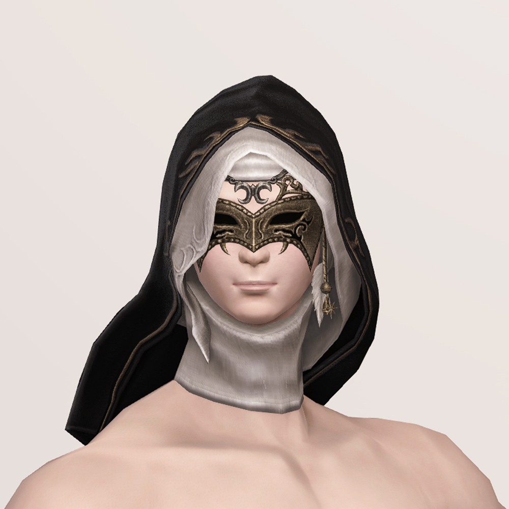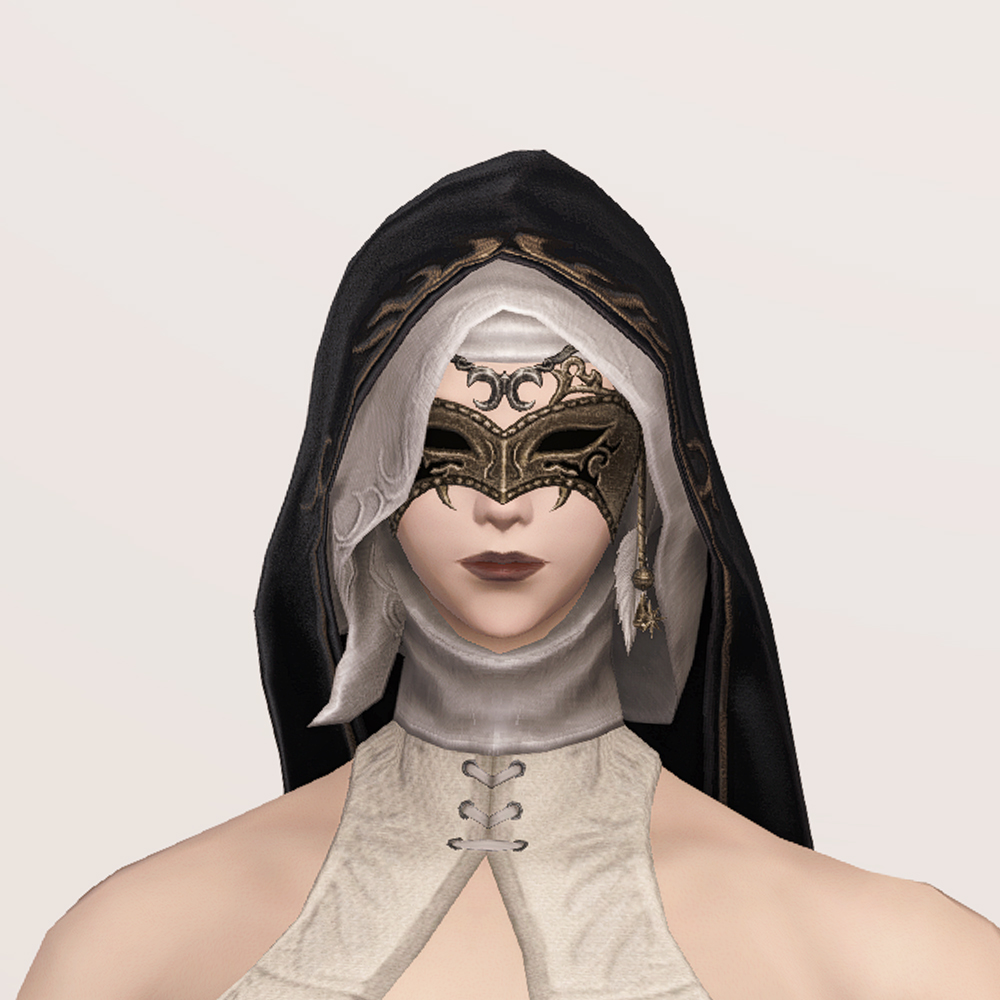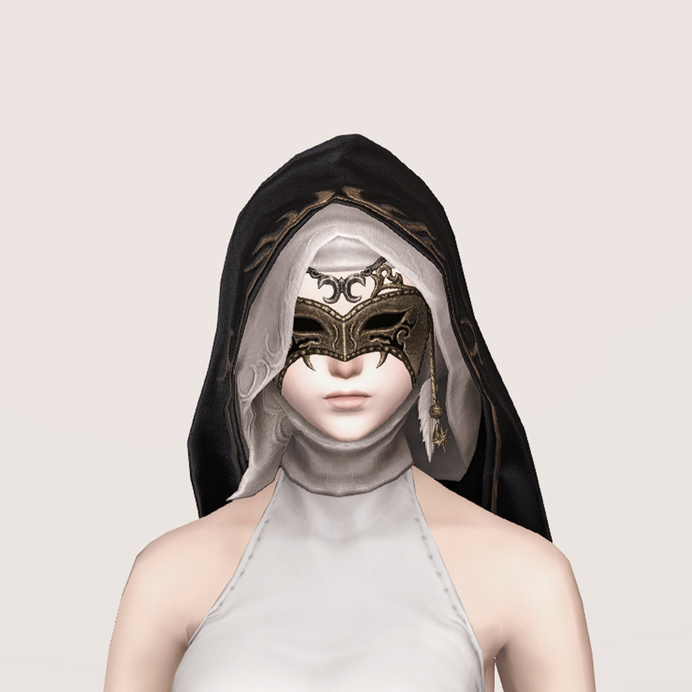 고풍스럽고 화려하며 동시에 무게감있는, 그야말로 앤틱함 그 자체의 디자인의 두건입니다. 두건의 겉과 안감 양쪽 다 곡선형의 자수가 들어가 고급스러운 디테일이 살아있습니다. 이마 위를 지나는 금속장식 역시 포인트. 여기에 신비로움을 더하는 가면은 금속으로 만들어져 있으며, 테두리를 따라 들어간 잔무늬에 더해 매혹적인 느낌을 주는 음각 세공 밑으로 송곳니를 연상시키는 장식이 아찔한 매력을 느끼게 합니다.