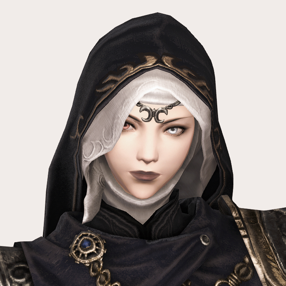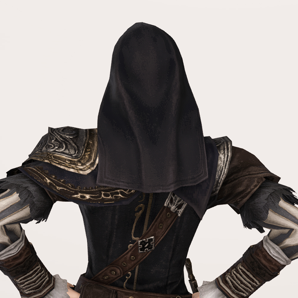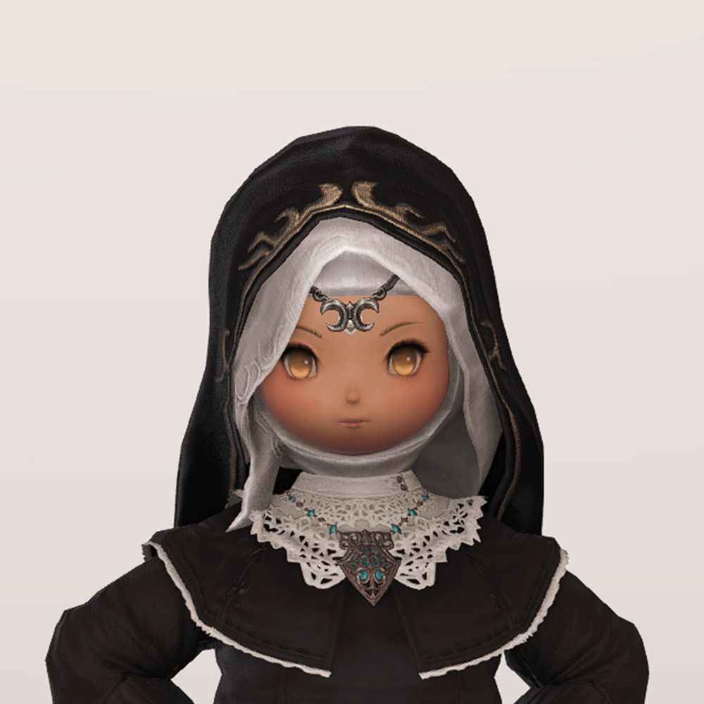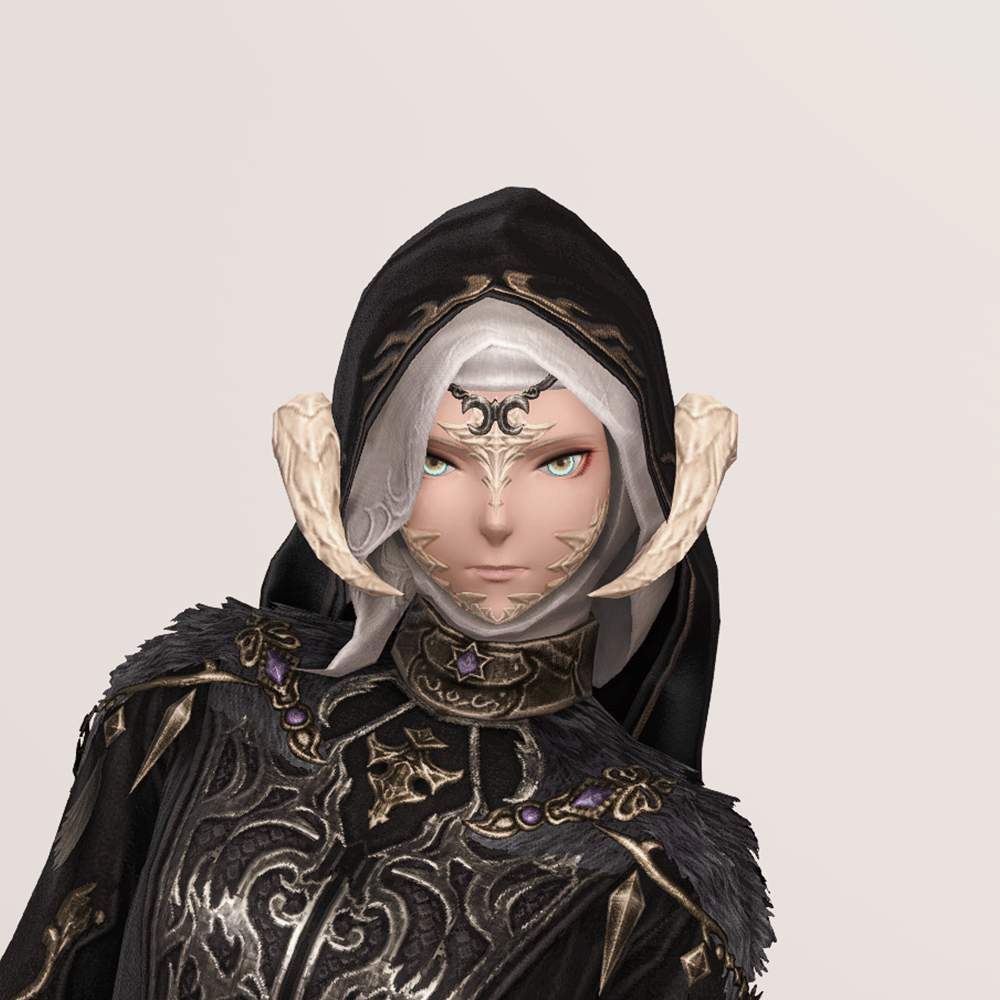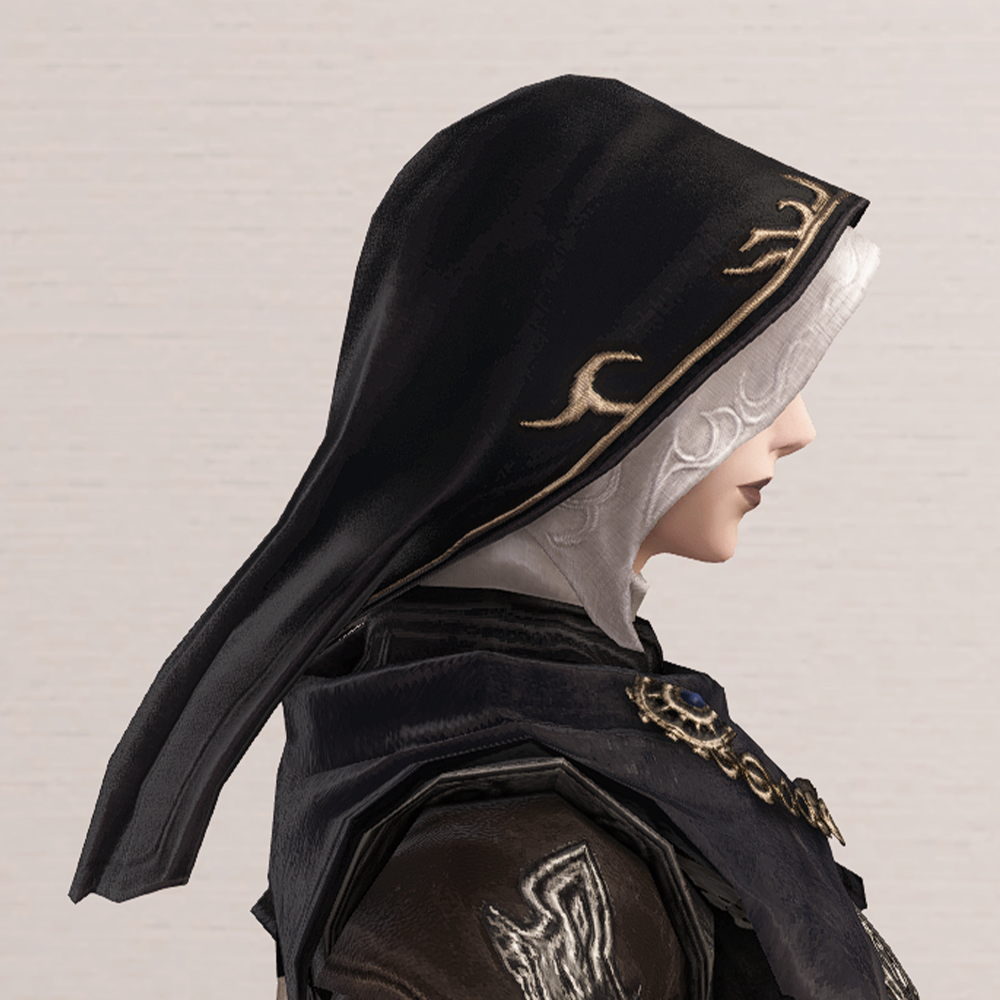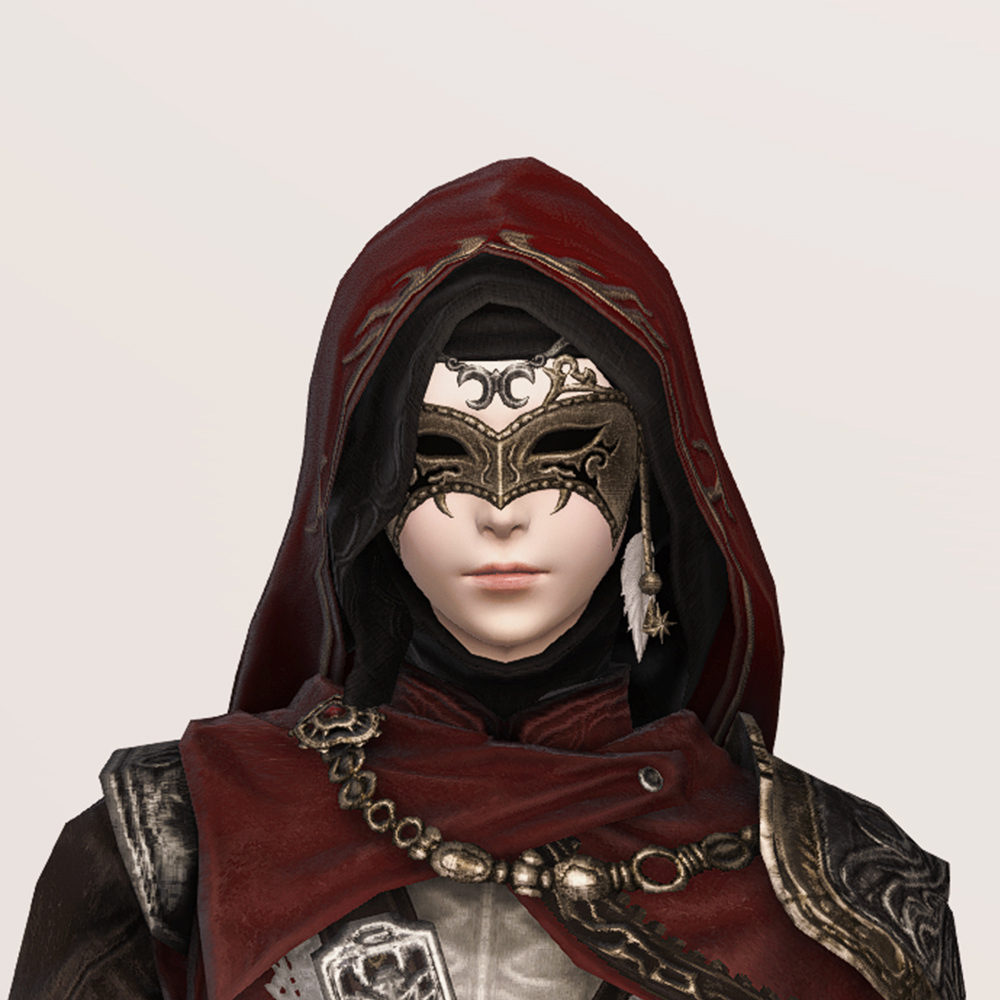 고풍스럽고 화려하며 동시에 무게감있는, 그야말로 앤틱함 그 자체의 디자인의 두건입니다. 두건의 겉과 안감 양쪽 다 곡선형의 자수가 들어가 고급스러운 디테일이 살아있습니다. 이마 위를 지나는 금속장식 역시 포인트. 여기에 신비로움을 더하는 가면은 금속으로 만들어져 있으며, 테두리를 따라 들어간 잔무늬에 더해 매혹적인 느낌을 주는 음각 세공 밑으로 송곳니를 연상시키는 장식이 아찔한 매력을 느끼게 합니다.