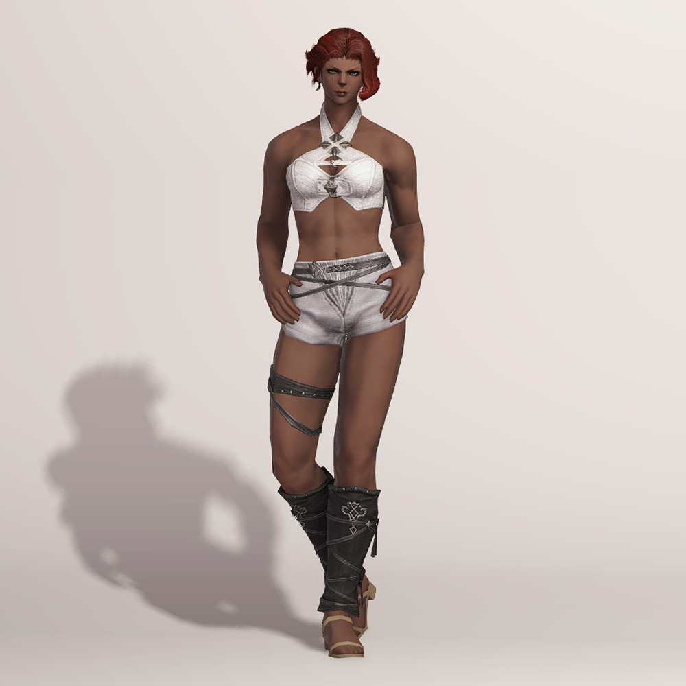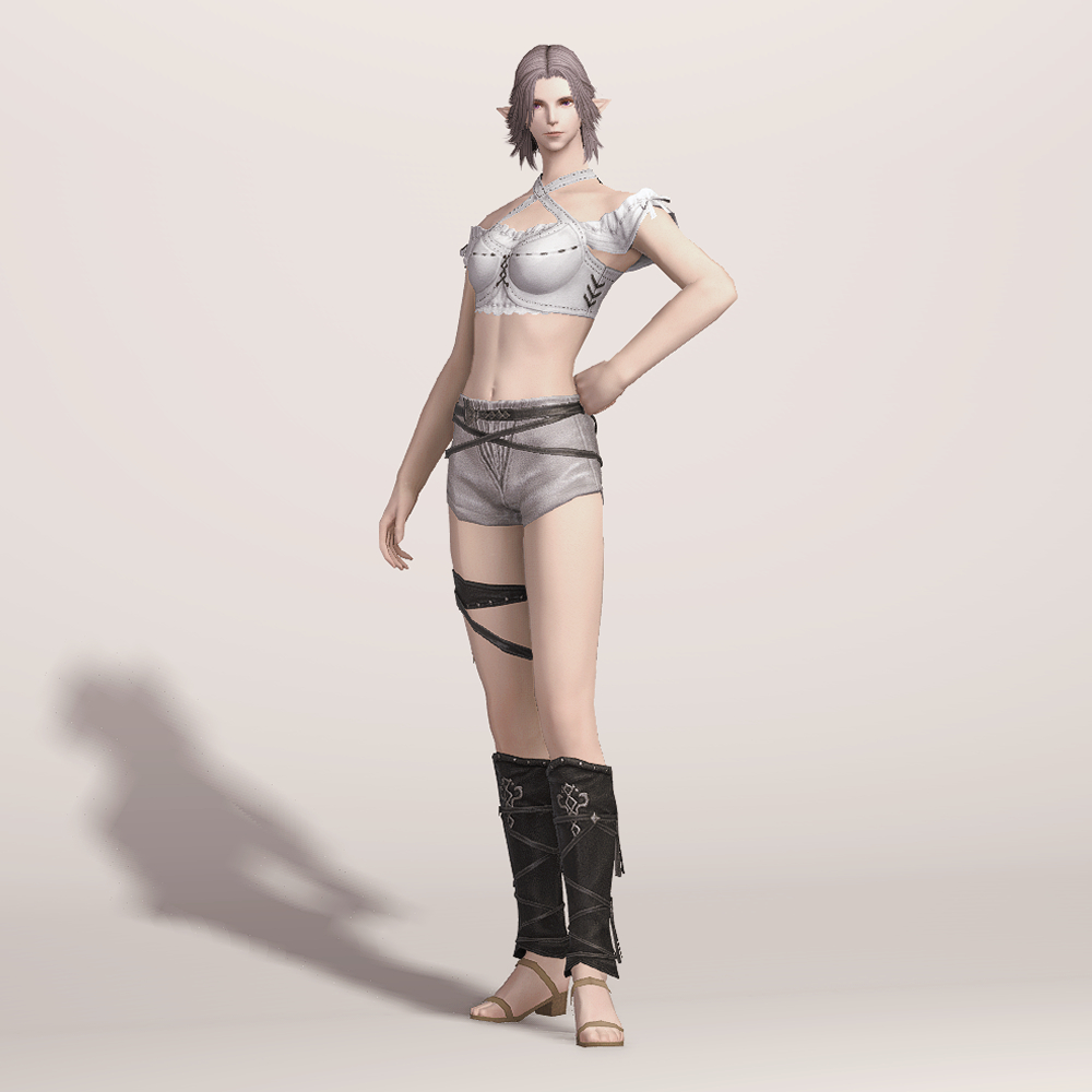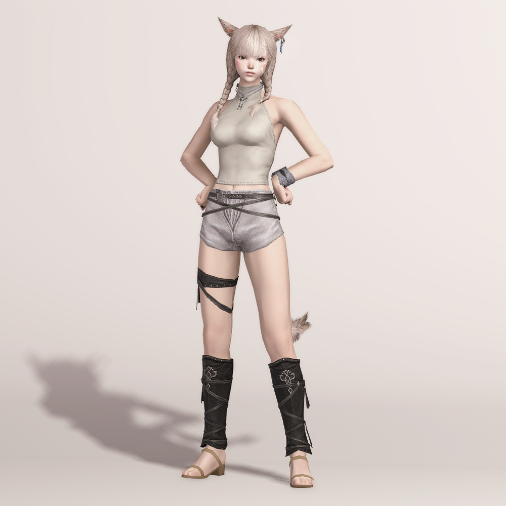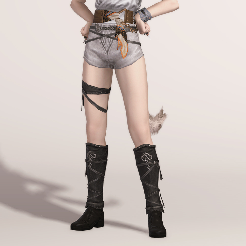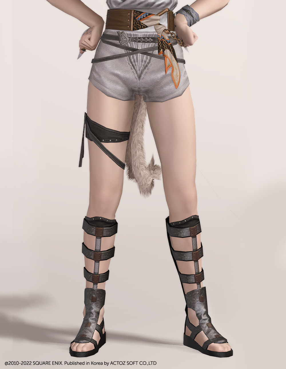 무릎밑까지 종아리 보호대?가 있는 부분이 살짝 코디하기 어려울 수 있으나 장화로 덮어도 괜찮고, 섬네일에서는 군화(투사 12렙)을 염색하여 깔끔하게 조합한 모습입니다. 시원한 샌들 조합이 세트처럼 보일정도로 멋진 코디라 생각합니다.