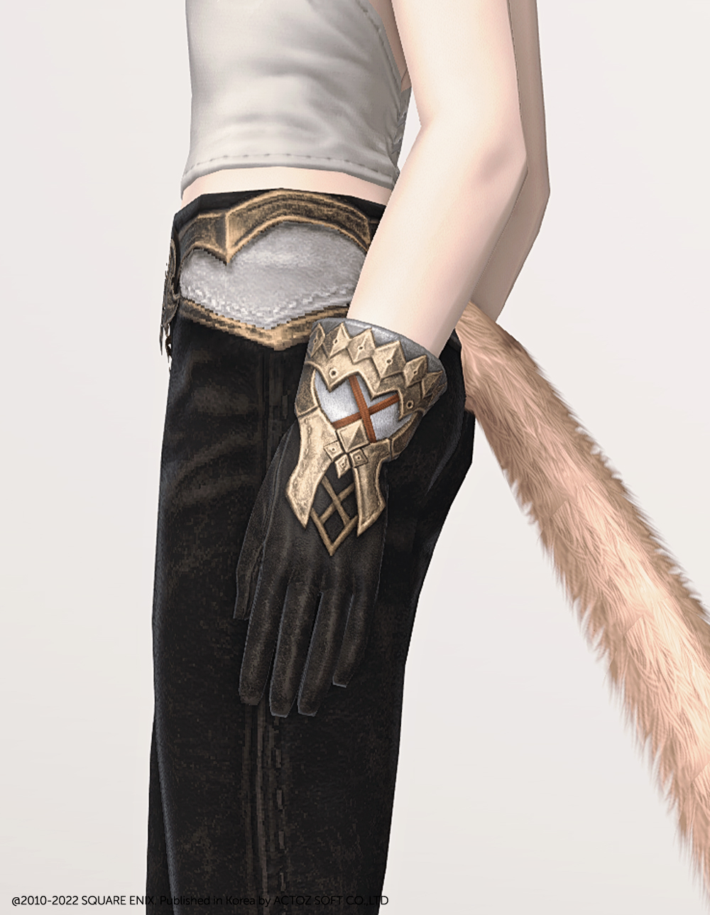 사용감이 느껴지는 가죽 장갑 위로 세공한 금속판을 덧대어 손목을 보호해 줍니다. 단순히 보호에서 그치지 않고 장식요소로 활용하여 고급스러운 분위기까지 자아내며, 가죽 파츠와 금속 파츠 중 어느 쪽이어도 코디의 메인 의상과 소재를 맞춘다면 매끄럽게 녹아들어 다양하게 활용할 수 있습니다.