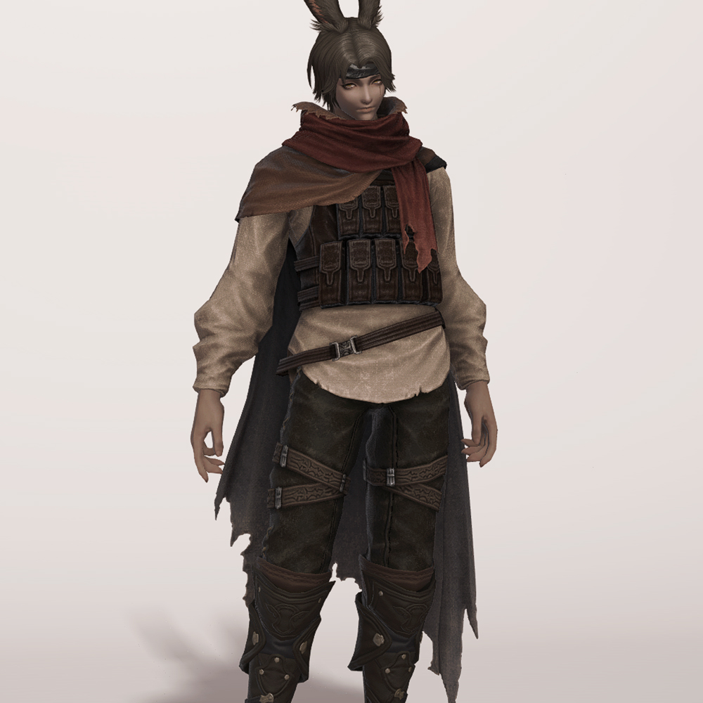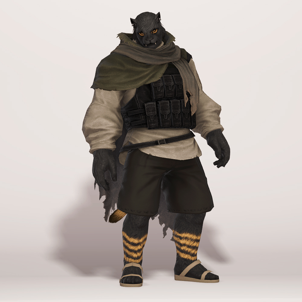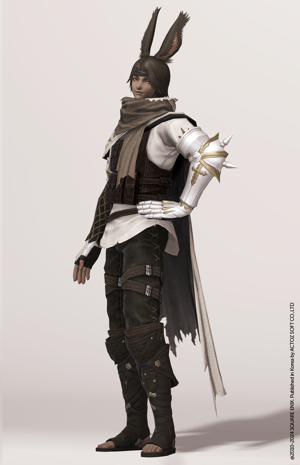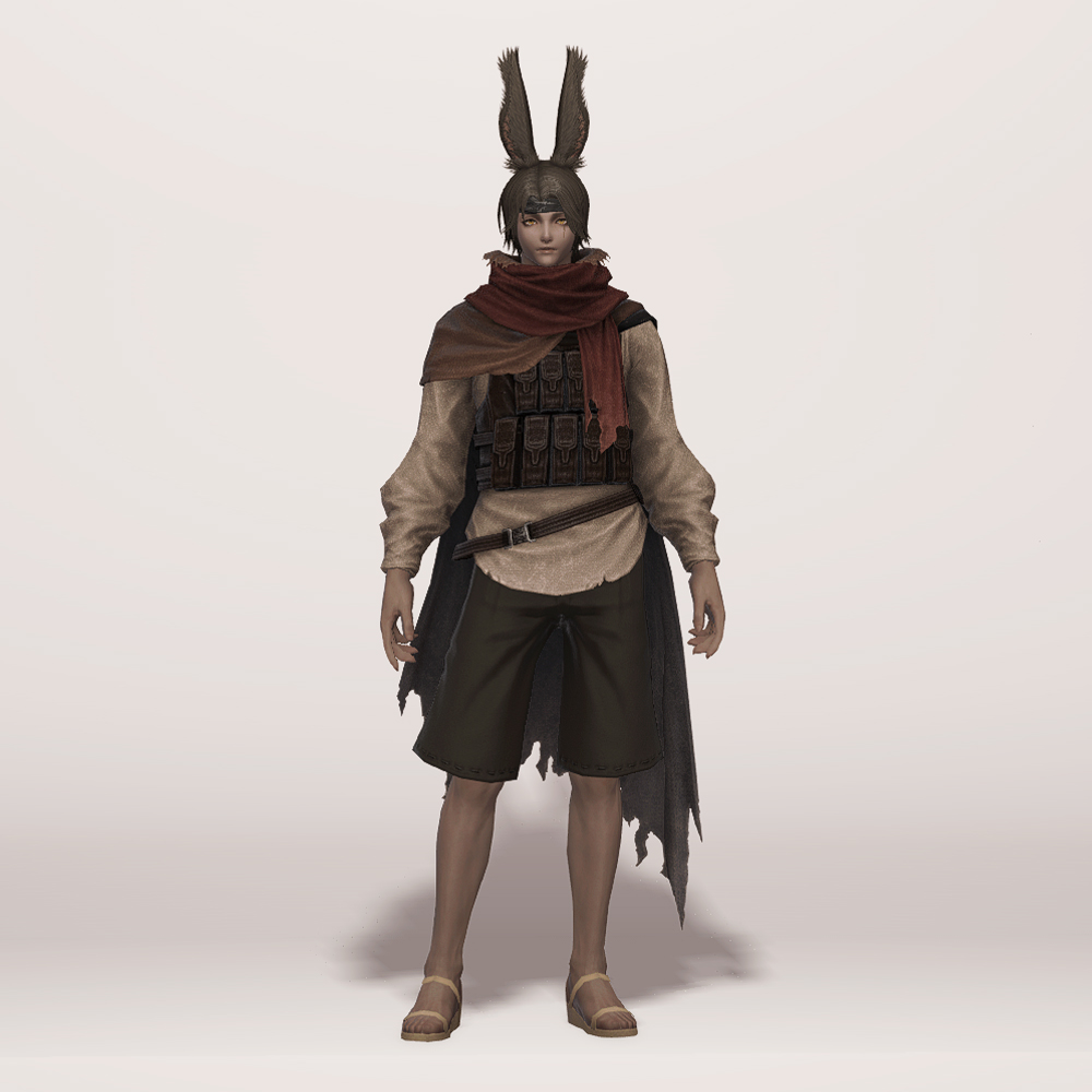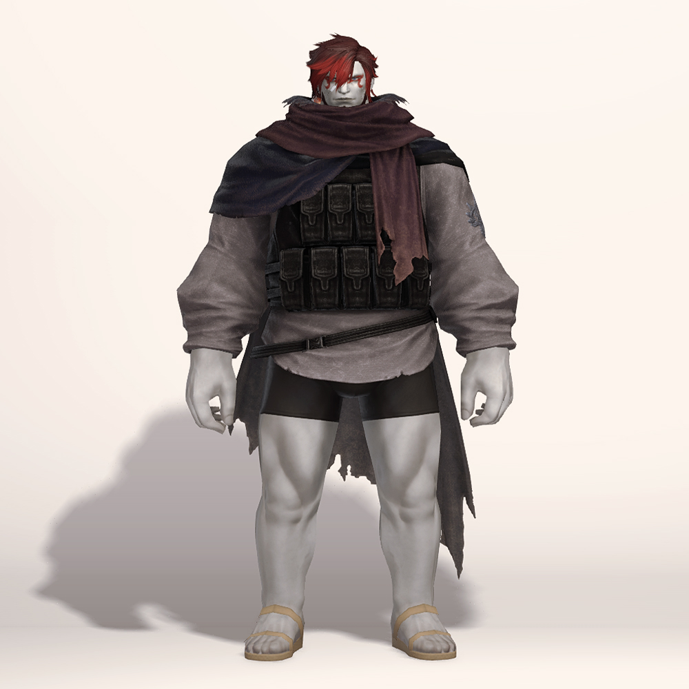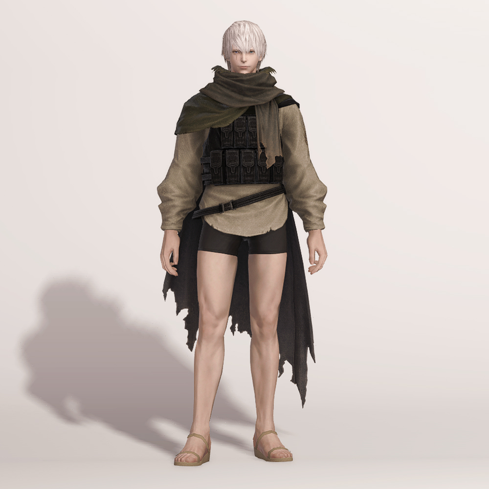 니어 오토마타 작중 구형 안드로이드가 모인 레지스탕스 캠프에서 볼 수 있는 의상입니다. 황폐해진 사막지대에서 모래를 막기위한 목도리와 망토(간지)는 필수죠. 전술조끼와 같이 주머니가 많은 점이 포인트. 전투현장에서의 경험을 표현하듯 너덜하게 해진 묘사가 전체적으로 들어가 있습니다. 목과 어깨에 두른 천 역시 그러한 묘사가 포함되었으며 이를 통해 좀 더 노련한, 전술 전문가라는 느낌을 내기에 좋습니다. 팔뚝에 요르하 마크가 부착되어 있습니다.