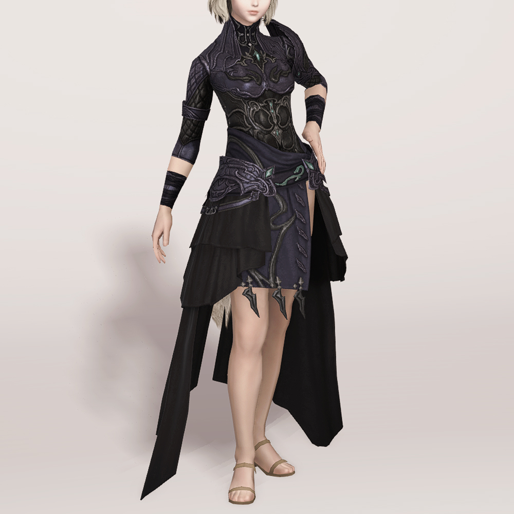 꼬리를 길게 늘어뜨려 우아한 느낌을 주는 유선형의 라인이 인상적인 갑주입니다. 여러갈래의 천을 늘어트리고 몸에 딱 붙는 갑옷의 구조로, 타 갑옷류와는 다르게 어깨의 보호구 부분과 몸통을 앞뒤로 감싸는 얇은 판금이 슬림하고 날렵한 이미지를 살립니다. 다소 심심해보일 실루엣을 커버하듯 전체적으로 흐르는 듯한 모양의 세공이 되어있습니다. 늘어트린 천에도 주름과 트임, 금속장식 등이 곁들여져 있으며, 팔꿈치 밑으로도 보호대가 한 겹 감싸져 있는 등 마무리가 확실합니다. 다른 부분의 아이템을 어떻게 매치하느냐에 따라 여러 이미지를 줄 수 있습니다.
