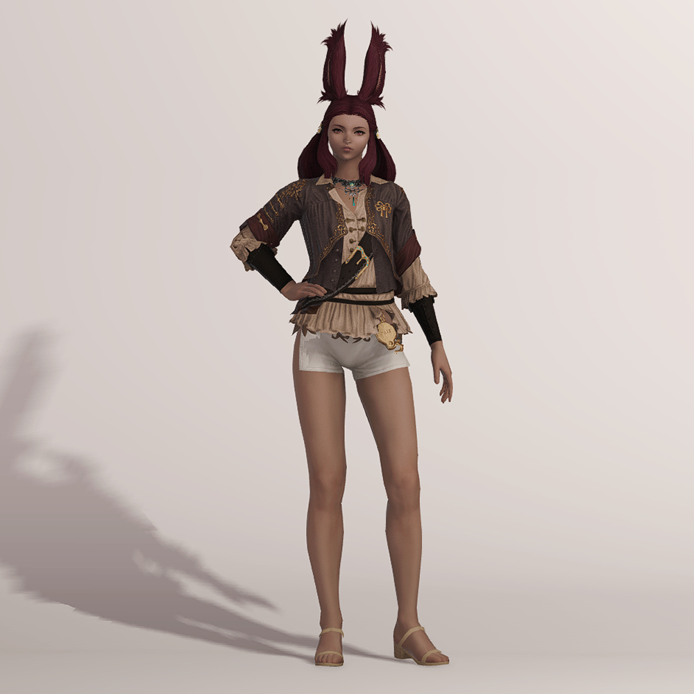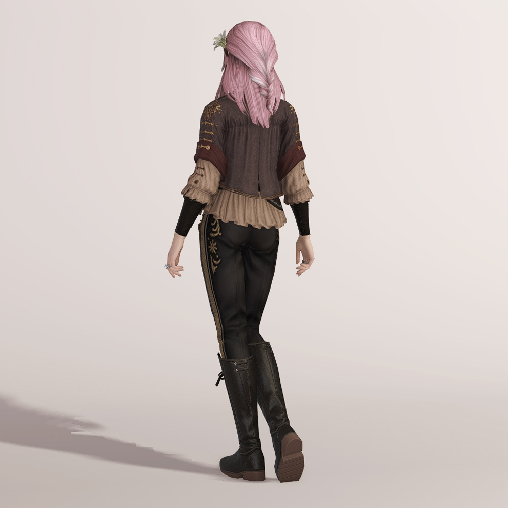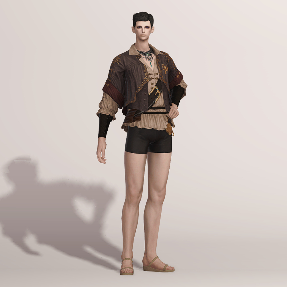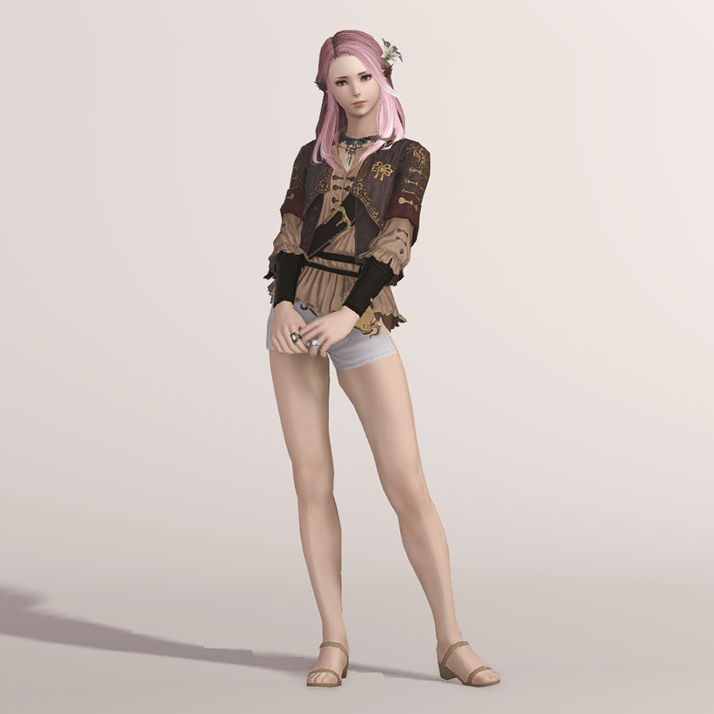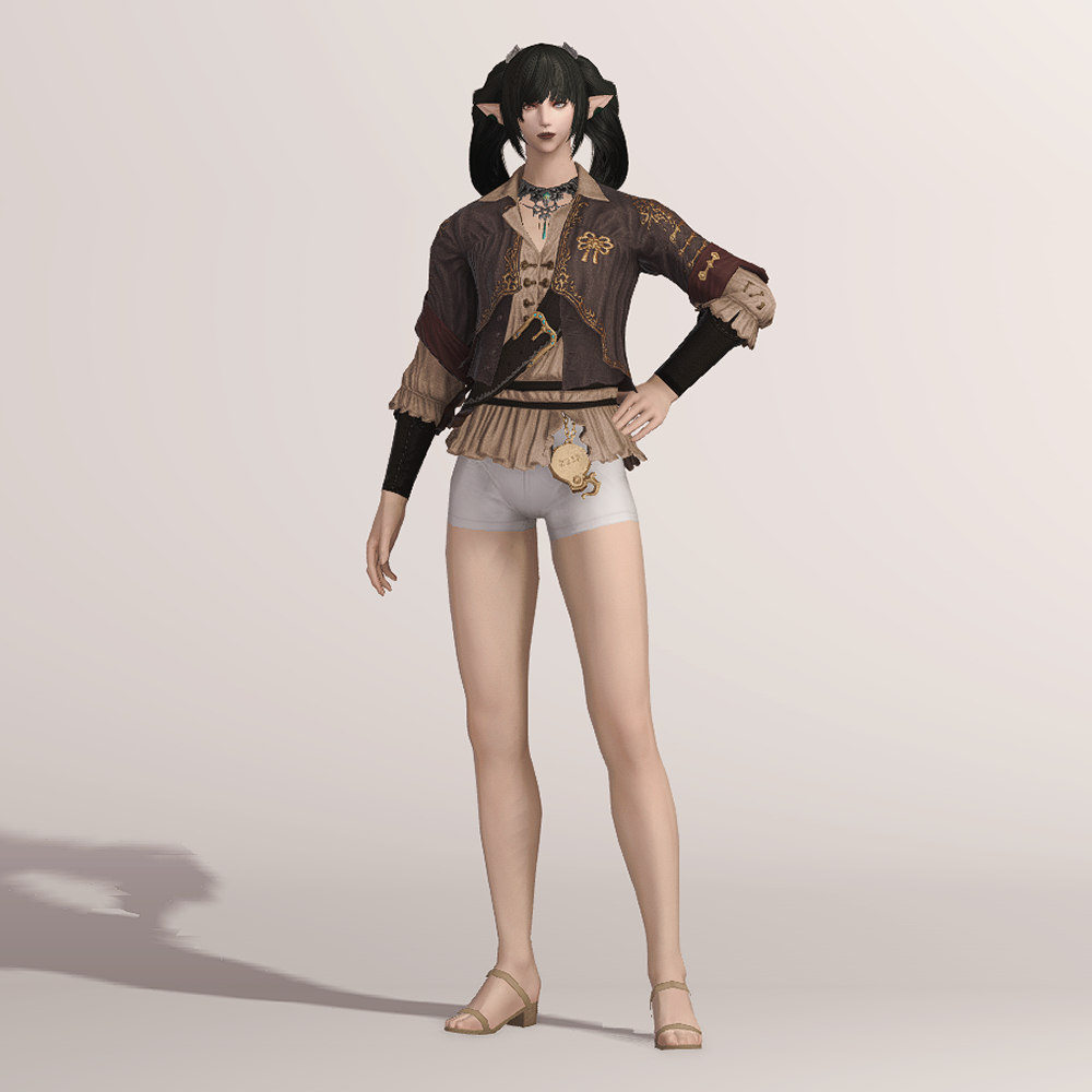 가볍고 섬세한 느낌을 살린 블라우스와 고급스러운 악세사리가 눈에 띄는 상의입니다. 칠부소매의 블라우스 위로 비슷한 재질의 조끼를 매치하였습니다. 밋밋해보이지 않게 안쪽에 맨 두꺼운 벨트도 포인트. 전체적으로 가볍고 휘날리는 이미지를 상대적으로 묵직한 금속 재질의 장식과 장신구들로 가라앉혀 조화를 이루는 동시에 양 쪽의 재질적 특성을 화려하게 선보입니다. 의상 전체에 들어간 섬세한 디테일들이 뛰어나서, 이러한 점을 극대화 할 수 있는 조합을 추천드립니다.