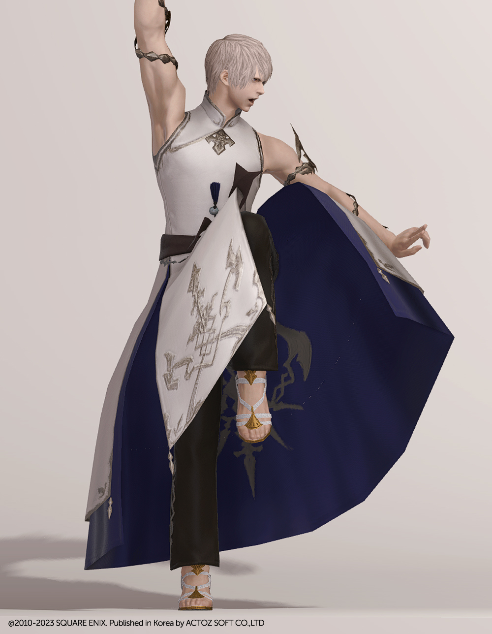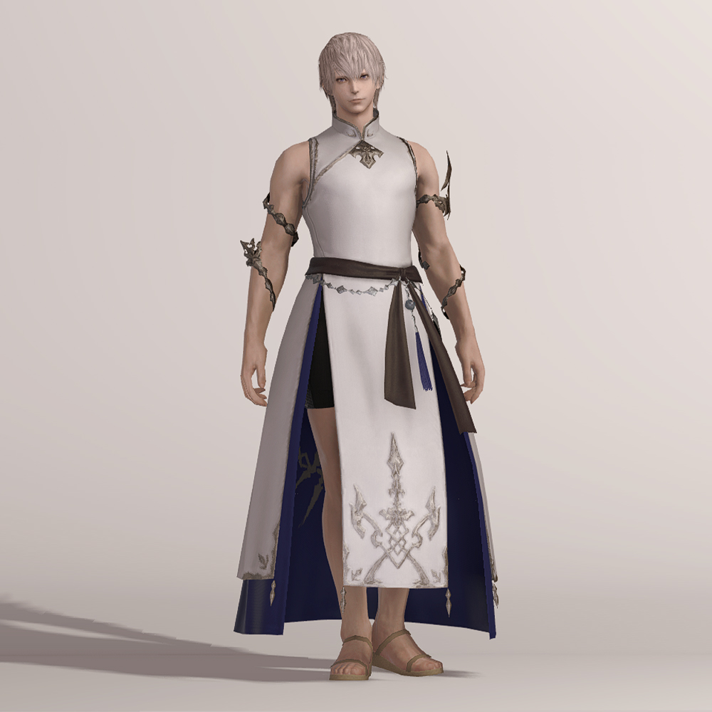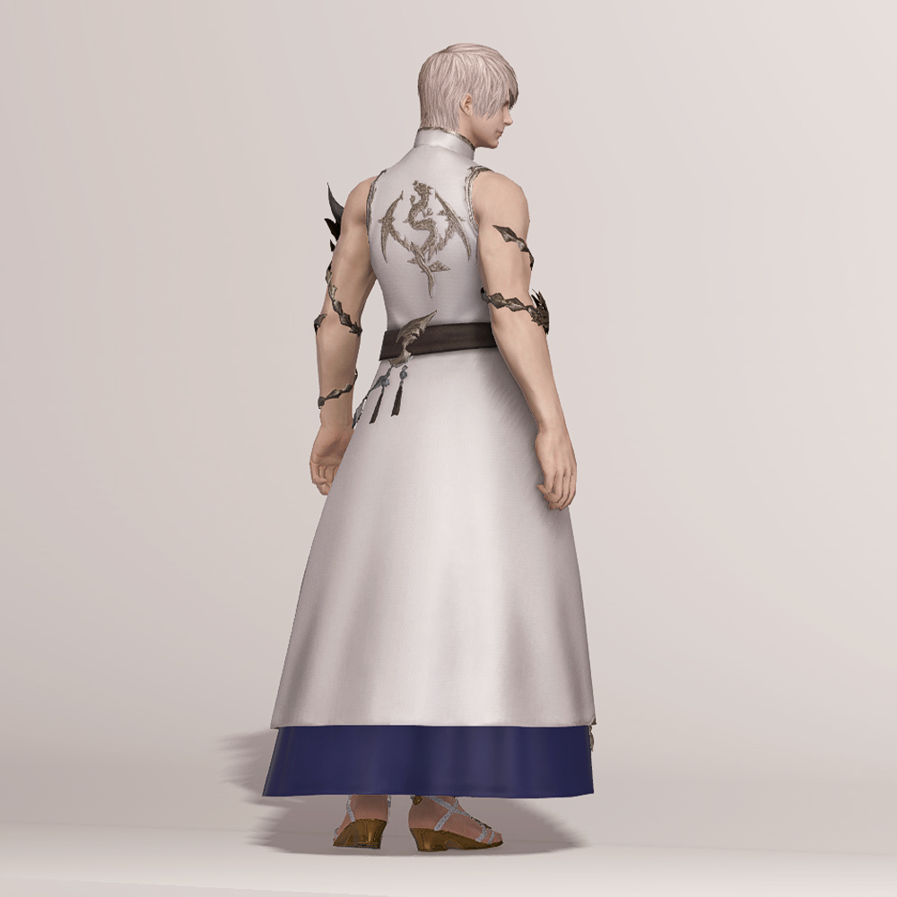 동쪽의 대륙 동방에서 직수입한 아름다운 의상, 세미치파오입니다. 목 위로 올라와 라인을 덮는 깃과 대조되는 과감한 민소매 디자인에 팔을 휘감은 용을 형상화한 장식은 착용자의 지위와 무예가 어느 정도 높은 수준인 것을 보여주는 듯 합니다. 금속 장식으로 꾸민 허리띠 밑으로 길게 늘어트린 옷자락에는 정면에 두 개의 트임을 두어 활동성을 보장해 주는 동시에 자칫 단조로울 라인에 숨통을 틔어주는 역할을 합니다. 옷 곳곳에 들어간 금색 자수에 집중하노라면 곧 머지않아 트임을 통해 언뜻 드러나는 안감에 새겨진 문양에 시선을 뺏기게 될지도 모릅니다.