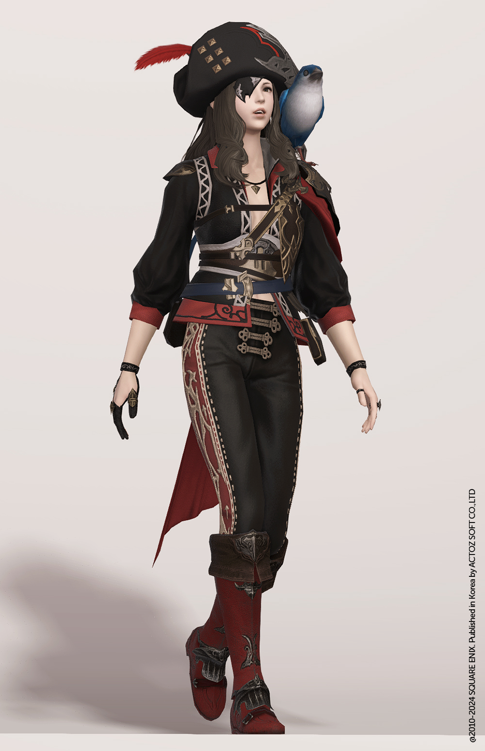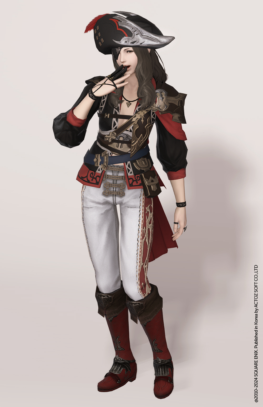 사이드에 화려한 문양으로 꽉꽉채운 타이트한 핏의 기마바지입니다. 정면엔 매듭장식, 사이드와 후면에는 화려한 장식으로 수놓아 엄청난 존재감을 뽐내는 하의로, 기존 세트에서 사용되었듯 속에입는 하의 혹은 비슷하게 화려한 상의등과 함께 매치하여 이왕 화려할거면 끝판을 보는 룩에 조합하기 좋겠습니다. 해적, 궁중악대 등의 컨셉에 추천드립니다.