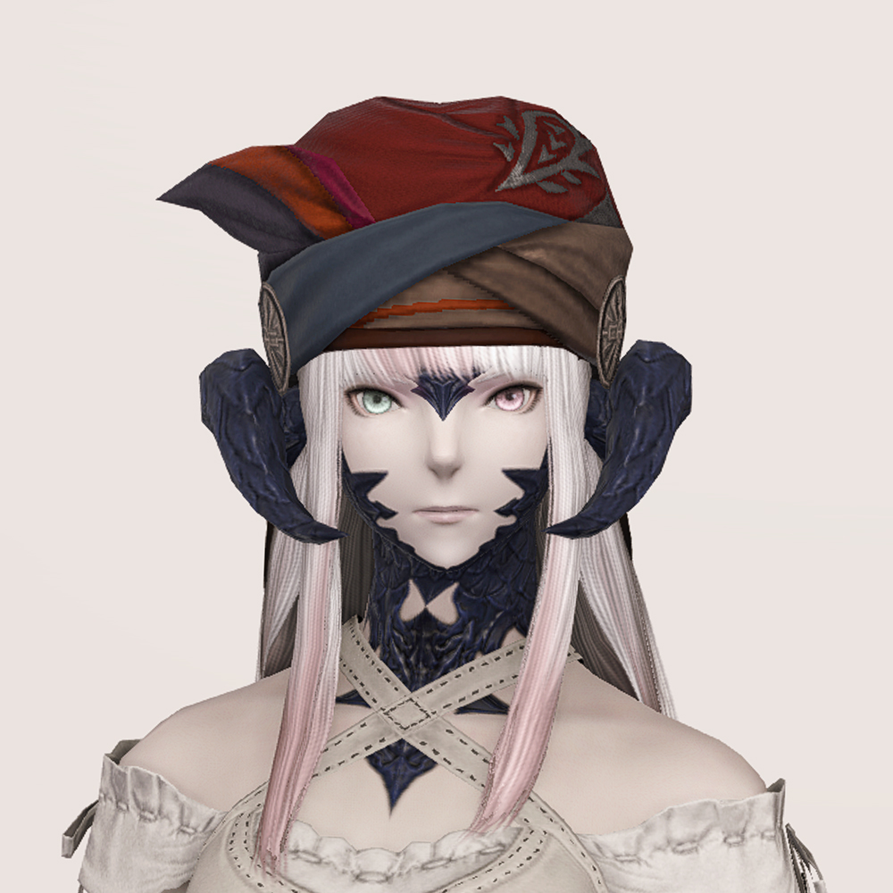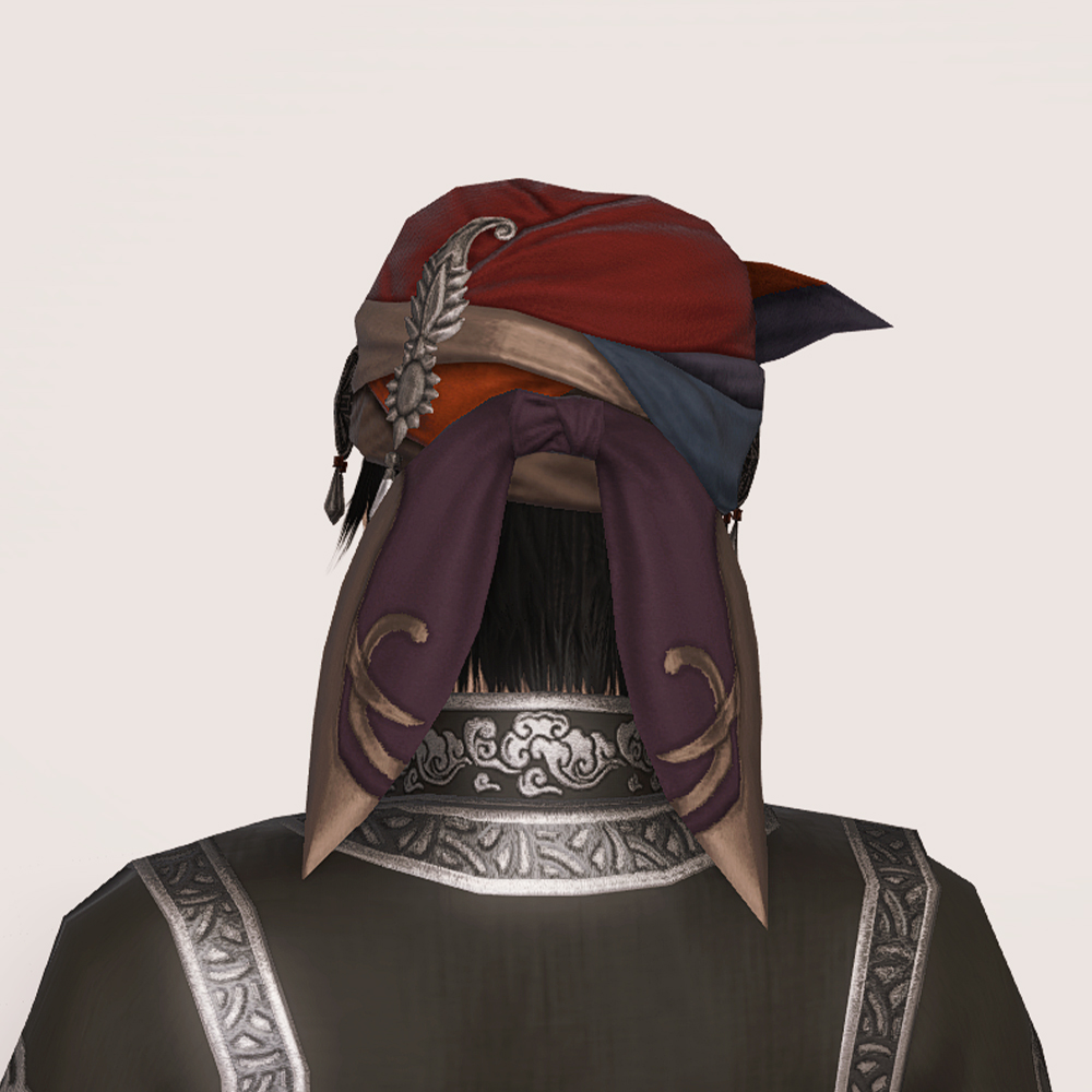 사베네어에 걸맞게 여러 색상의 천들을 겹쳐 금속과 깃털로 장식한 터번입니다. 유격대라는 사용자의 특징에 맞게 천의 색상이 좀 더 다양하게 매치되어 있고, 이마쪽을 가로지르는 끈 장식이 추가되었습니다. 뒤쪽에 매듭지어 늘어트린 끝자락엔 심플한 곡선형의 무늬를 넣어 디테일을 챙겼습니다. 금속장식은 깃털 모양으로 통일되어 유격대답게 가벼운 이미지를 주는 모습으로, 어느 방향에서 보아도 심심하지 않은 터번입니다.