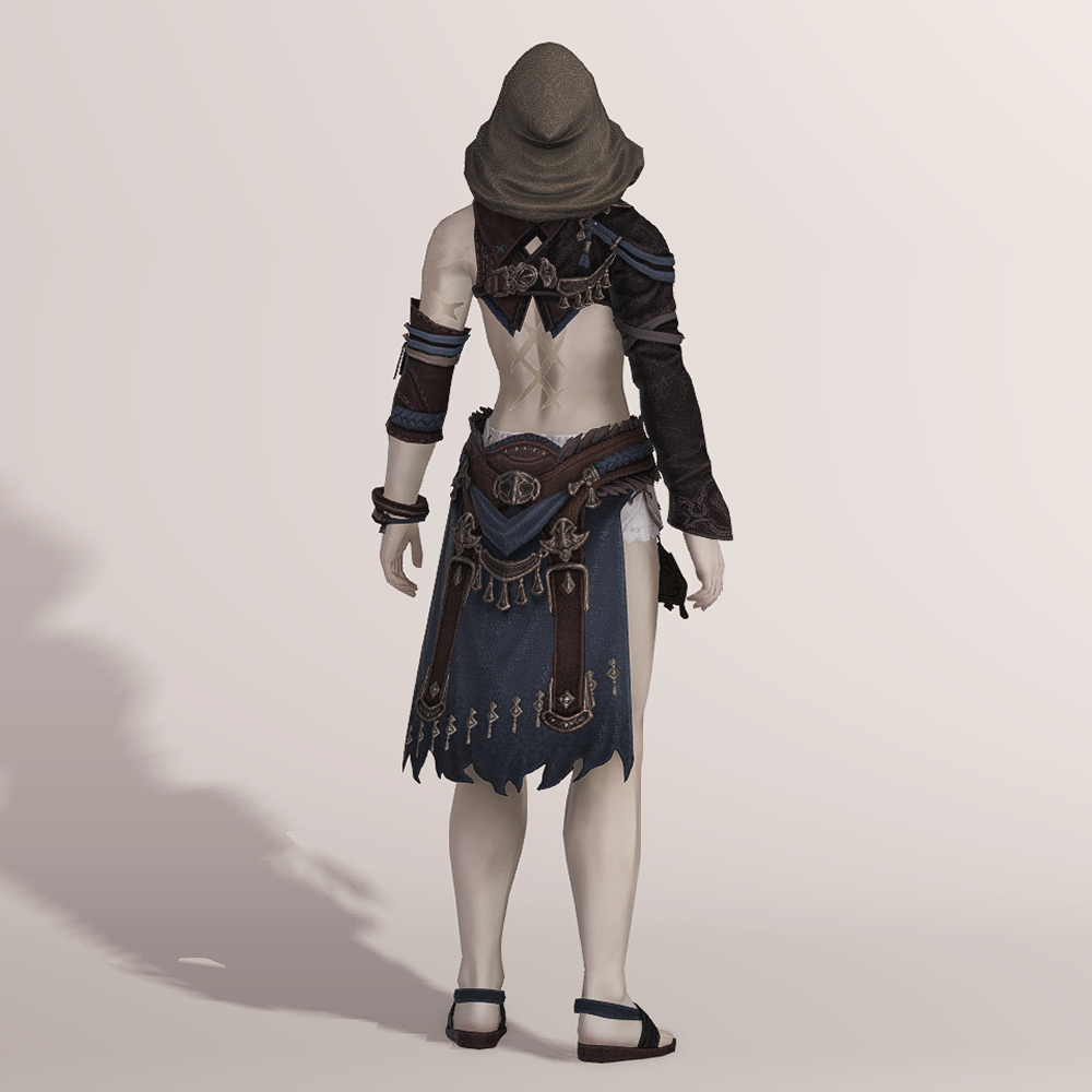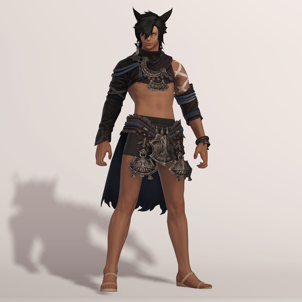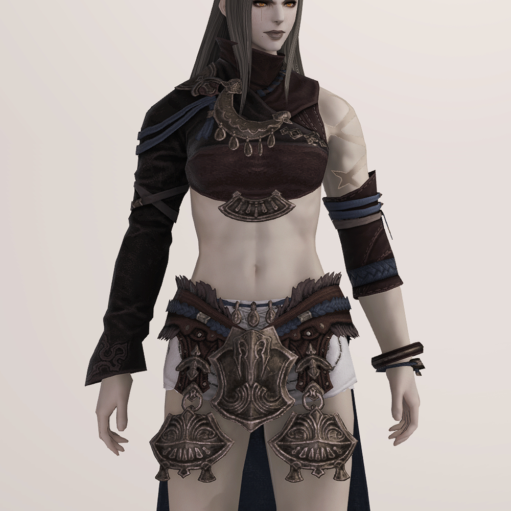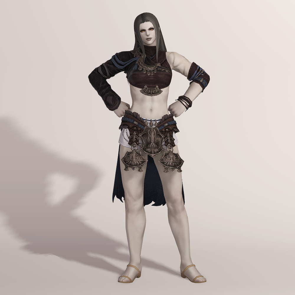 파글단의 아말쟈 족이 연상되는 의상입니다. 체온이 높은 아말쟈 족의 특성상 천의 면적을 최대한 줄였으나 에테르 흐름을 보조하기 위함인 듯 나부끼는 옷자락과 화려하게 세공된 금속판 장식이 인상적입니다. 캐릭터 기준 오른 팔은 완전히 덮혀있으나 왼쪽 팔은 관절부만 덮혀있어 언밸런스한 매력이 돋보입니다. 착용 시 드러난 왼쪽 어깨와 팔뚝, 등에 문양이 생기는데, 아말쟈족의 심볼인 전사의 불꽃 문양으로 추측됩니다. 이프리트의 불꽃을 몸에 휘감고 전장에 나선다는 느낌이 좋습니다.