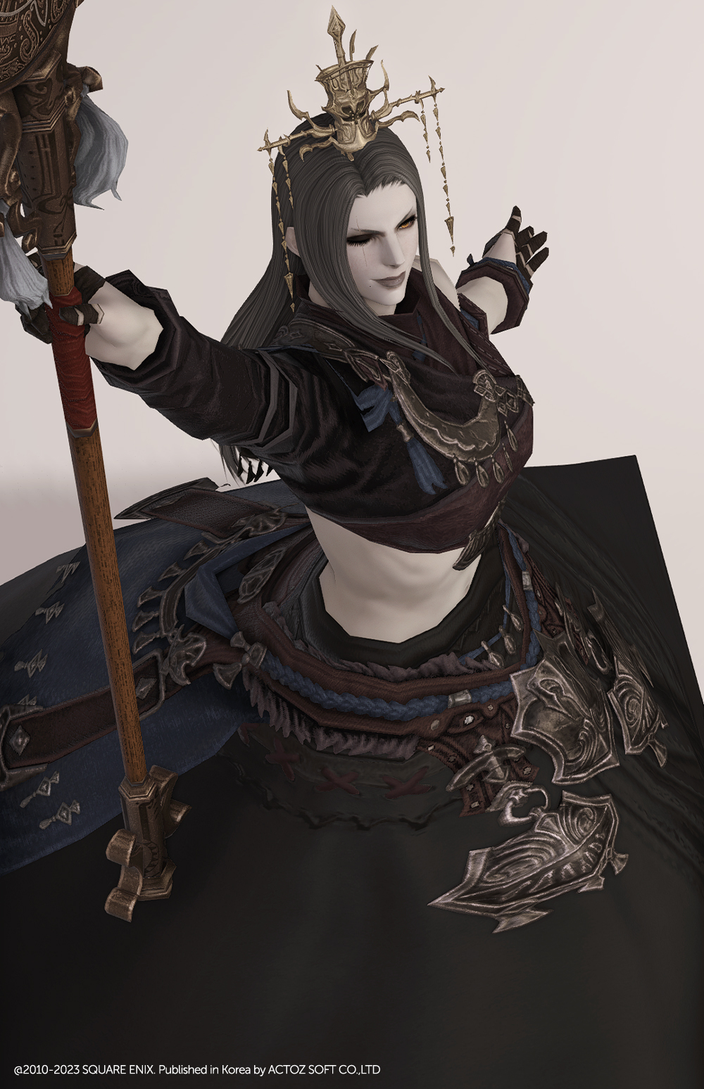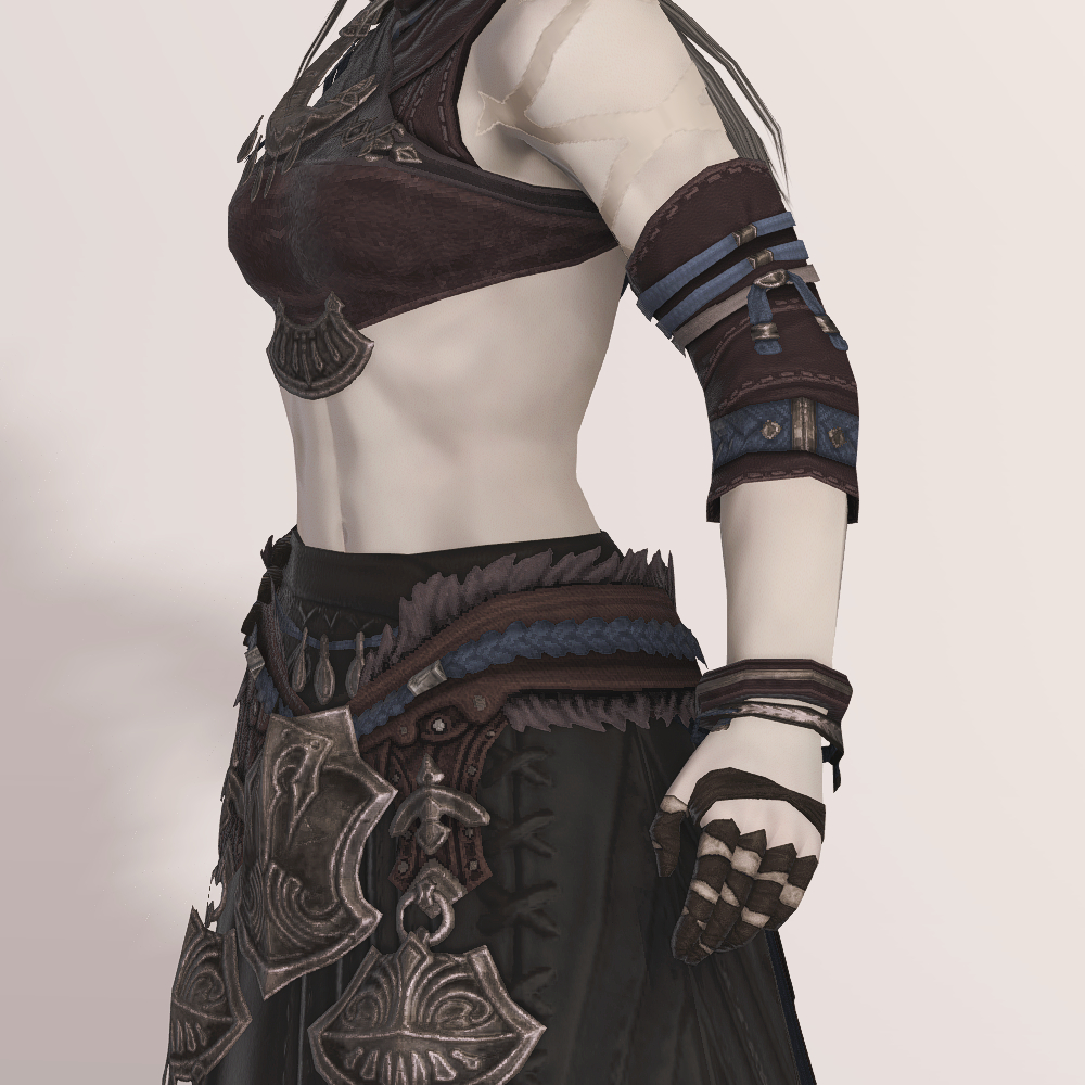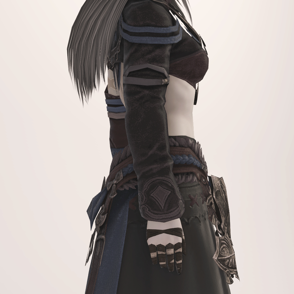 파글단의 아말쟈 족이 연상되는 의상입니다. 체온이 높은 아말쟈 족의 특성상 천의 면적을 최대한 줄였으나 에테르 흐름을 보조하기 위함인 듯 나부끼는 옷자락과 화려하게 세공된 금속판 장식이 인상적입니다. 캐릭터 기준 오른 팔은 완전히 덮혀있으나 왼쪽 팔은 관절부만 덮혀있어 언밸런스한 매력이 돋보입니다. 착용 시 드러난 왼쪽 어깨와 팔뚝, 등에 문양이 생기는데, 아말쟈족의 심볼인 전사의 불꽃 문양으로 추측됩니다. 이프리트의 불꽃을 몸에 휘감고 전장에 나선다는 느낌이 좋습니다.