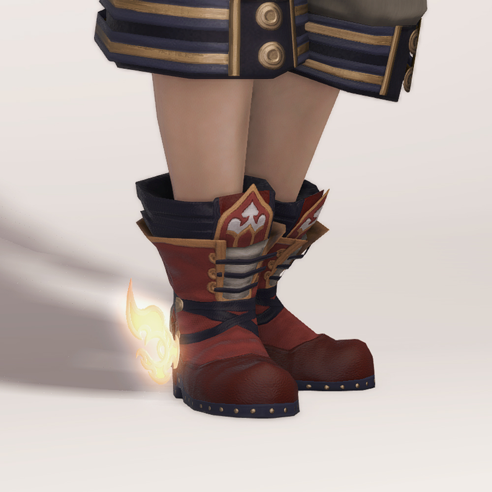 중국 신화에 등장하는 신, 나타를 모티브로 만들어진 의상 세트에 속한 신발입니다. 불과 연관이 깊기 때문인지, 붉은색을 메인으로 한 반장화에 흰색과 금색으로 서브 색상을 잡아 정리한 디자인이 활동성을 살려줍니다. 풍화륜을 연상시키는 장식을 작게 신발 바깥쪽에 배치함으로써 나타의 컨셉을 살린 점이 돋보입니다.