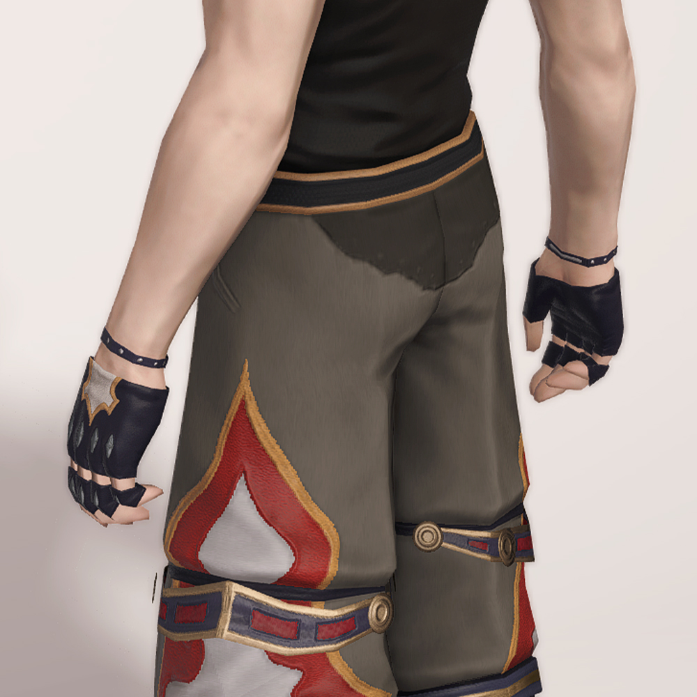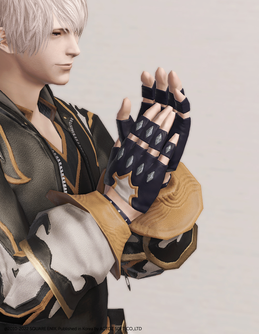 중국 신화에 등장하는 신, 나타를 모티브로 만들어진 의상 세트에 속한 장갑입니다. 팔찌와 반장갑, 손가락 테이핑의 조합으로, 손등의 간단한 문양과 더불어 마름모 모양의 스터드 장식이 눈에 띕니다. 전체적으로 스포티한 디자인 덕분에 활동적인 느낌을 더하고 싶은 캐주얼한 룩과 잘 어울리며, 조합에 따라 펑크한 룩에도 활용할 수 있습니다.