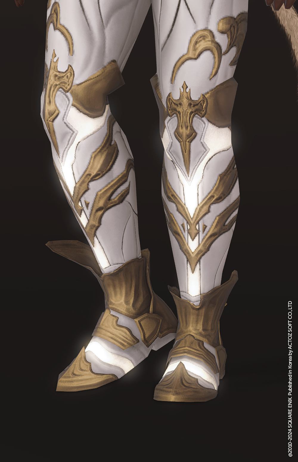 발목을 살짝 덮는 길이감의 신발입니다. 갑옷에 매치되는 것을 전제로 하여 발 끝과 발등, 뒤꿈치 등을 단단히 금속판으로 감싼 모양새입니다. 발목 바깥쪽을 감싸는 철판은 위로 길게 휘어 공격을 흘려넘기는 역할을 수행할 수 있음과 동시에 자칫 단조로울 수 있는 신발의 형태감에 포인트가 되어줍니다. 동일 시리즈와 같이, 발등을 가로로 지나는 새김에 빛나는 묘사가 들어가 있습니다.