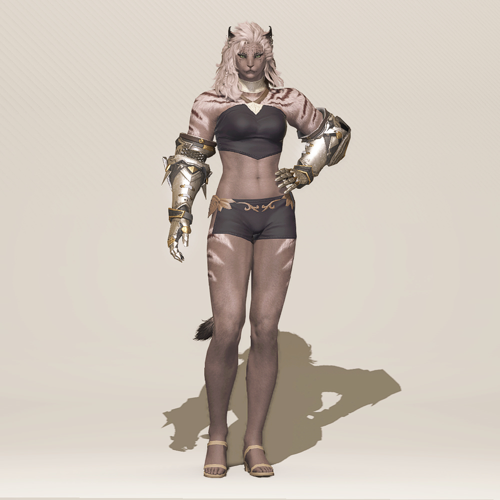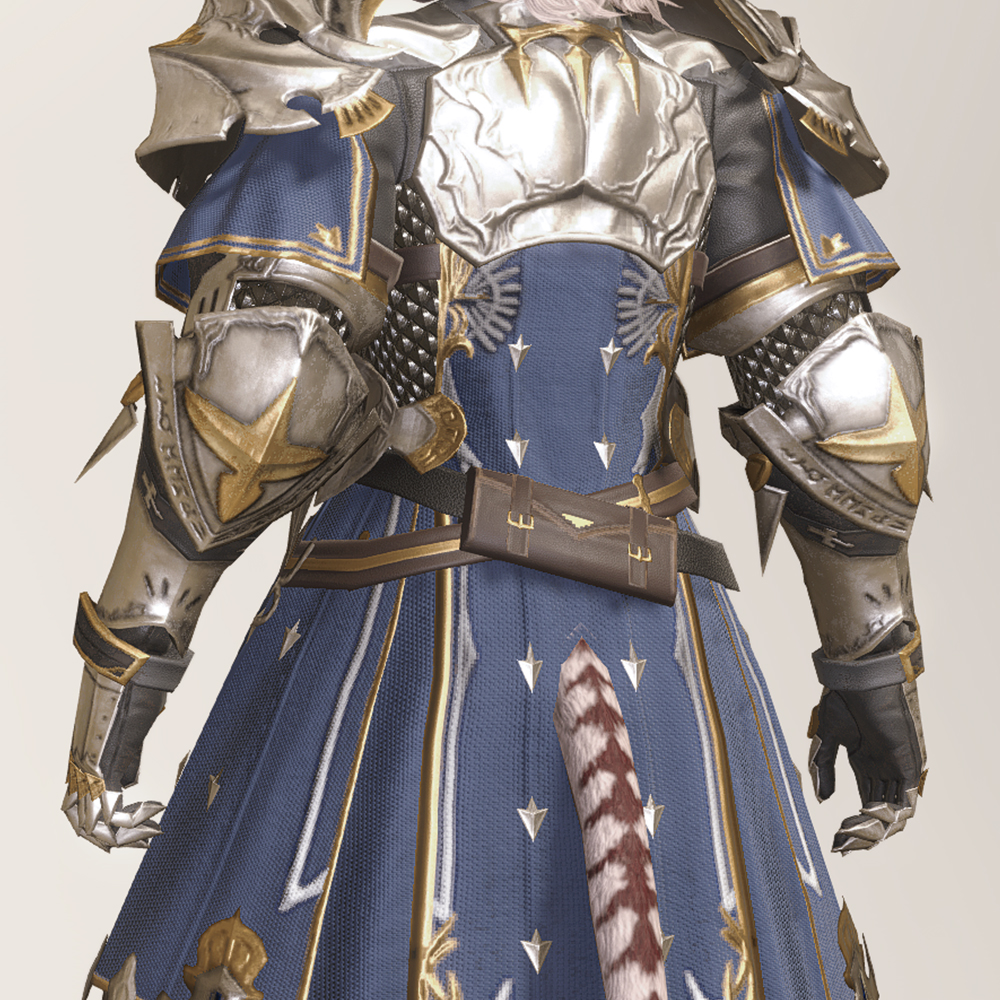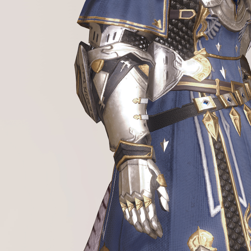 FF11의 나이트 장비이기도 한 동명의 의상 세트를 오마쥬 한 것으로 보이는 건틀렛입니다. 다른 세트들에 뒤쳐지지 않는 디테일을 자랑합니다. 한손검을 쓰는 만큼 섬세한 기동성을 확보할 수 있도록 각 관절부에 절개를 넣고, 관절의 움직임에 따라 각기 따라 움직이는 부품들을 섬세하게 구현한 점이 아름답습니다. 물론 큰 관절을 보호하기 위한 쿠터(팔꿈치 보호대)와 손목보호대 역시 구현되었으며, 그들이 뿜어내는 어떠한 심미성도 매력포인트. 화려하면서도 든든한 수호자의 팔을 보여주고 싶다면 적극적으로 매치를 검토해 볼 장비입니다.